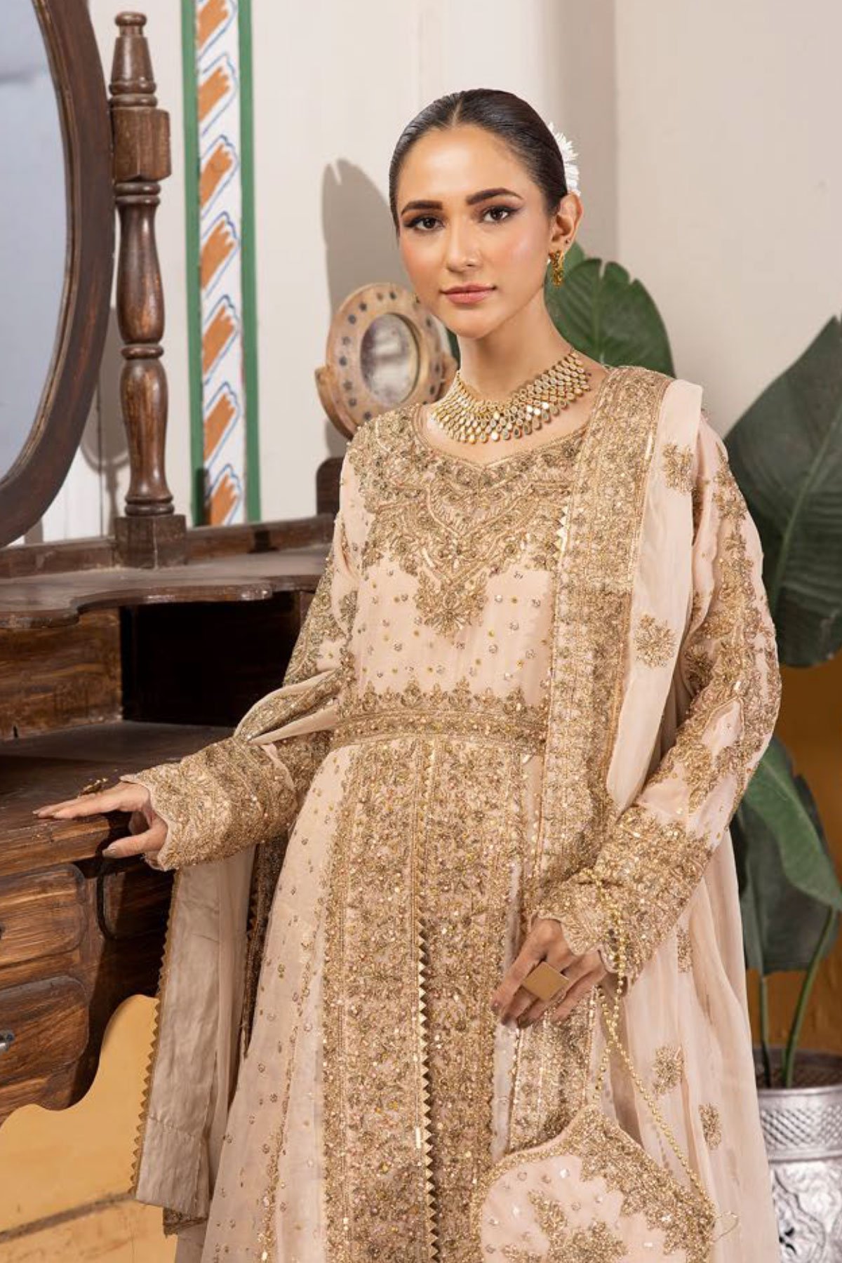 This beautiful 3 piece Alamzeb collection features a chiffon maxi gown with luxury thread work embroidery along with scattered diamantés , finished with a double layered border and full length embroidered sleeves. It comes with straight leg trousers and the look is finished with a chiffon dupatta. An embroidered belt is also included to enhance the waist along with a potli bag.