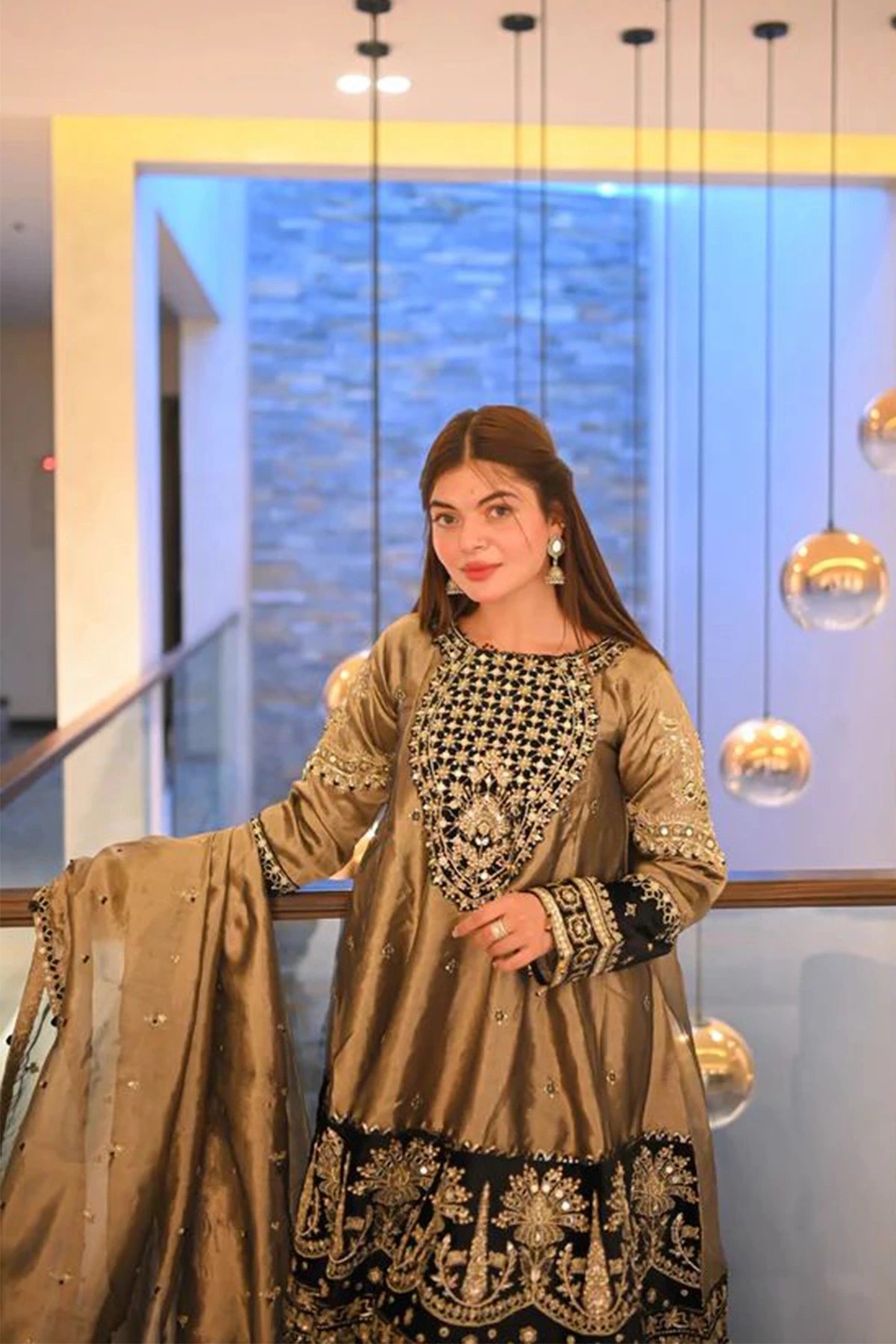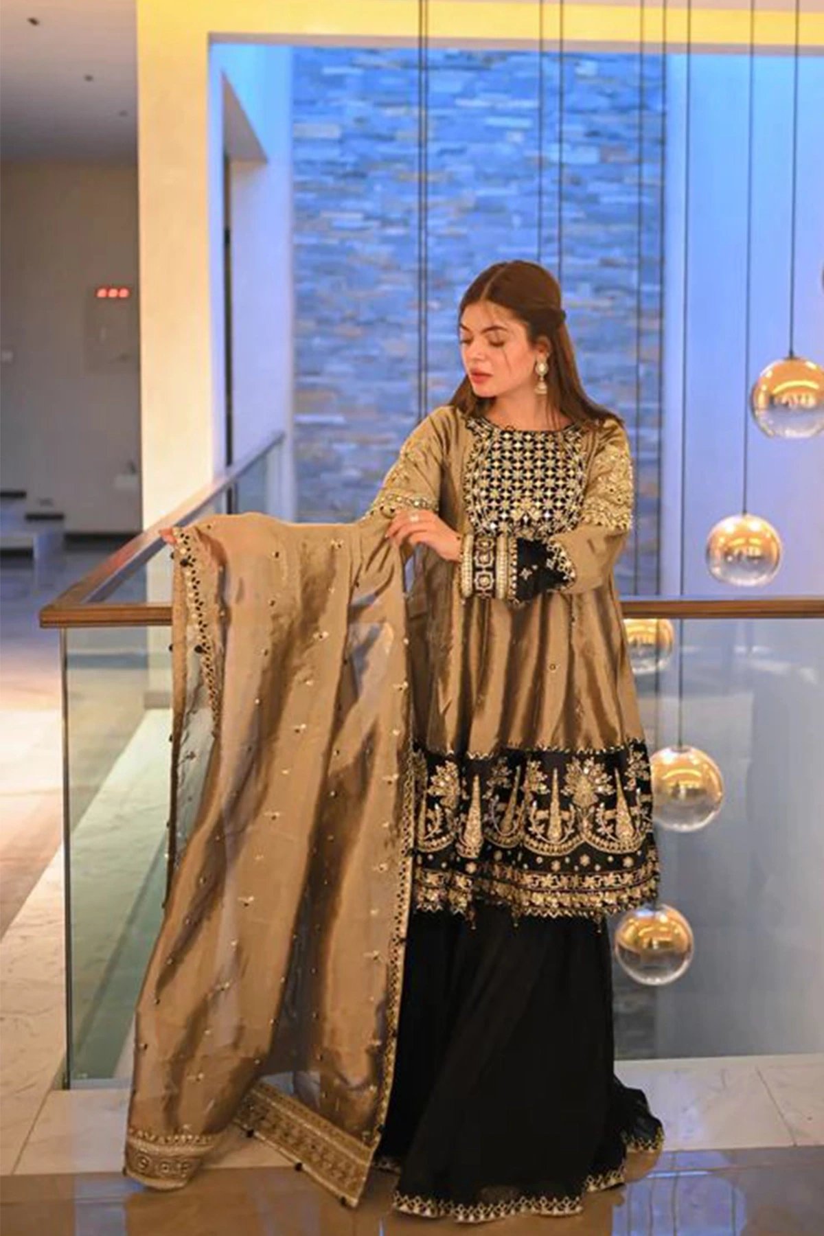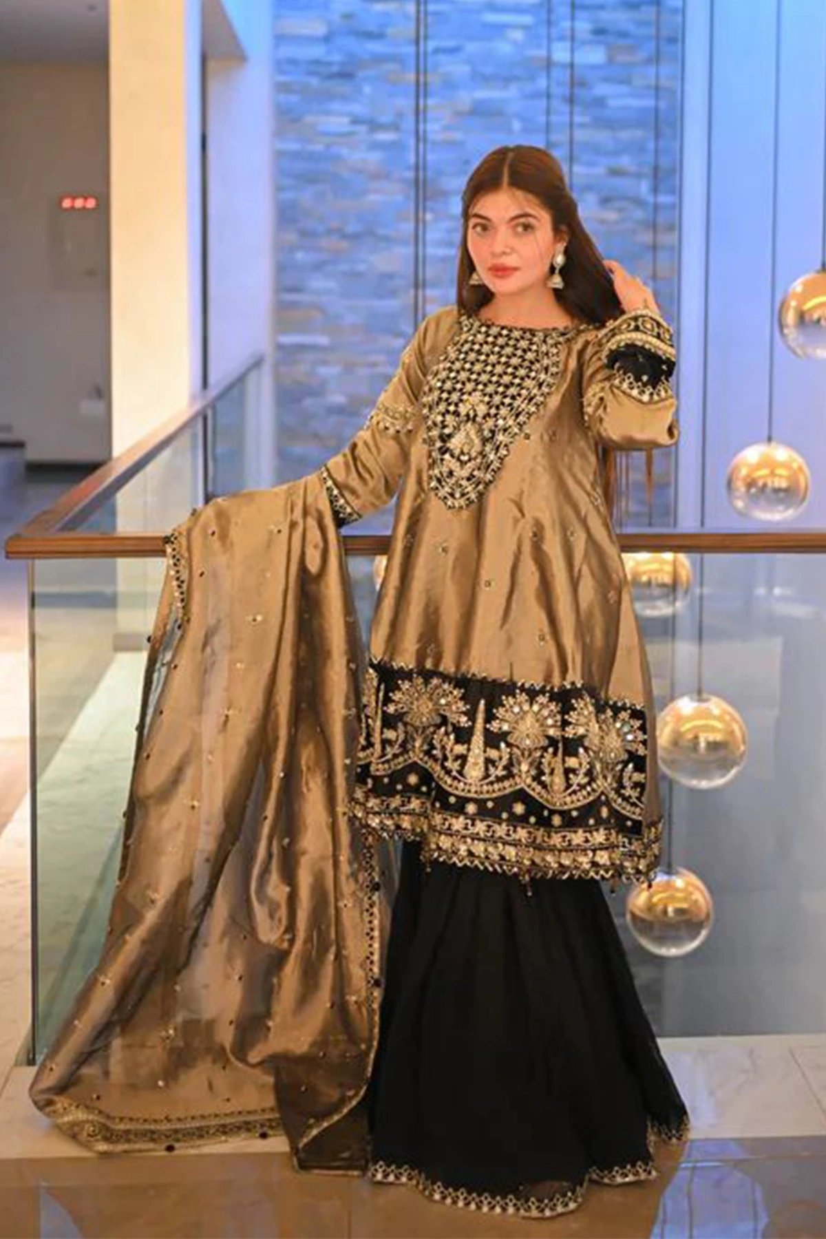 This beautiful 3 piece ensemble brings together timeless craftsmanship and modern sophistication. The peplum dress features intricate black and gold embroidery along the neckline, sleeves, and hem, creating a rich, regal aesthetic. Its warm, earthy tone pairs beautifully with the flowing black sharara pants, finished with matching gold embroidery for a cohesive, elevated look. The look is finished with a raw silk dupatta.