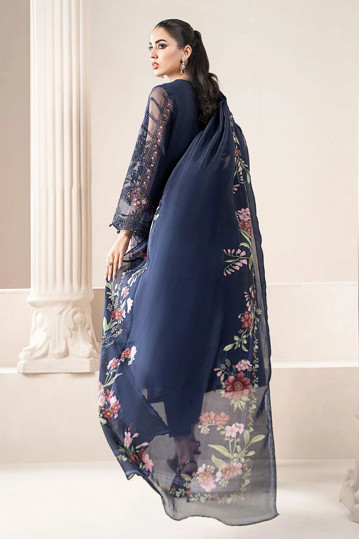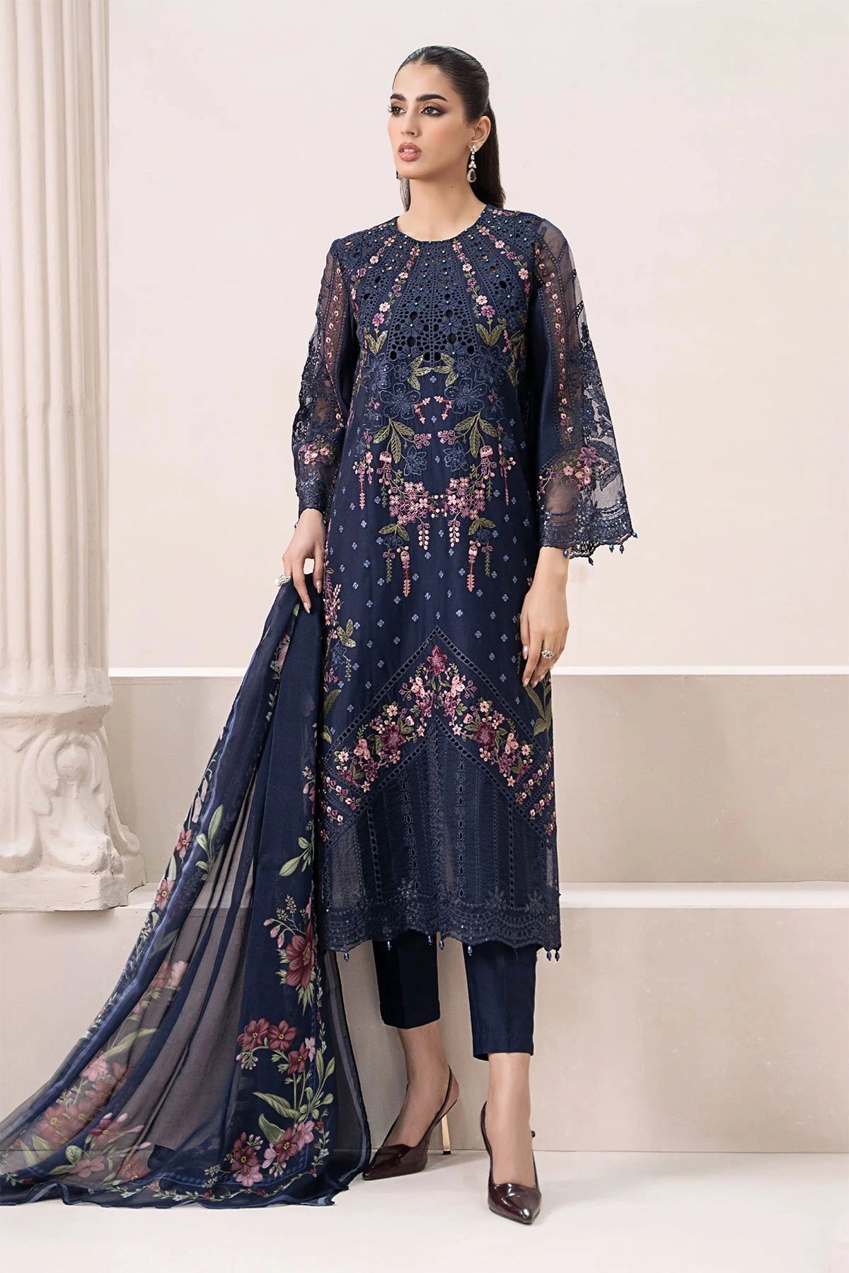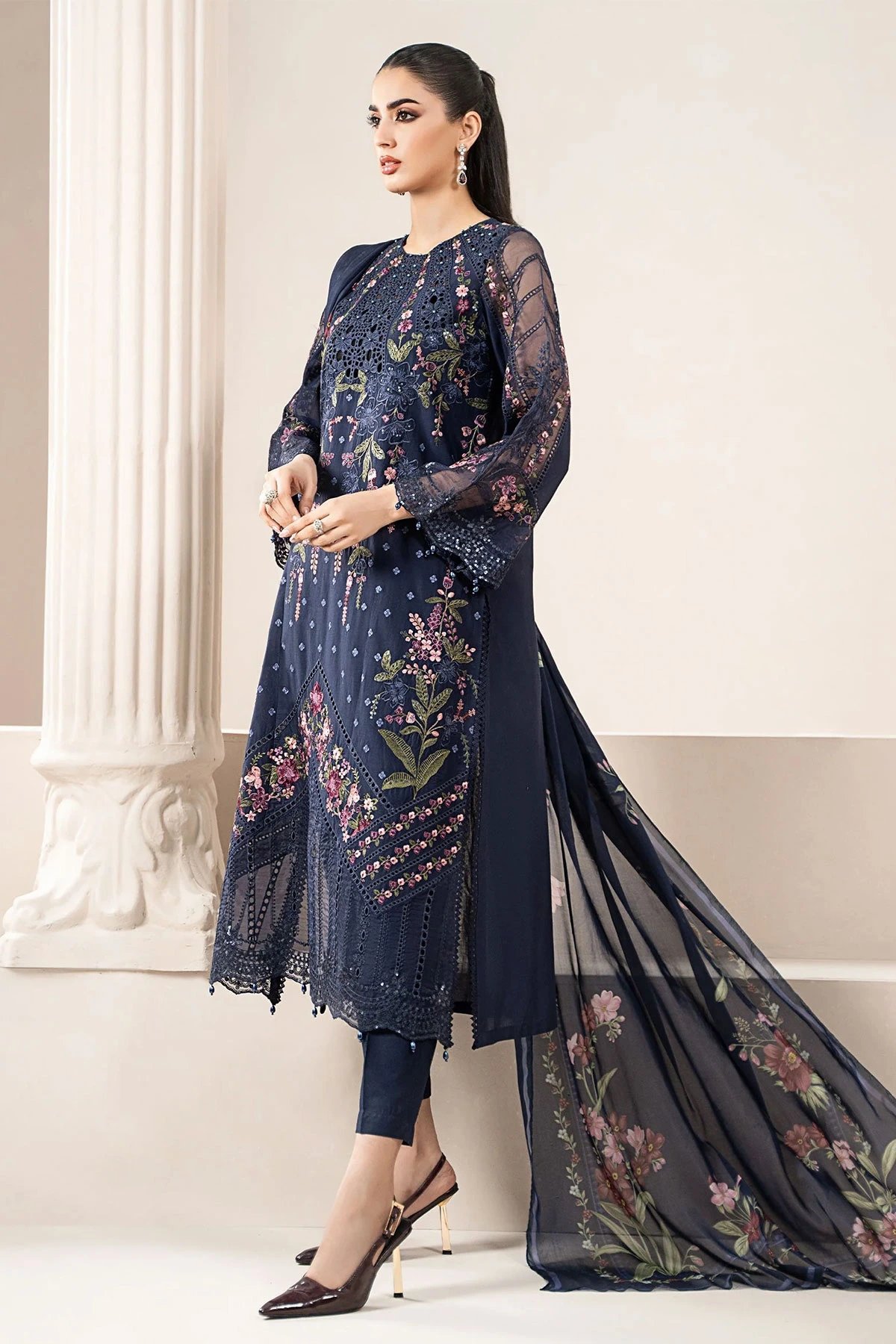This beautiful 3 piece Maria b inspired suit features a straight shirt with luxury thread work embroidery throughout with pearl embellishments on the front, finished with full length embroidered sleeves. Paired with straight leg viscose trousers and the look is finished with a chiffon digital printed dupatta. Note: Above catalogue pictures are for design reference only, embellishments and stitching may vary.