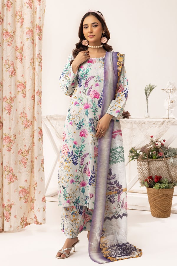 This beautiful aleena lux collection ensembles khaddar printed straight shirt with bead embellished neckline, finished with full length sleeves. Paired with printed trousers and the look is finished with cotton silk digital dupatta.