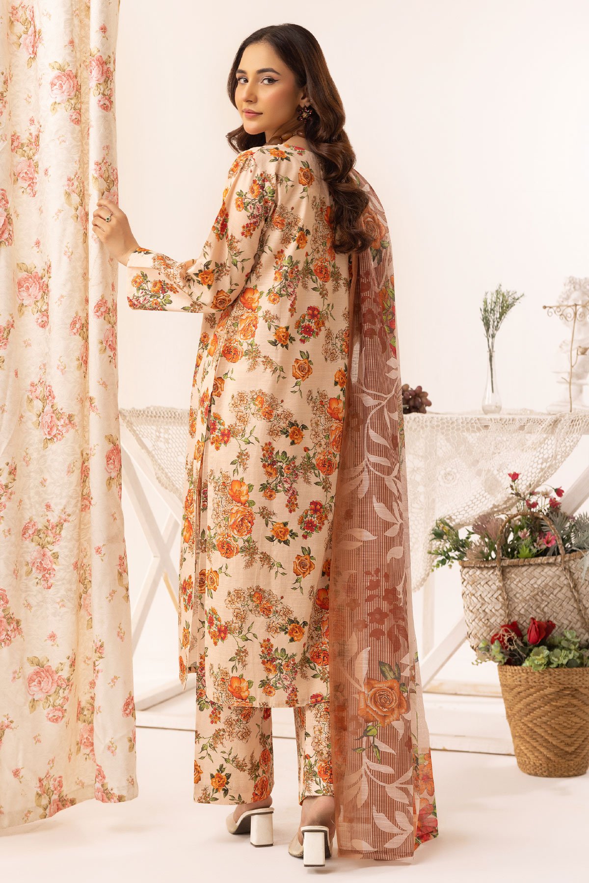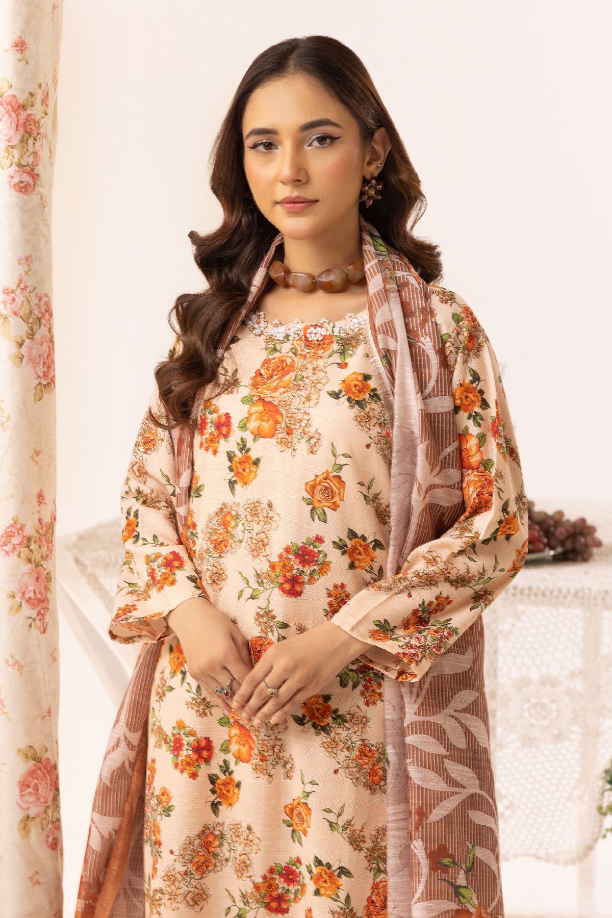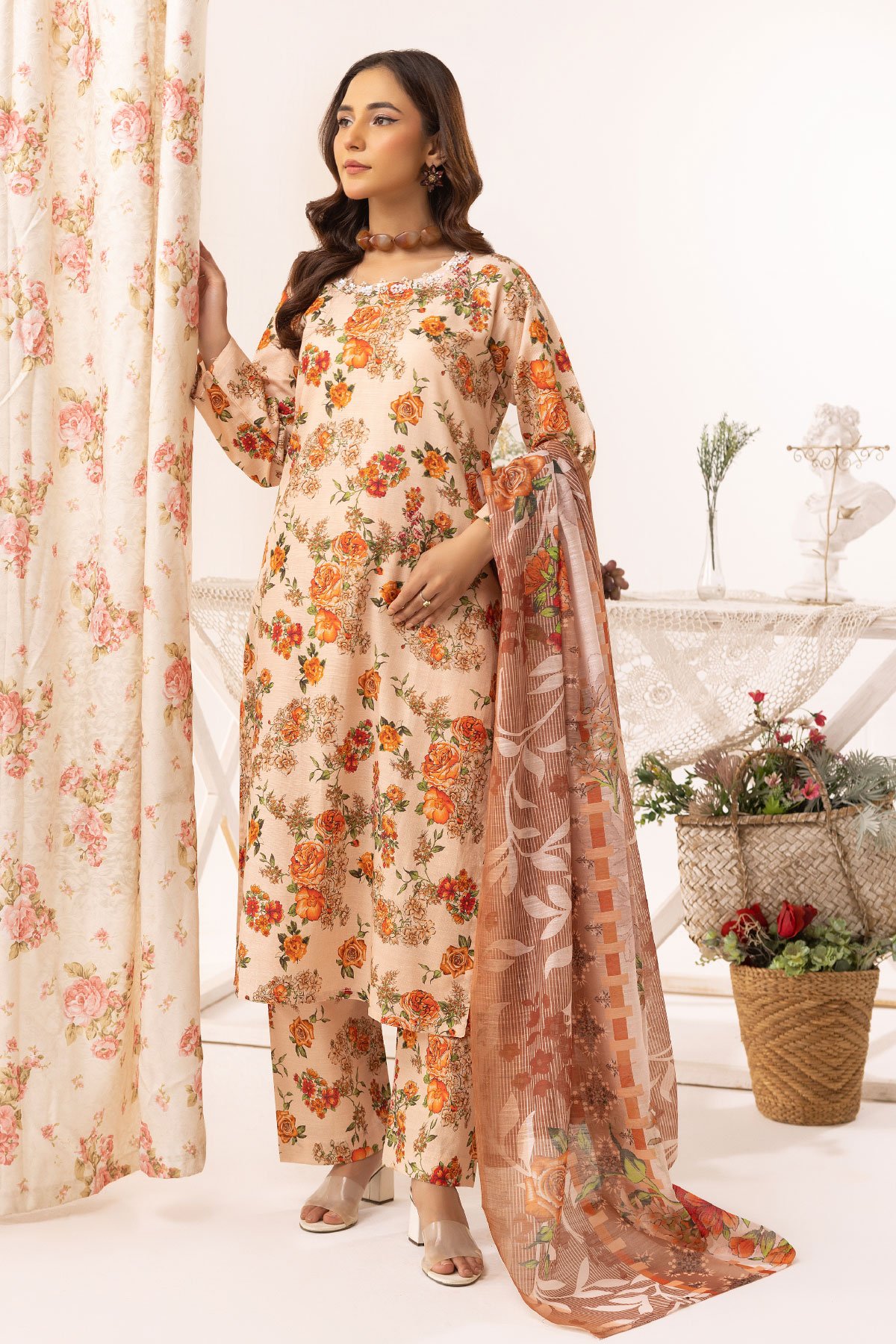 This beautiful aleena lux collection ensembles khaddar printed straight shirt with bead embellished neckline, finished with full length sleeves. Paired with printed trousers and the look is finished with cotton silk digital dupatta.