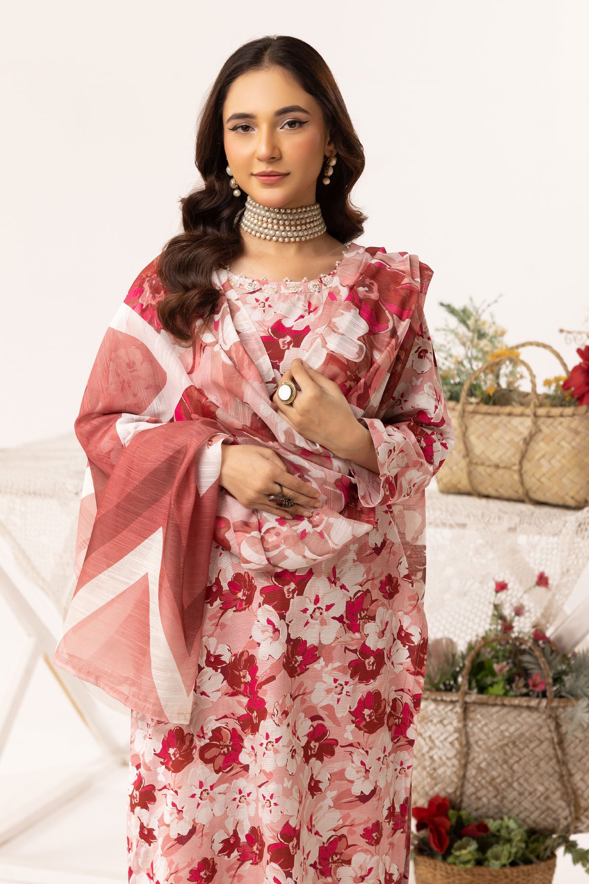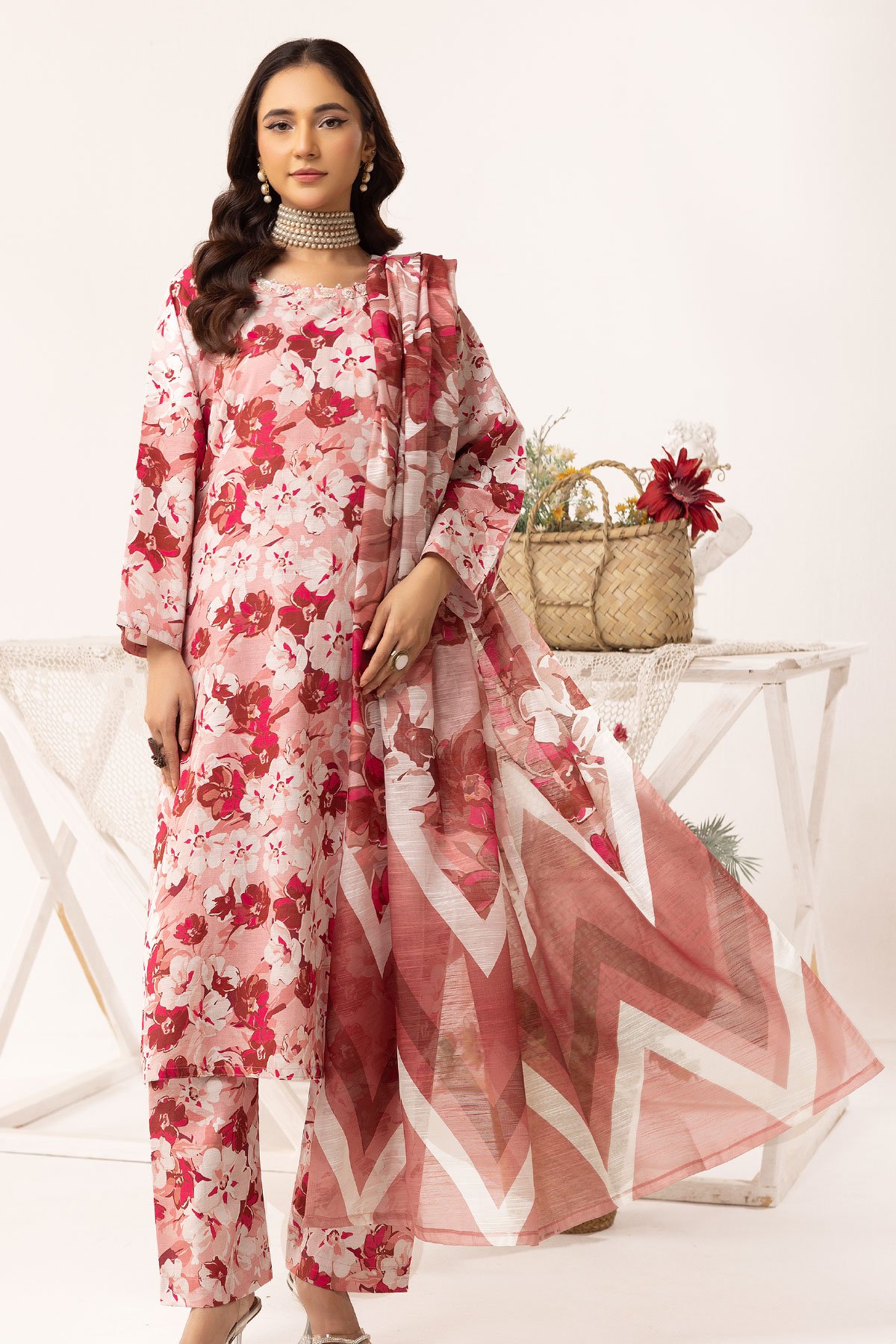 This beautiful aleena lux collection ensembles khaddar printed straight shirt with bead embellished neckline, finished with full length sleeves. Paired with printed trousers and the look is finished with cotton silk digital dupatta.