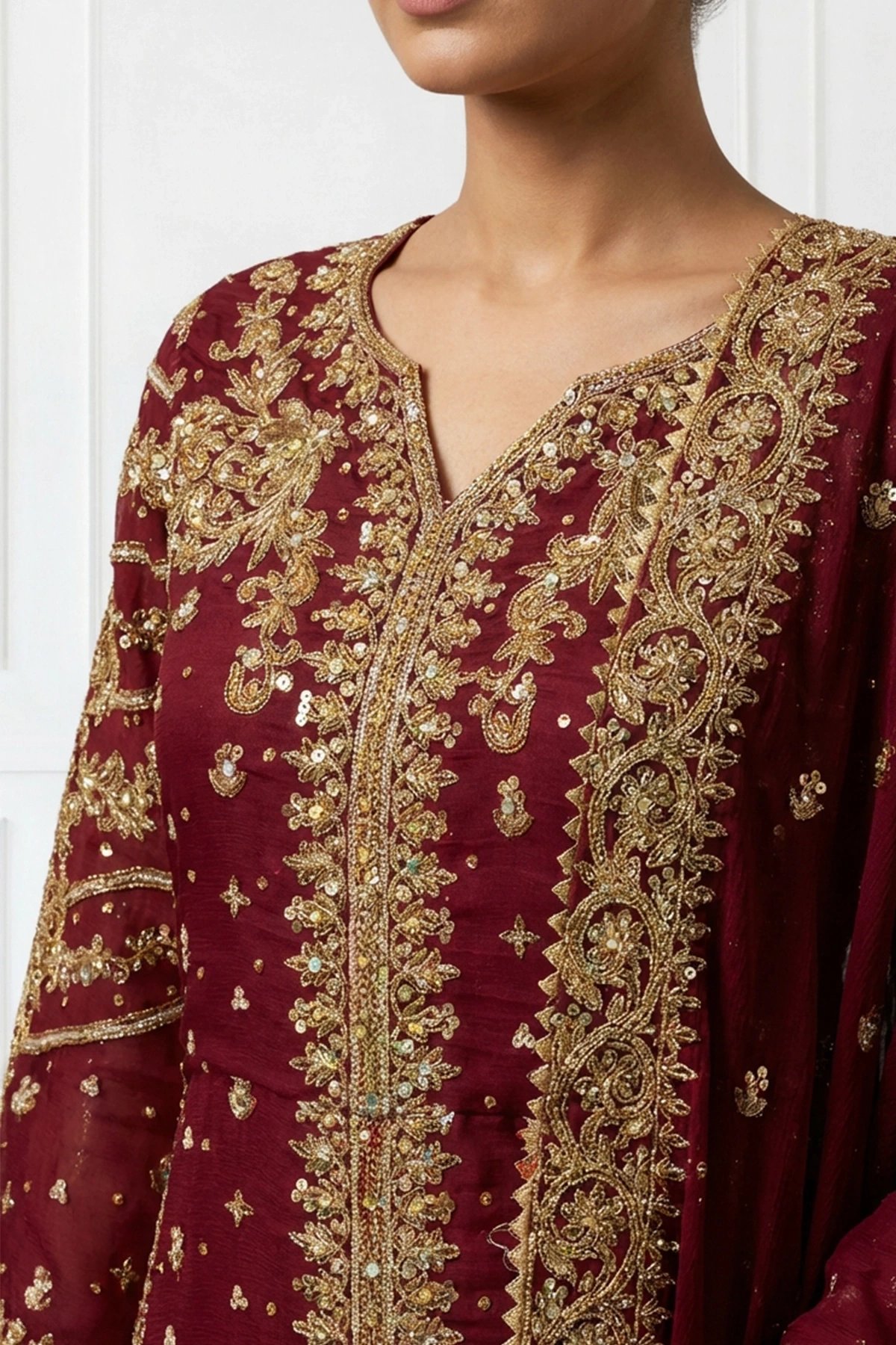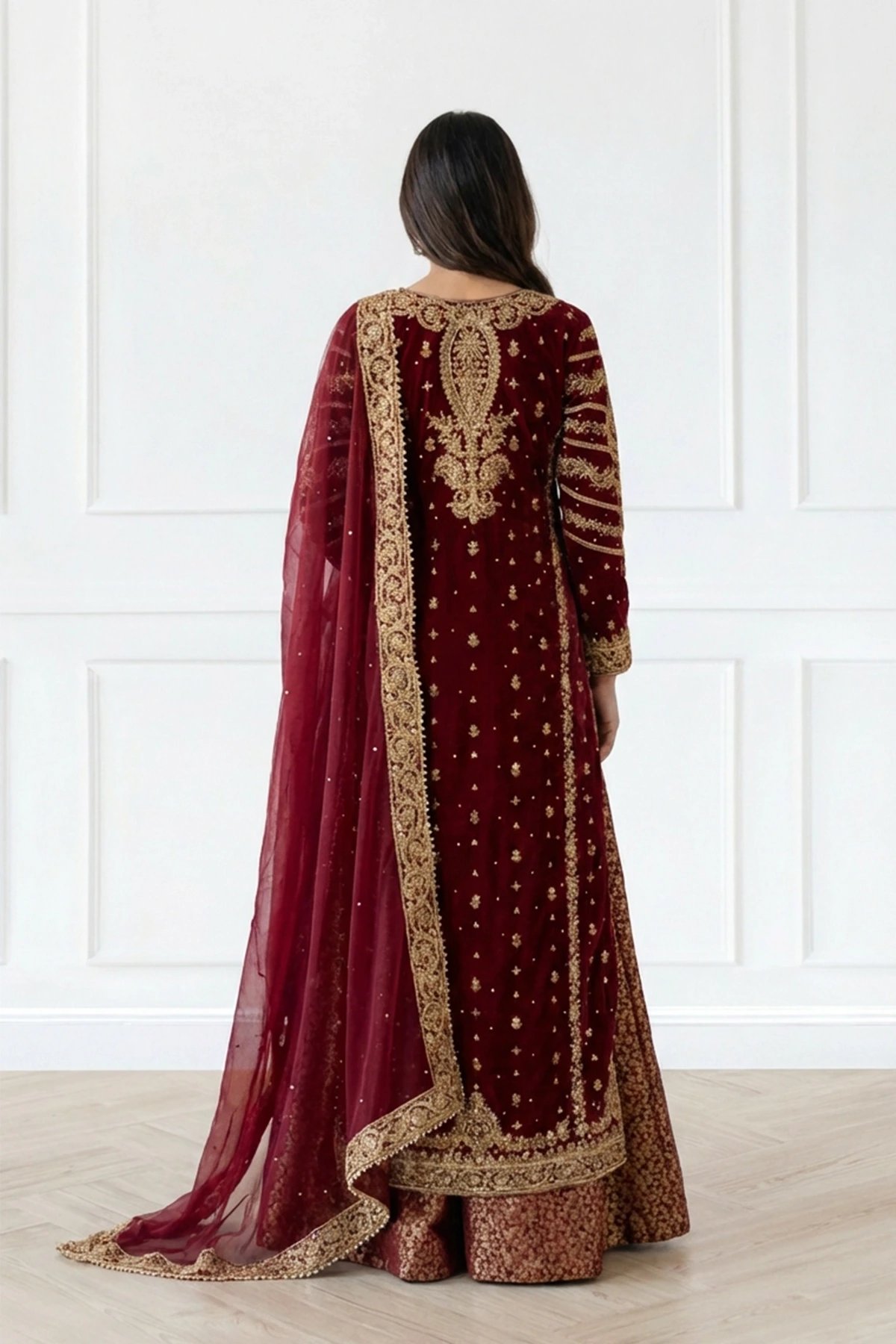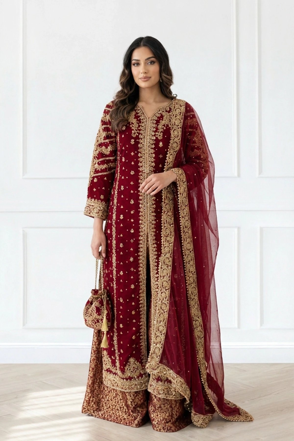 This beautiful 3 piece chiffon suit features a straight shirt with luxury thread, dori work embroidery throughout with scattered diamantes and mirror embellishments, finished with full length embroidered sleeves. Paired with a banarsi lengha and the look is finished with a chiffon embroidered dupatta along with a potli bag.