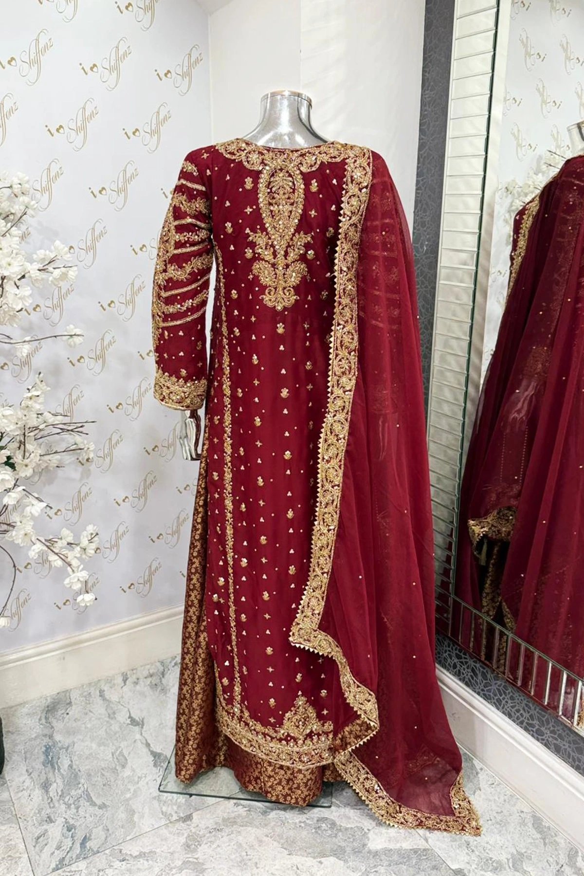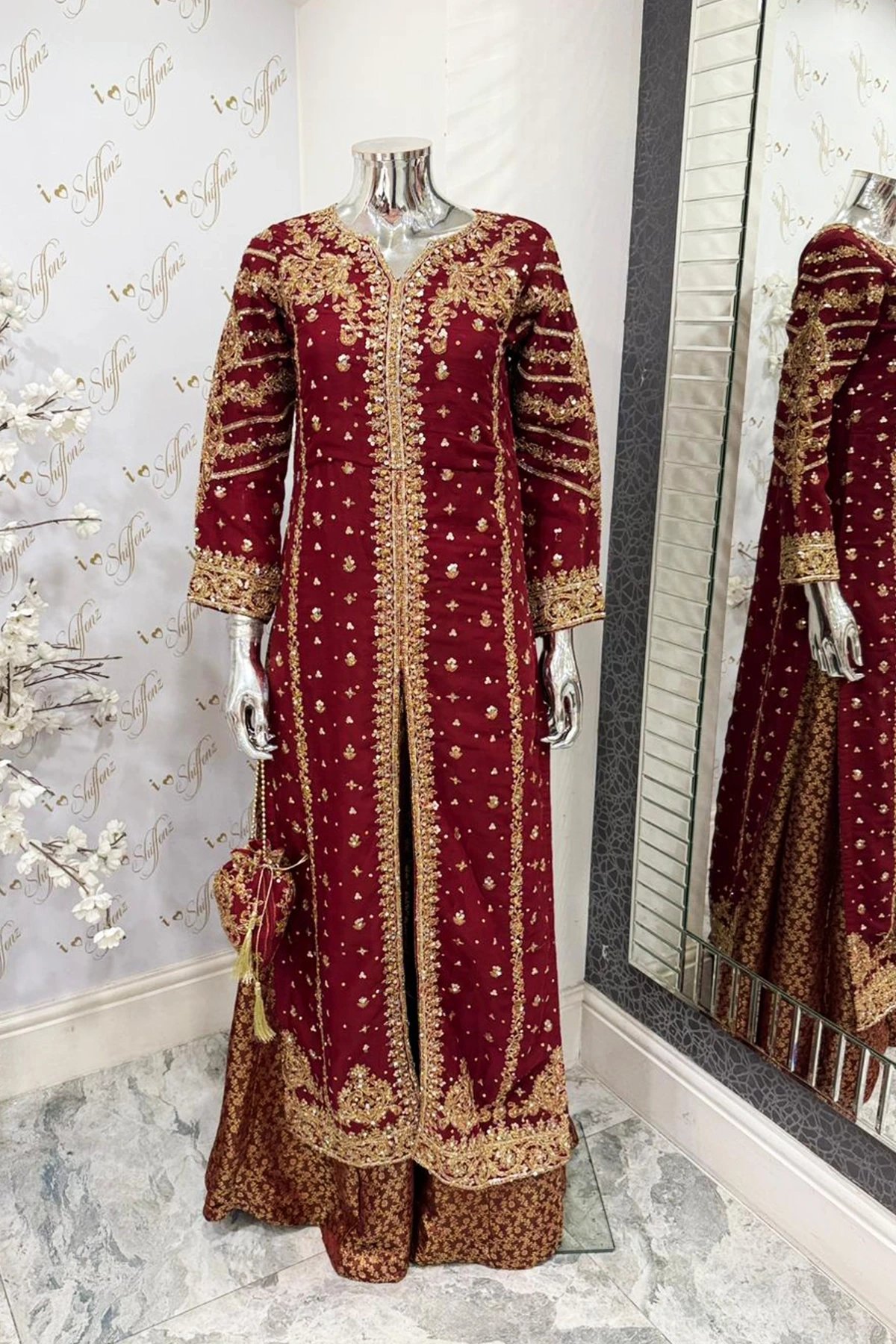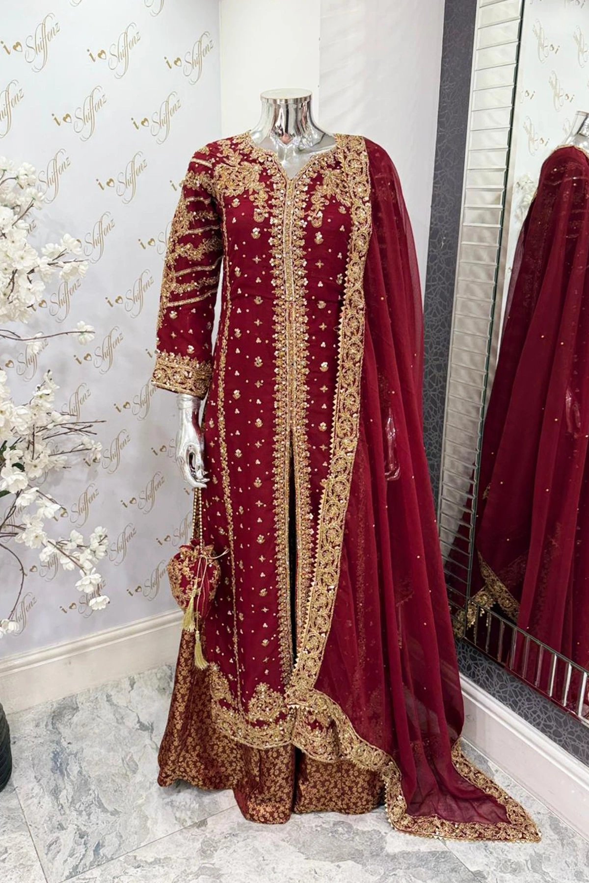 This beautiful 3 piece chiffon suit features a straight shirt with luxury thread, dori work embroidery throughout with scattered diamantes and mirror embellishments, finished with full length embroidered sleeves. Paired with a banarsi lengha and the look is finished with a chiffon embroidered dupatta along with a potli bag.
