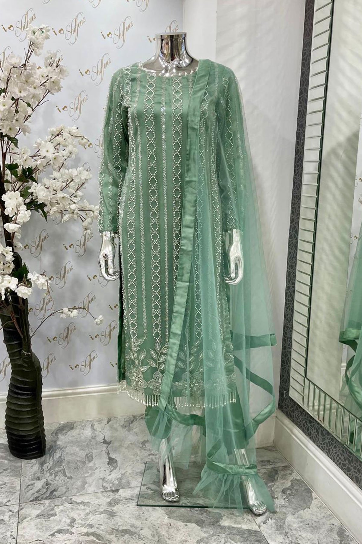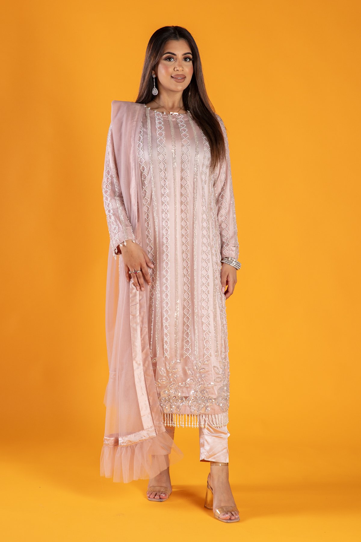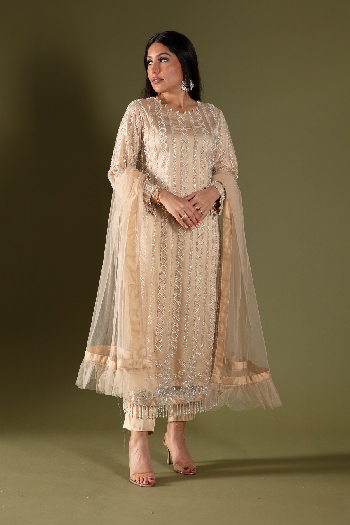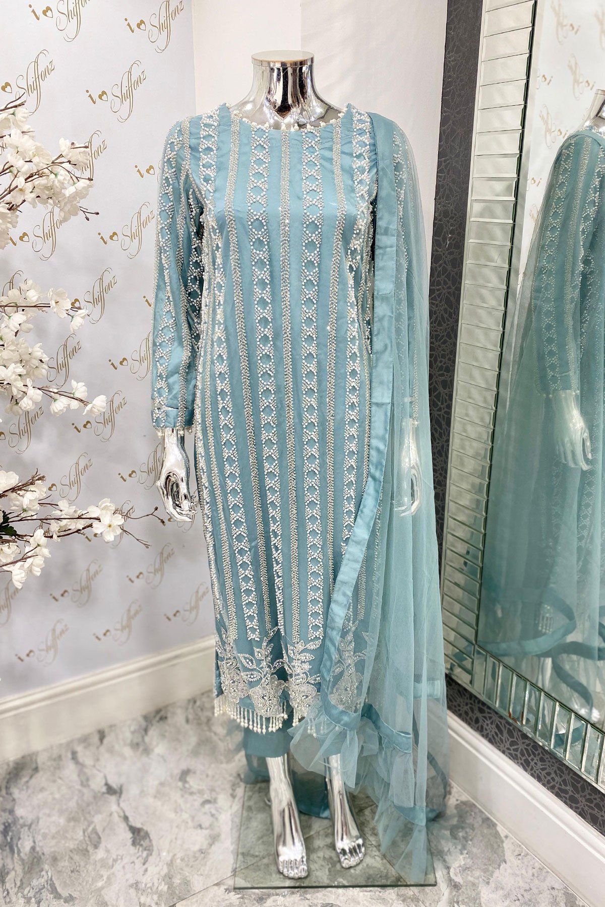 This beautiful 3 piece Alina luxury collection features a straight shirt with luxury thread work and sequence embroidery throughout with pearl embellishment on the round neckline, finished with dangling beads on the border. It comes with full length embroidered sleeves and straight leg crepe trousers. The look is finished with a net dupatta.