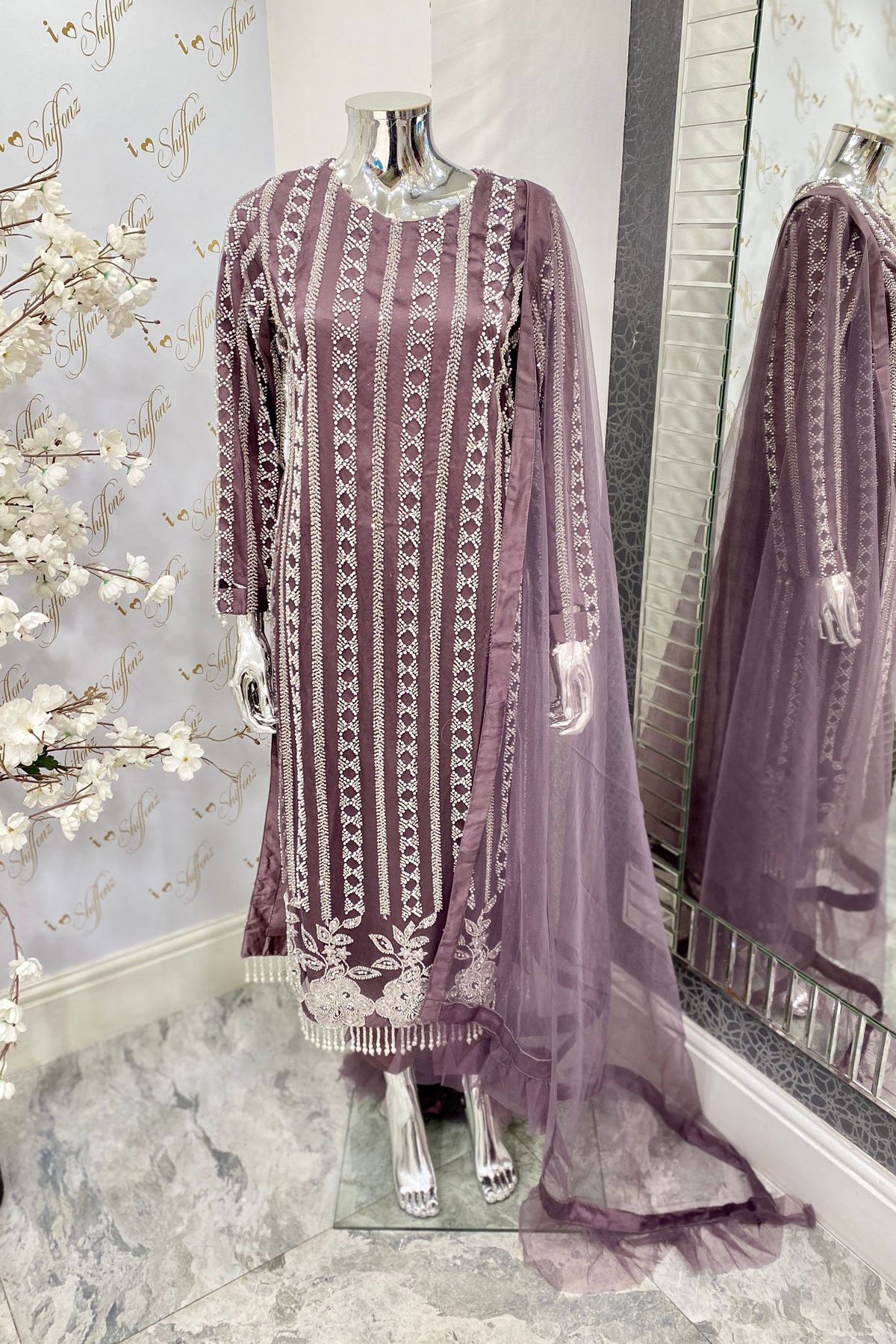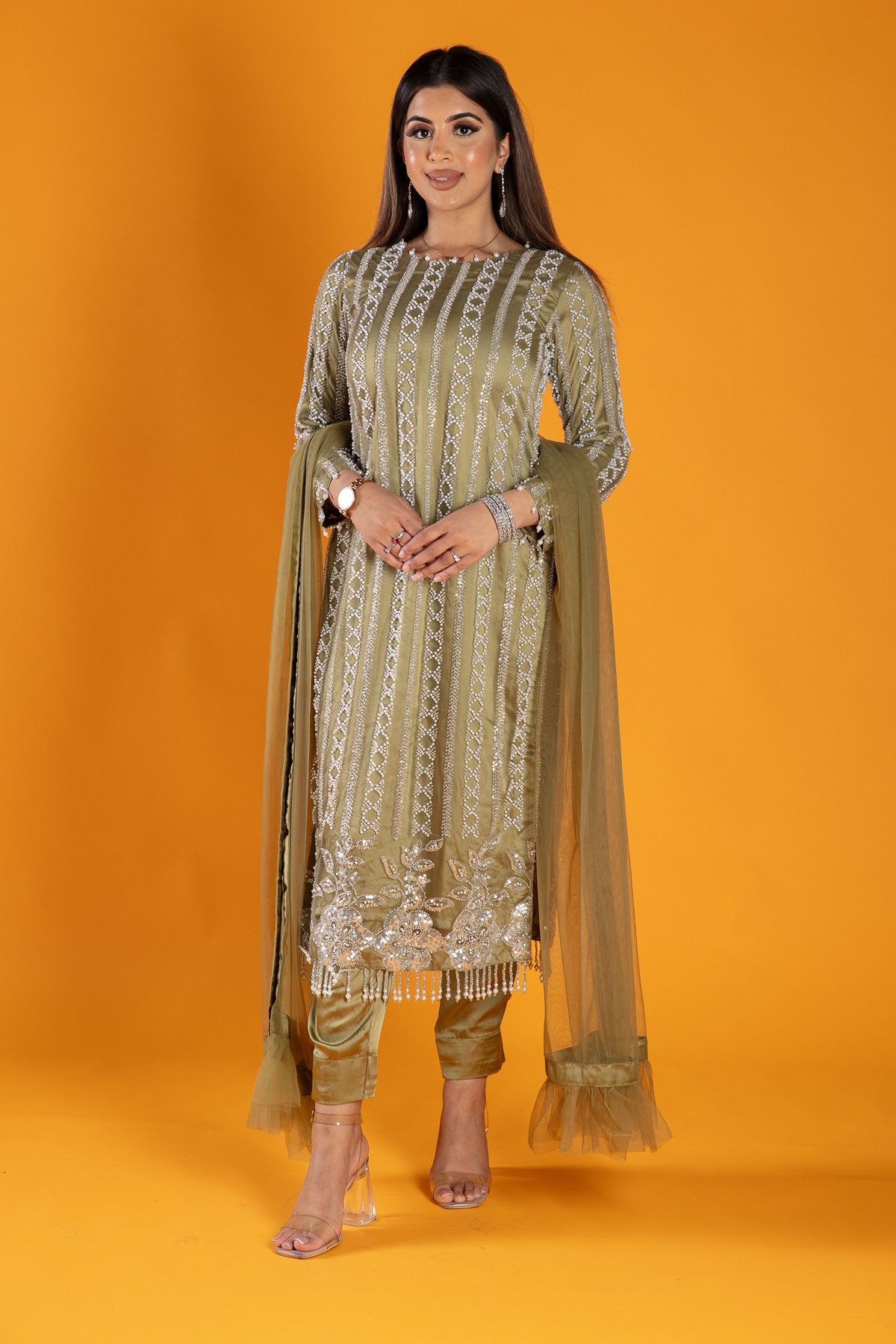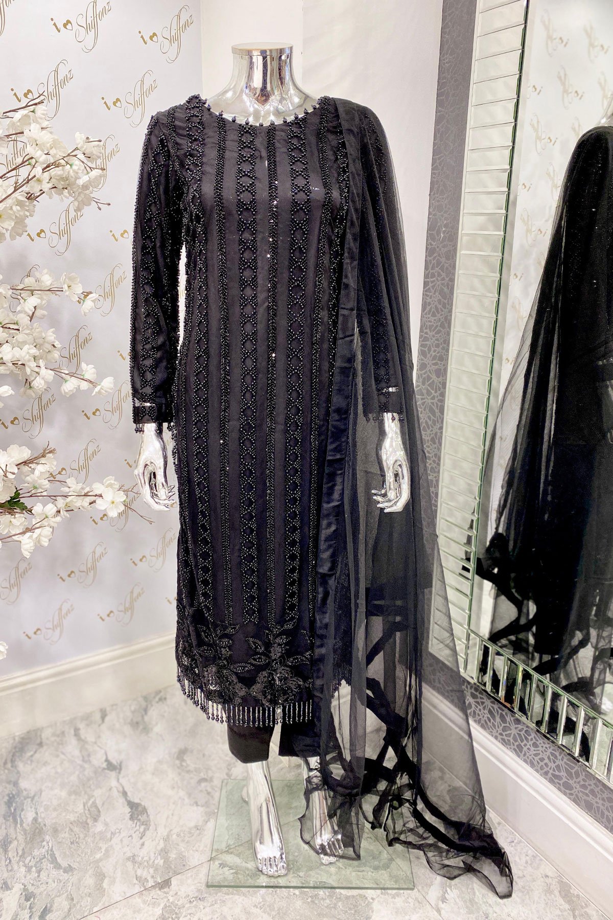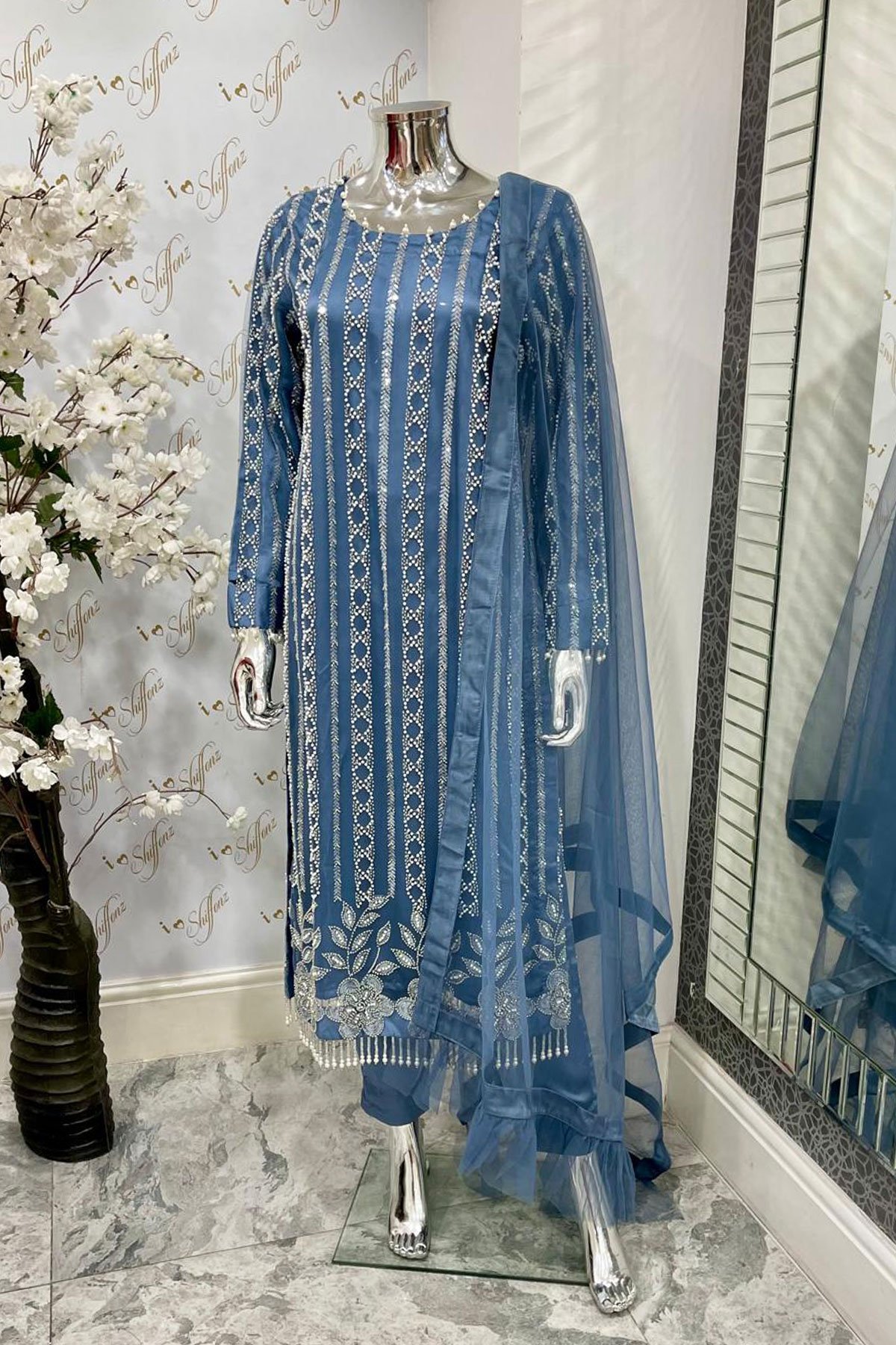 This beautiful 3 piece Alina luxury collection features a straight shirt with luxury thread work and sequence embroidery throughout with pearl embellishment on the round neckline, finished with dangling beads on the border. It comes with full length embroidered sleeves and straight leg crepe trousers. The look is finished with a net dupatta.