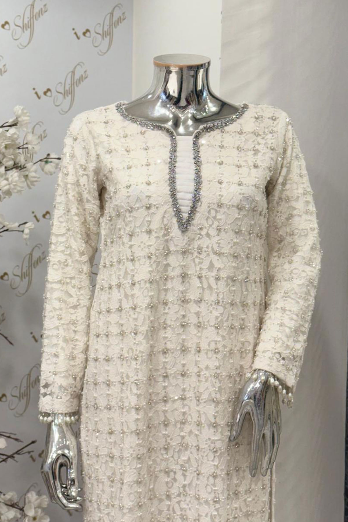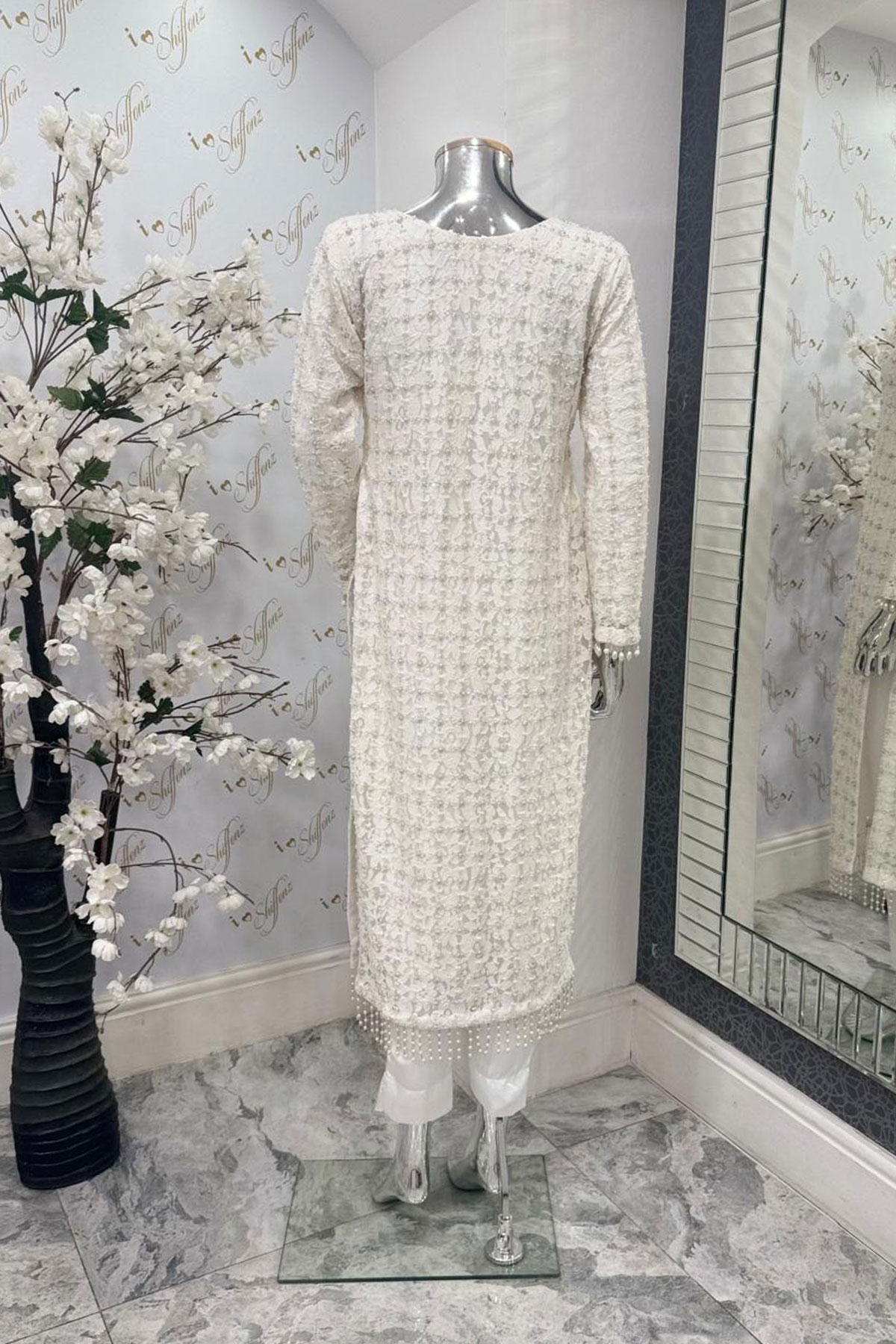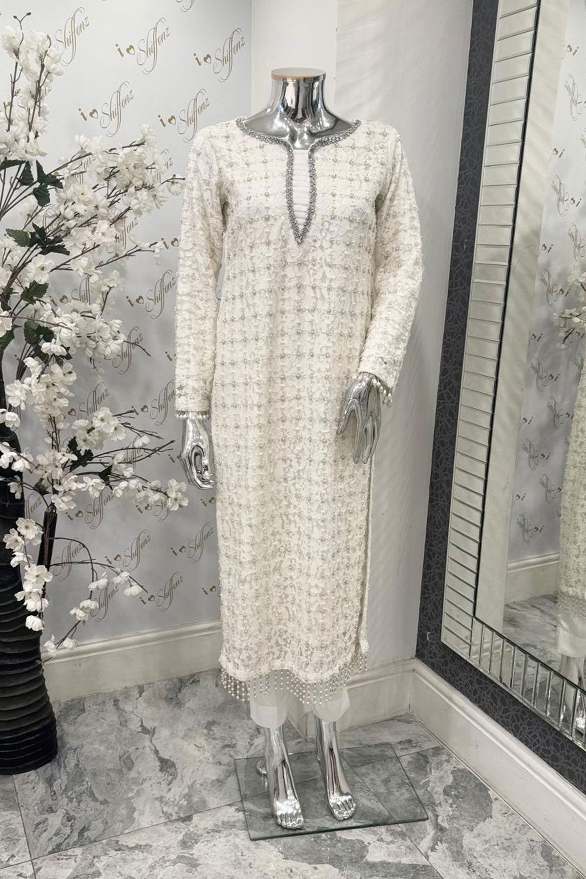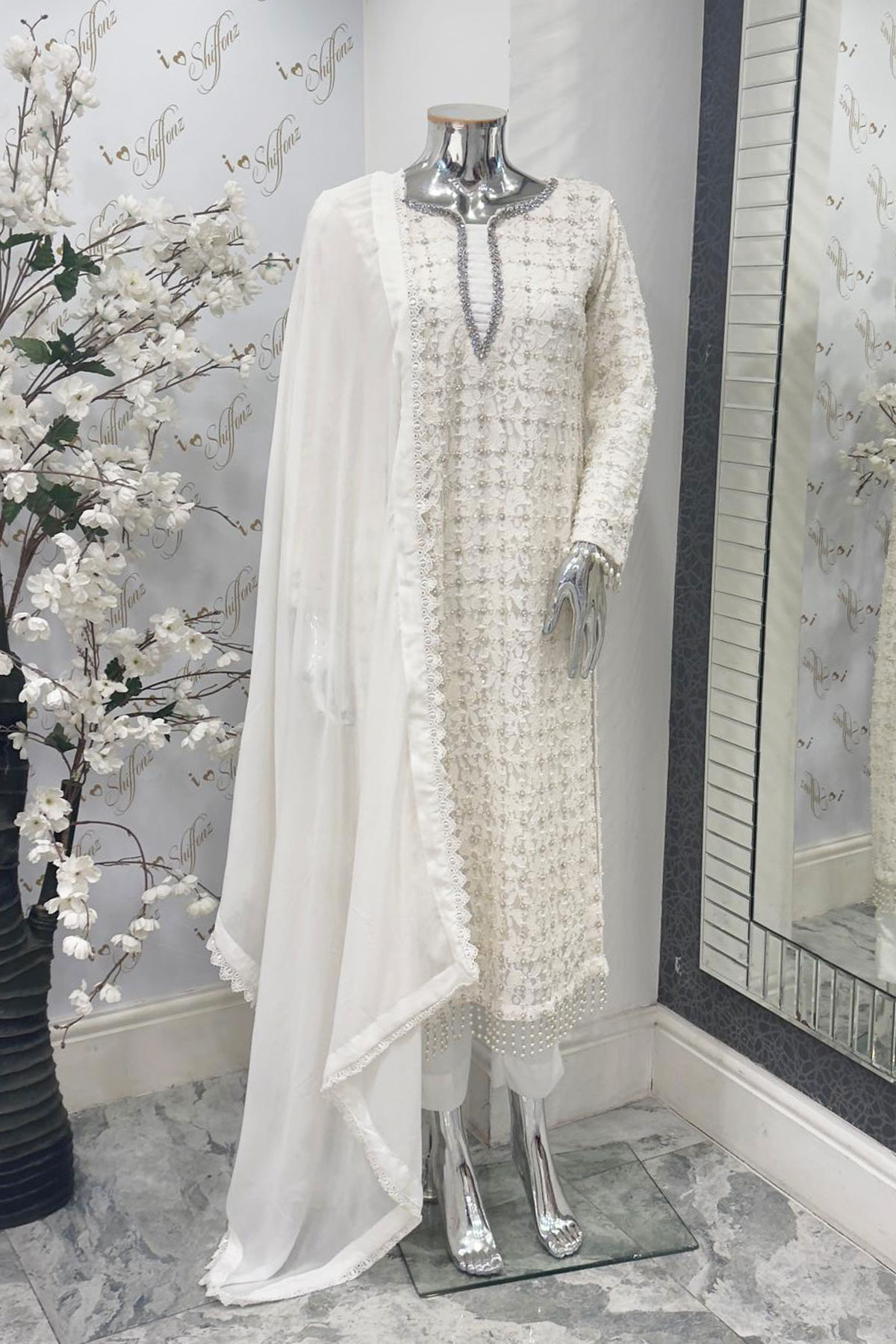 This beautiful 3 piece Alina collection features a straight shirt with luxury thread work embroidery throughout with bead embellishments finished with full length embroidered sleeves. Paired with straight leg silk trousers and the look is finished with a chiffon dupatta with an embroidered dupatta.