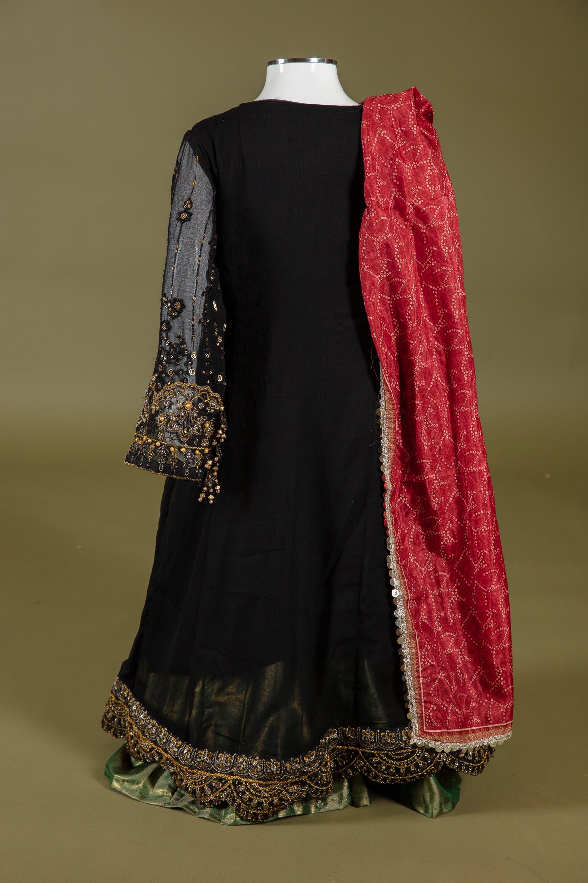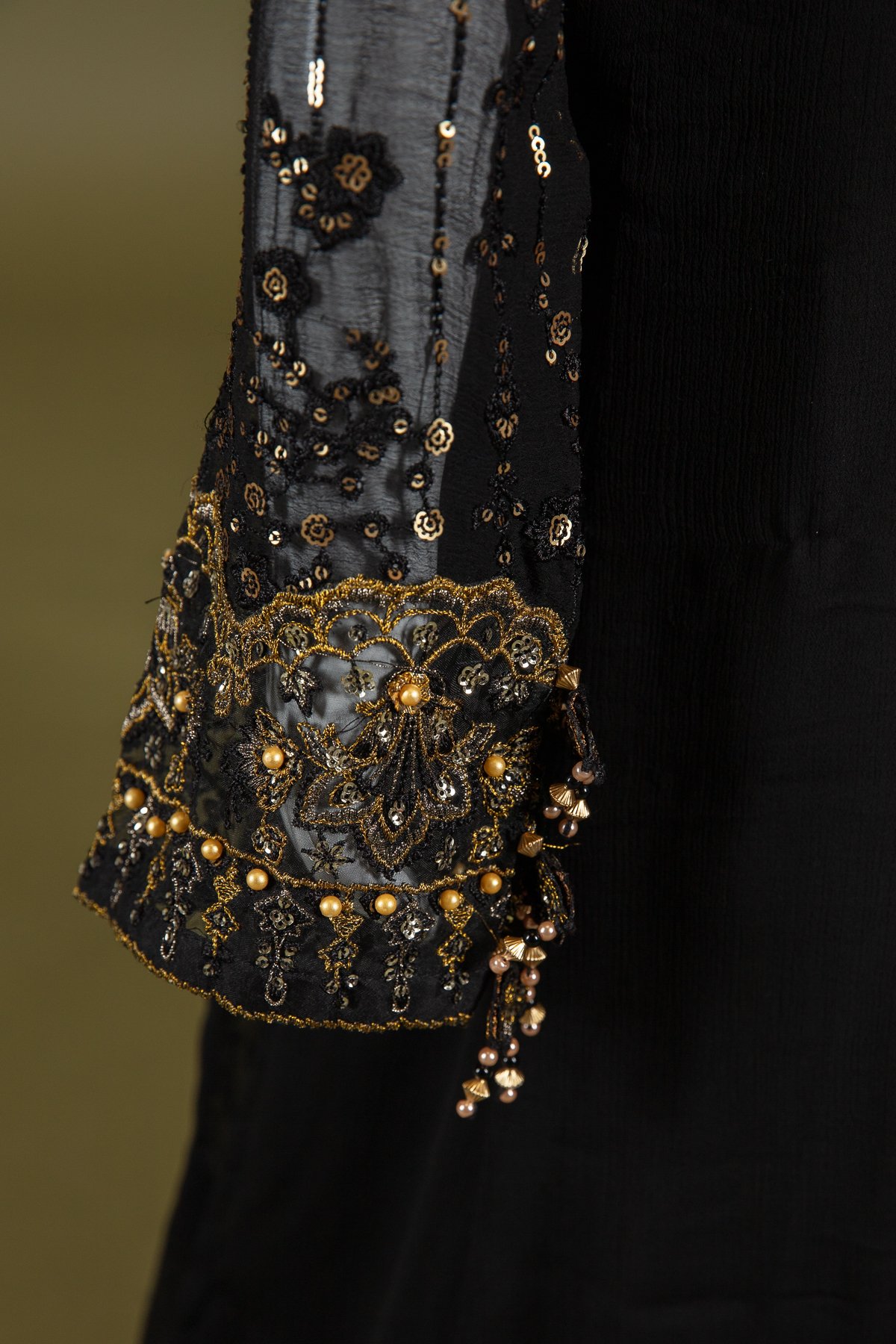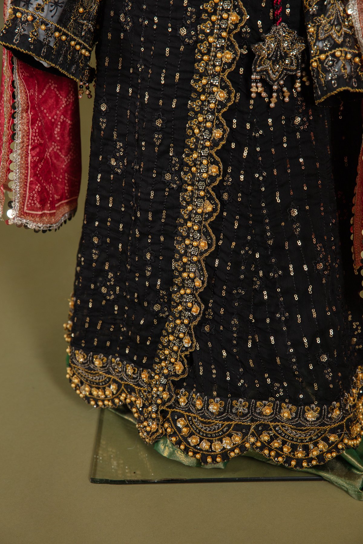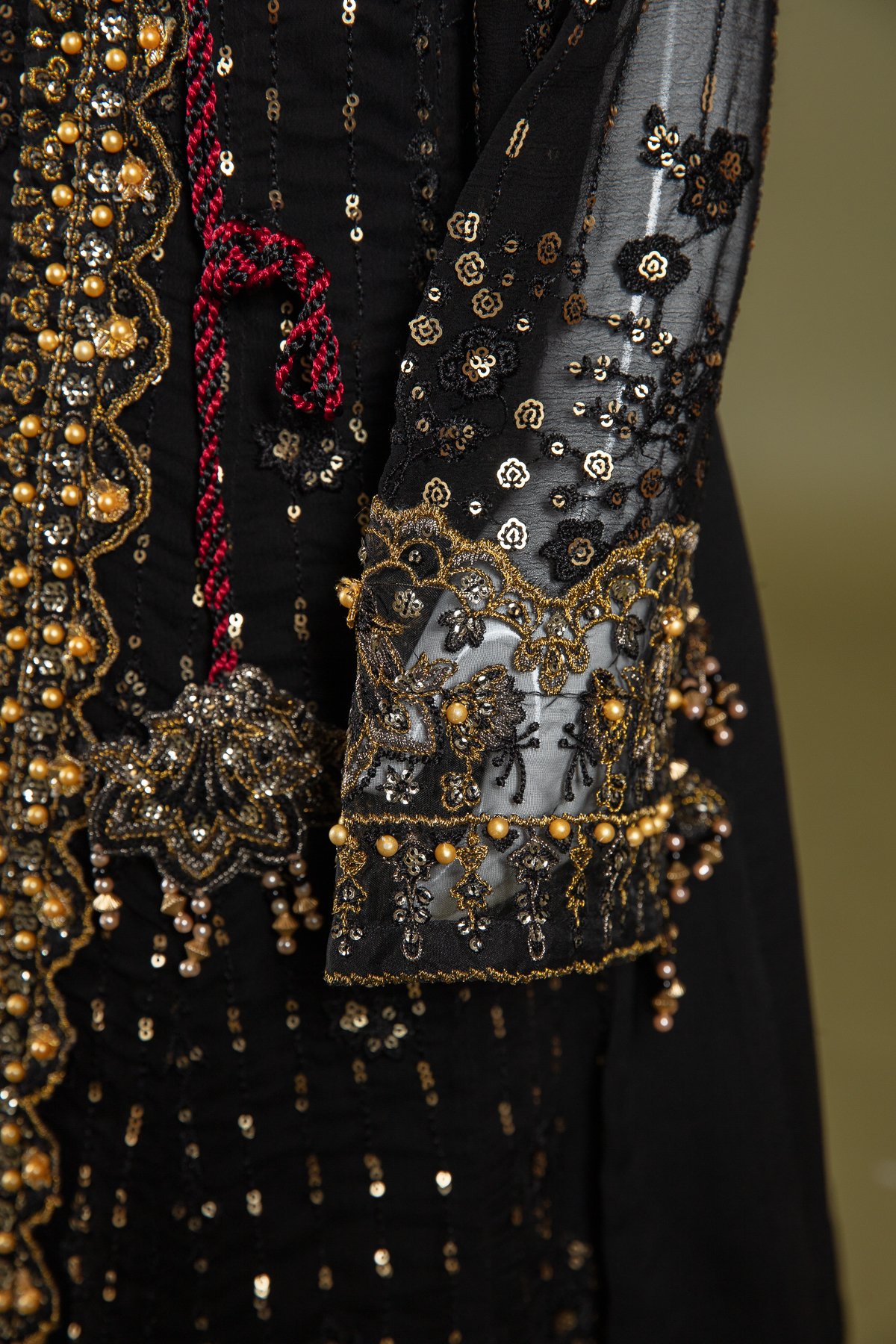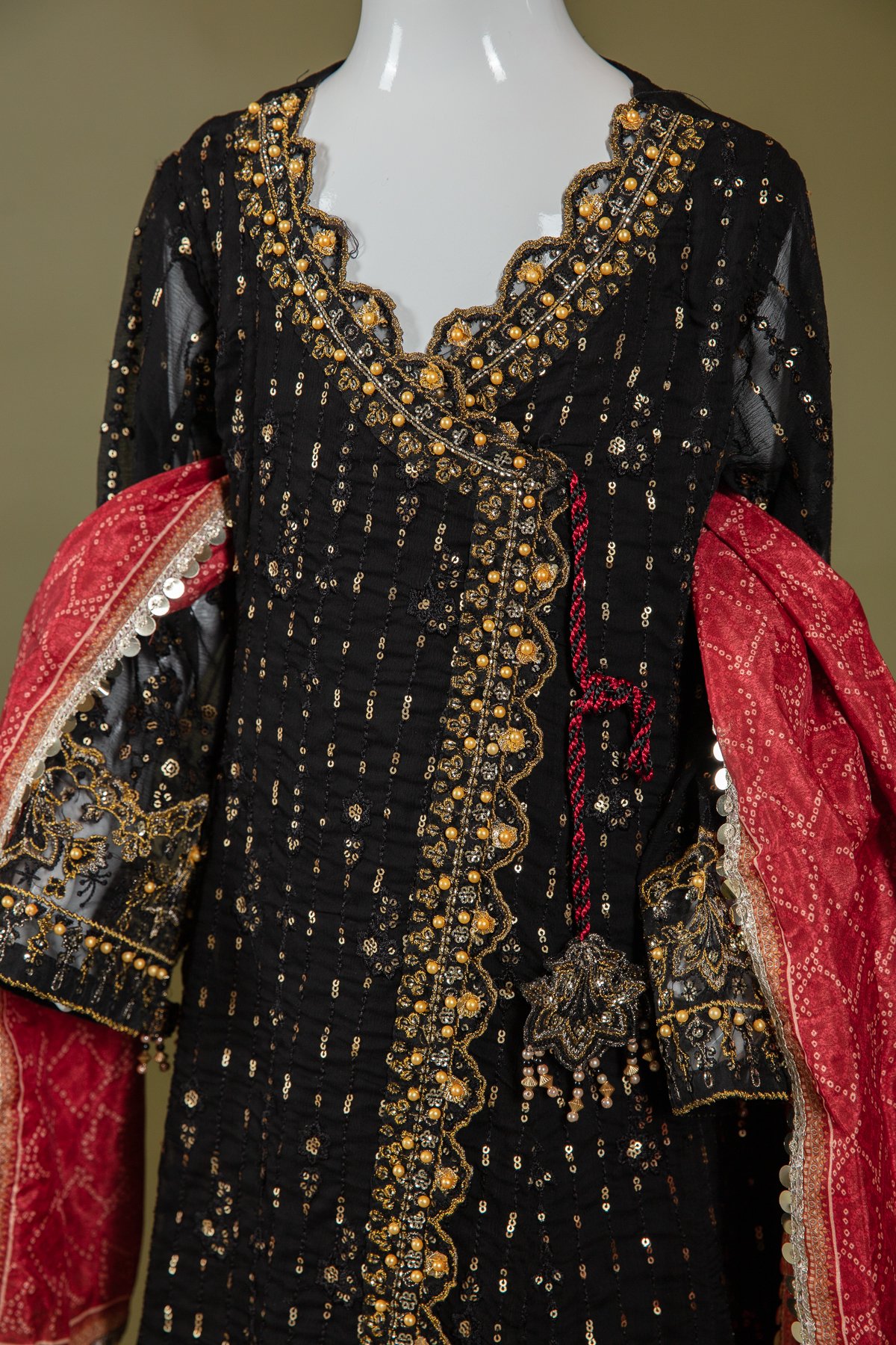 This beautiful 3 piece Esme chiffon kids collection features an angrakha style long dress with dori embellishment on the front. It has thread work and sequence embellishments throughout, finished with full length embroidered sleeves. It comes with straight leg contrasted trousers and an embroidered chiffon dupatta.