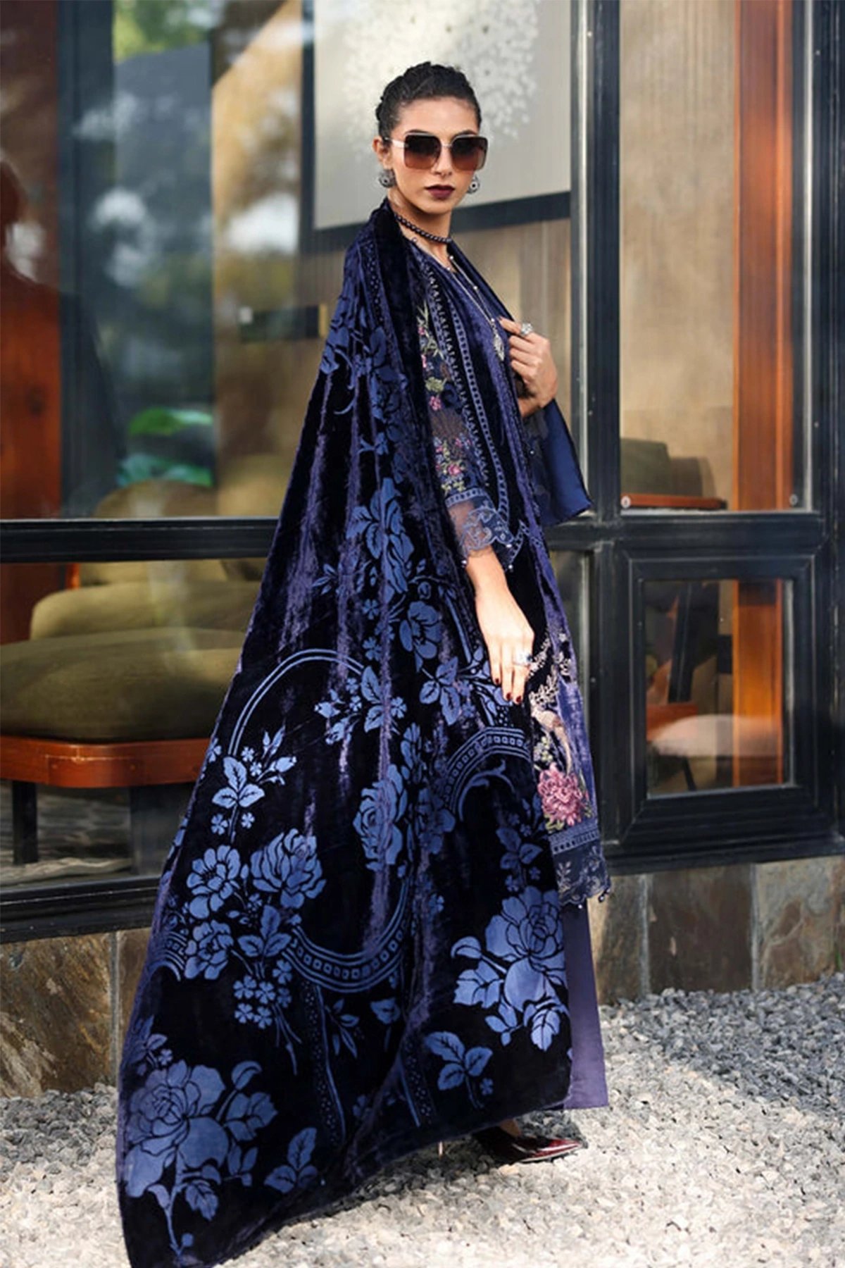 This beautiful 3 piece velvet collection features a straight embroidered shirt with lace embellished border and full length sleeves. Paired with flared trousers in crepe and the look is finished with a velvet Palachi shawl.