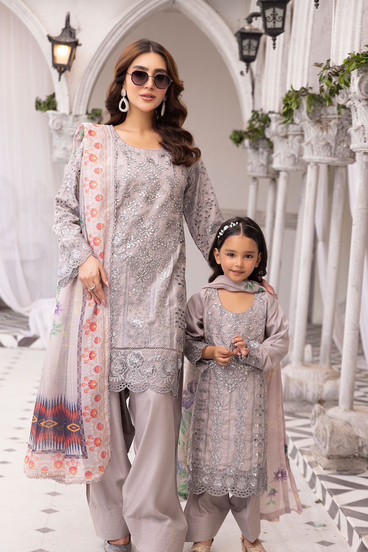 This beautiful 3 piece Amelia kids collection features a straight shirt with luxury thread work embroidery with pearl embellishments throughout, finished with full length embroidered sleeves. Paired with wide leg trouser. Note: The grey colour suit comes with farshi shalwar. The look is finished with a printed Khadi net dupatta. Perfect casual collection for this Eid for comfort and elegance,
