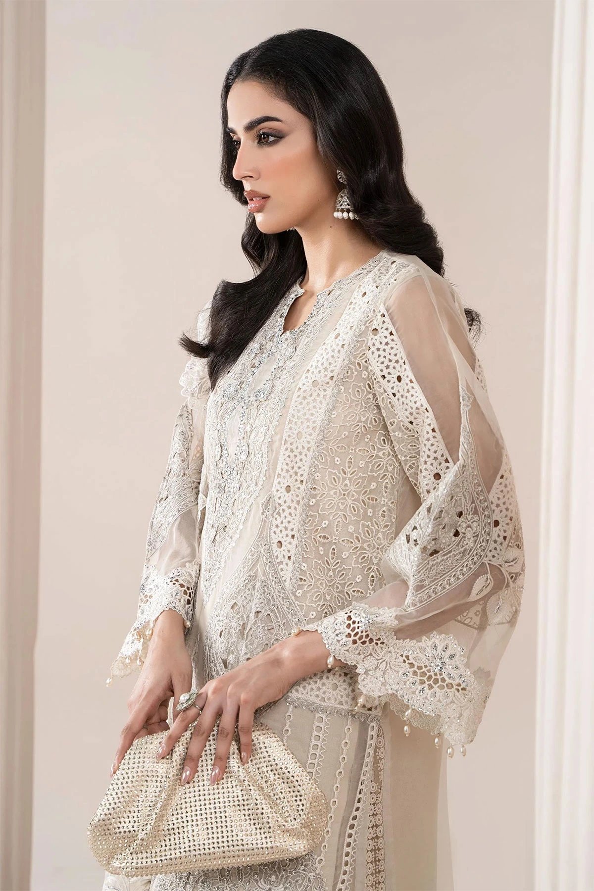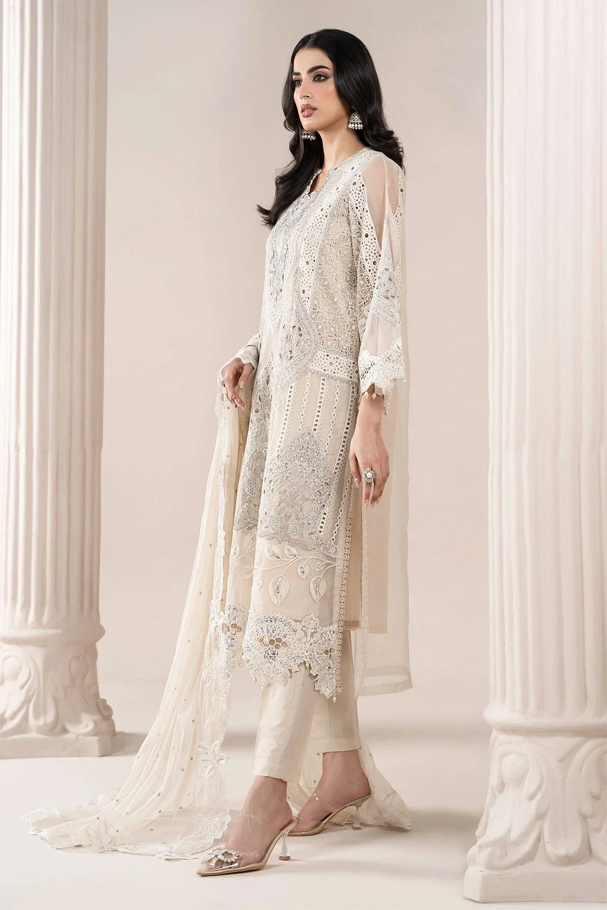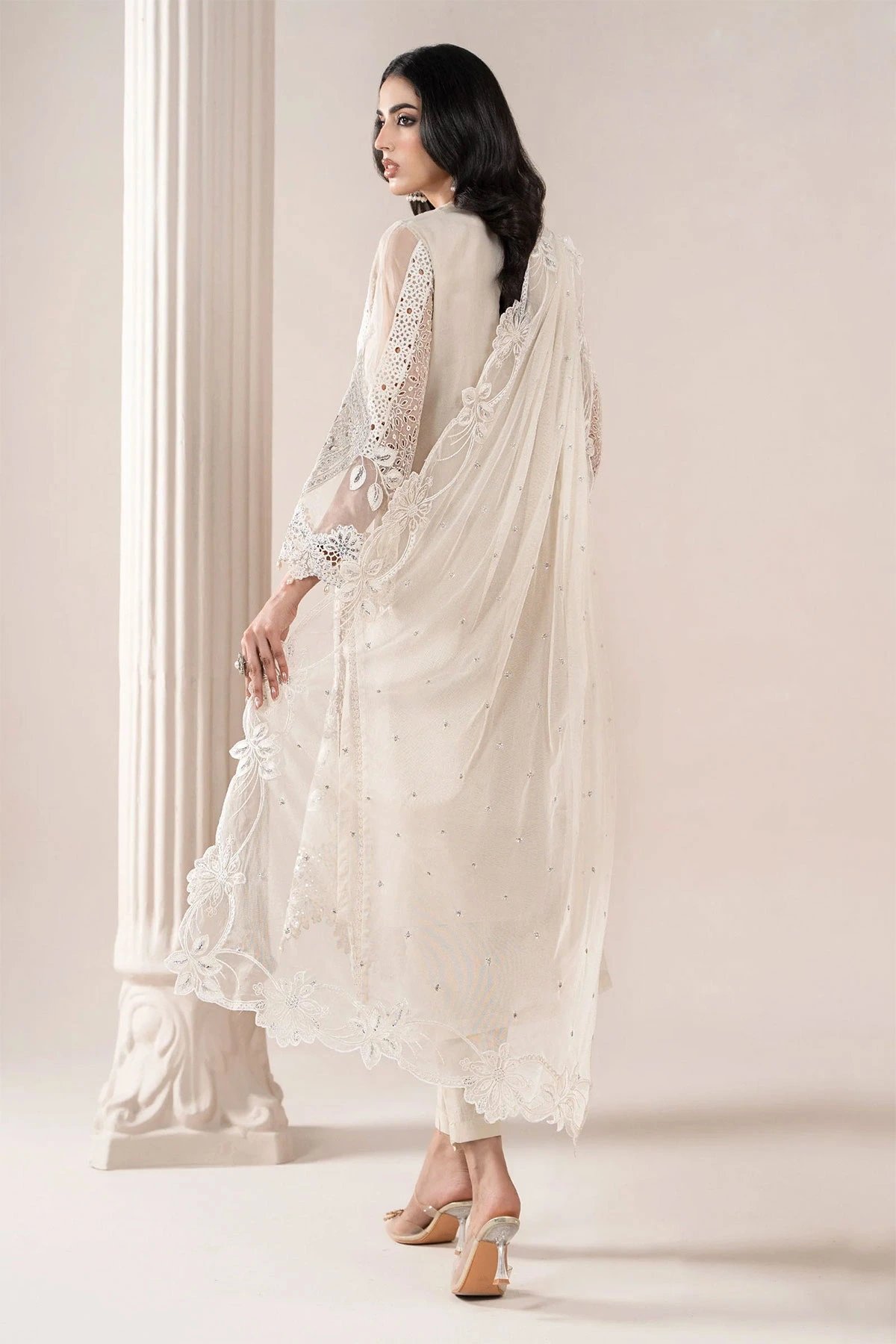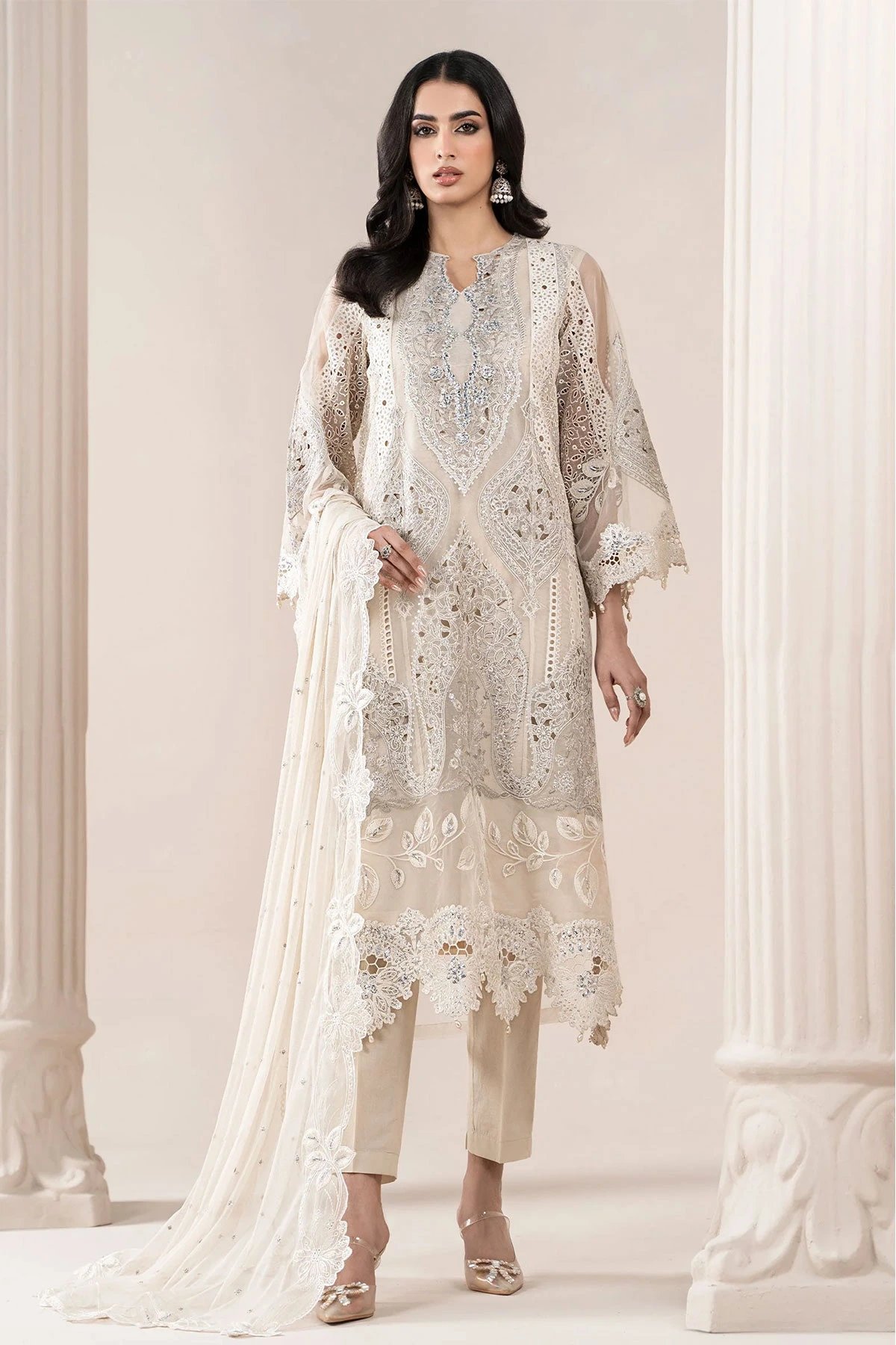 This beautiful 3 piece Maria b inspired suit features a straight shirt with luxury thread work embroidery throughout with delicate sequin and diamantés embellishments on the front, finished with full length embroidered sleeves. Paired with straight leg viscose trousers and the look is finished with an embroidered chiffon dupatta. Note: Above catalogue pictures are for design reference only, embellishments and stitching may vary.