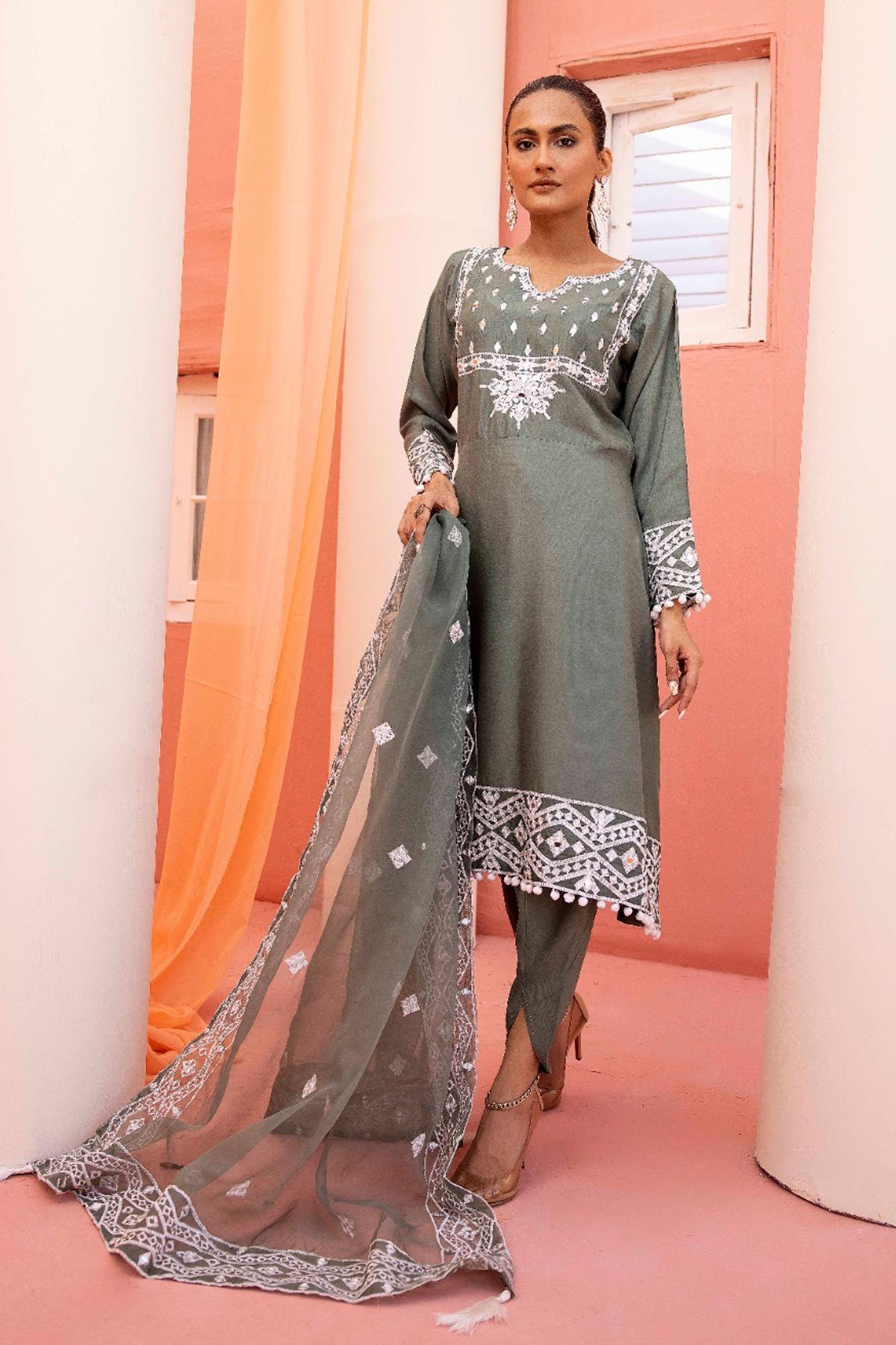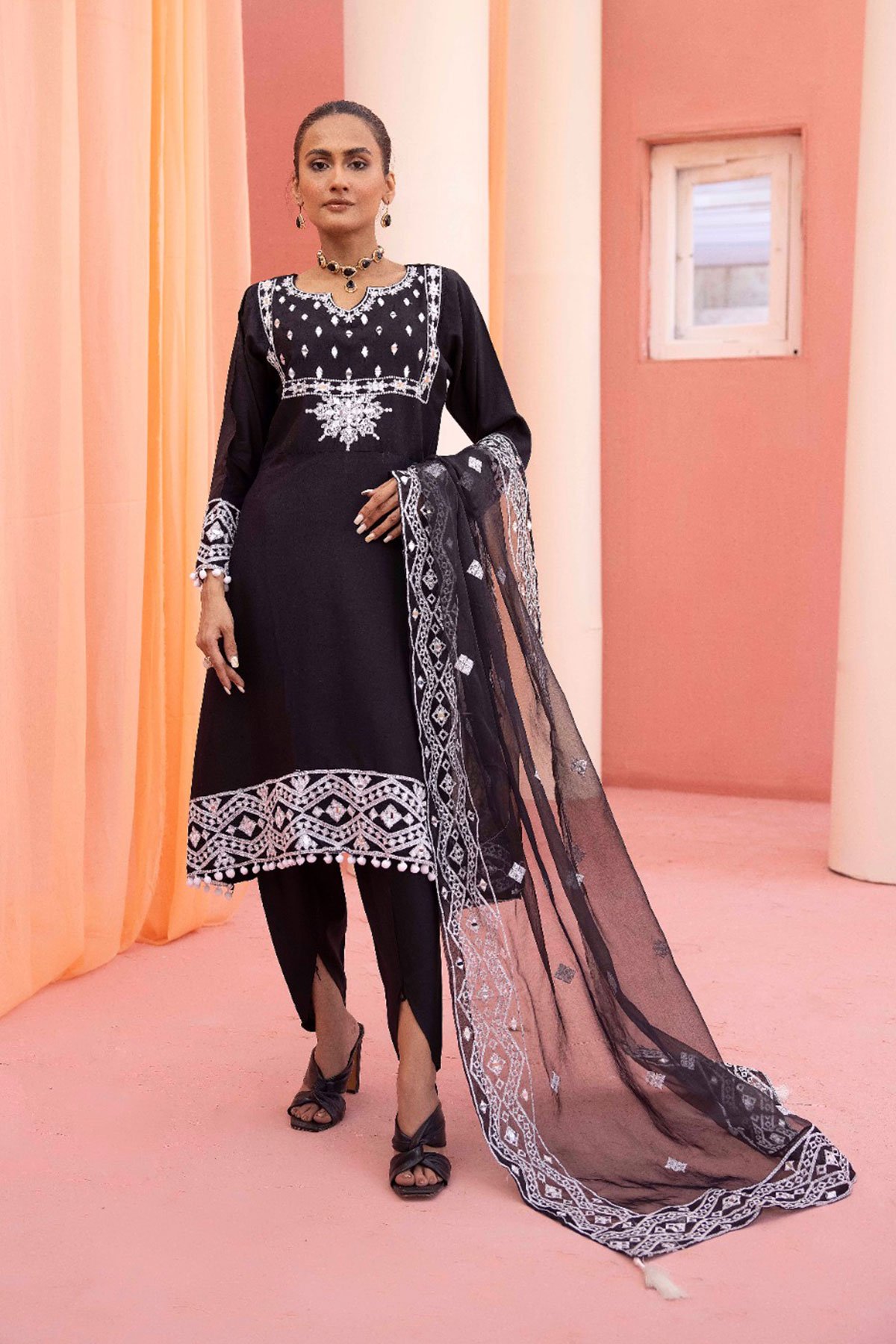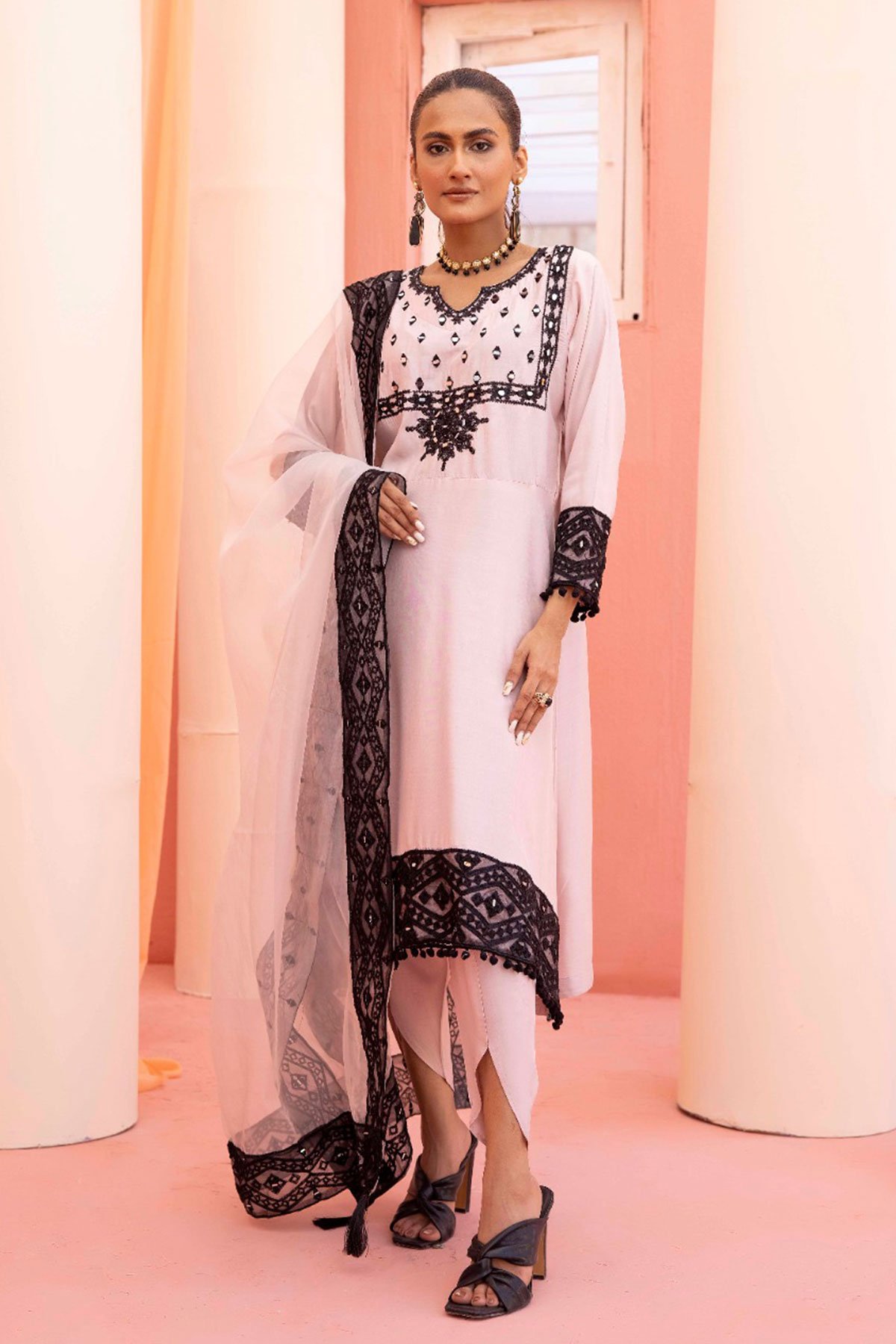 This beautiful 3 piece Anaya collection features an a-line peplum shirt with thread for embroidery along with mirror embellishments, finished with full length sleeves. It comes with tulip trousers and the look is finished with an embroidered organza dupatta.