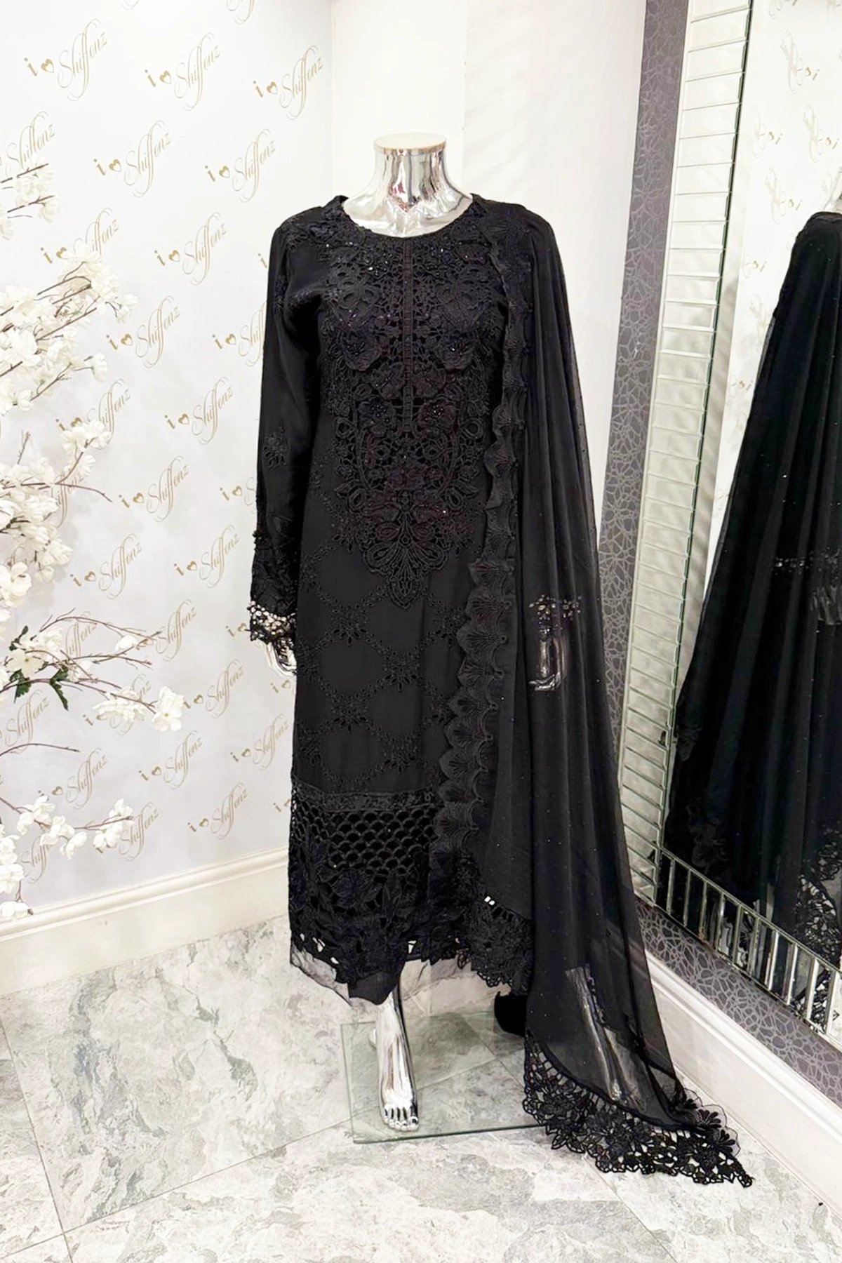 This beautiful 3 piece Maria b inspired chiffons suit features a straight shirt with luxury thread work and chikan kari lace embellishments throughout with full length embroidered sleeves with stone work embellished cuffs. Paired with straight leg crepe trousers and the look is finished with chiffon embroidered dupatta.