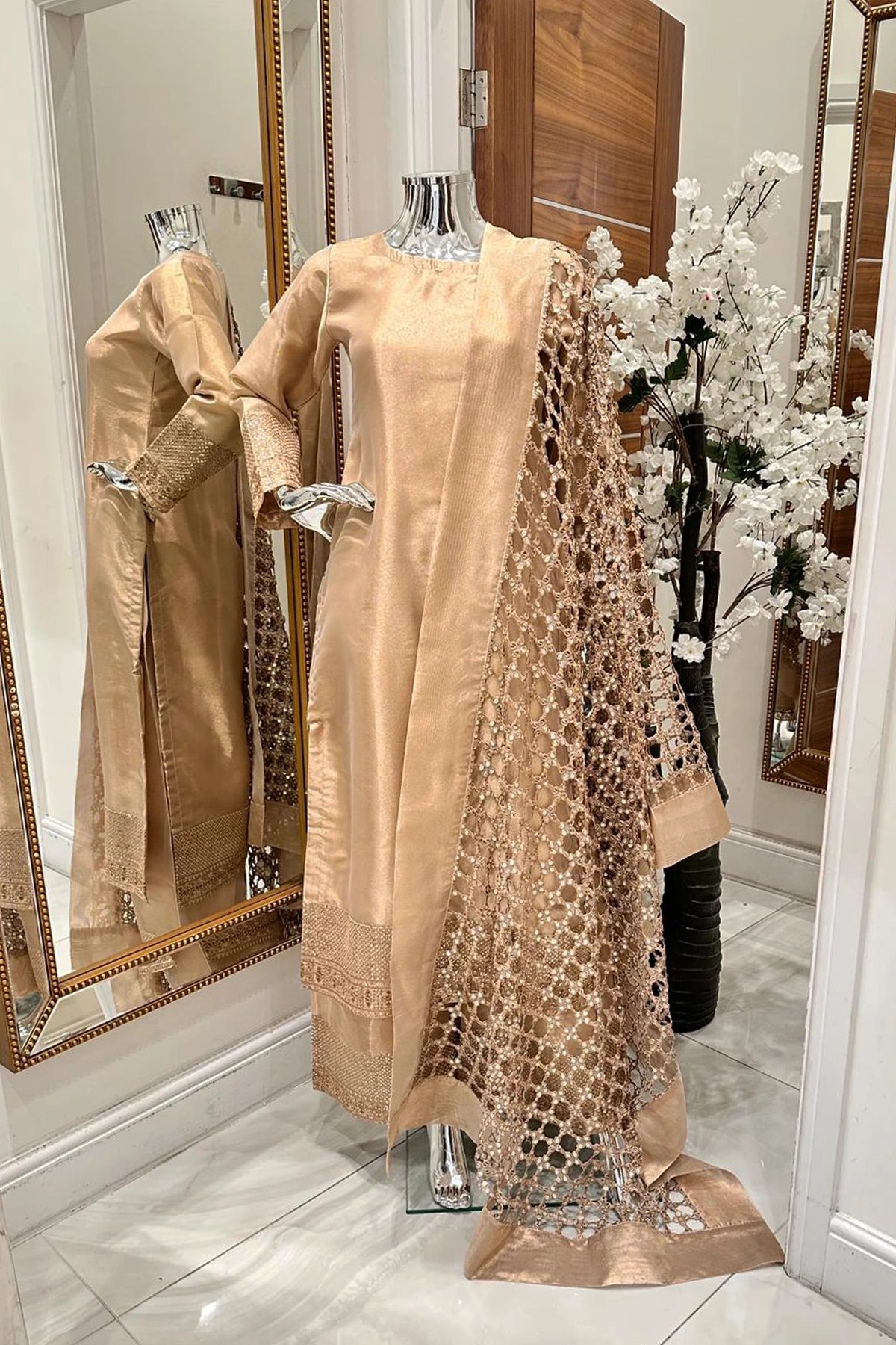 This beautiful 3 piece suit features a straight raw silk shirt with full length sleeves. Paired with straight leg raw silk trousers. The look is finished with a sheesh pati dupatta offering the perfect blend of tradition and contemporary grace. Whether draped over your shoulders or styled as a statement piece, it adds instant grandeur to any ensemble.Featuring mirrors on one side and shimmering gold sequins on the other. Note: There may be visible glue on the dupatta, which is a normal part of the manufacturing process. Rest assured, it will not be noticeable when you wear it.