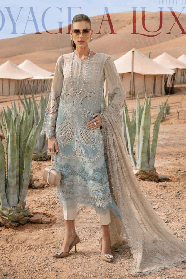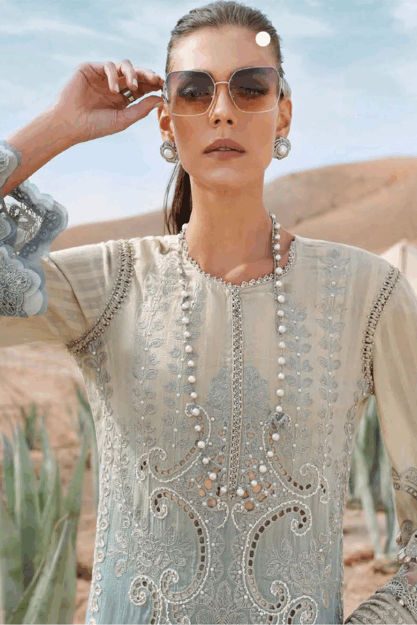 This beautiful 3 piece Maria b inspired suit features a straight shirt with luxury thread work embroidery throughout with scattered pearl embellishments all over, finished with a strip of pearls on the front neckline and dangling beads on the border. It comes with full length embroidered sleeves. Paired with straight leg lawn plain trousers and the look is finished with a net dupatta. Note: Above catalogue picture is for design reference only, embroidered patterns and embellishment will vary.
