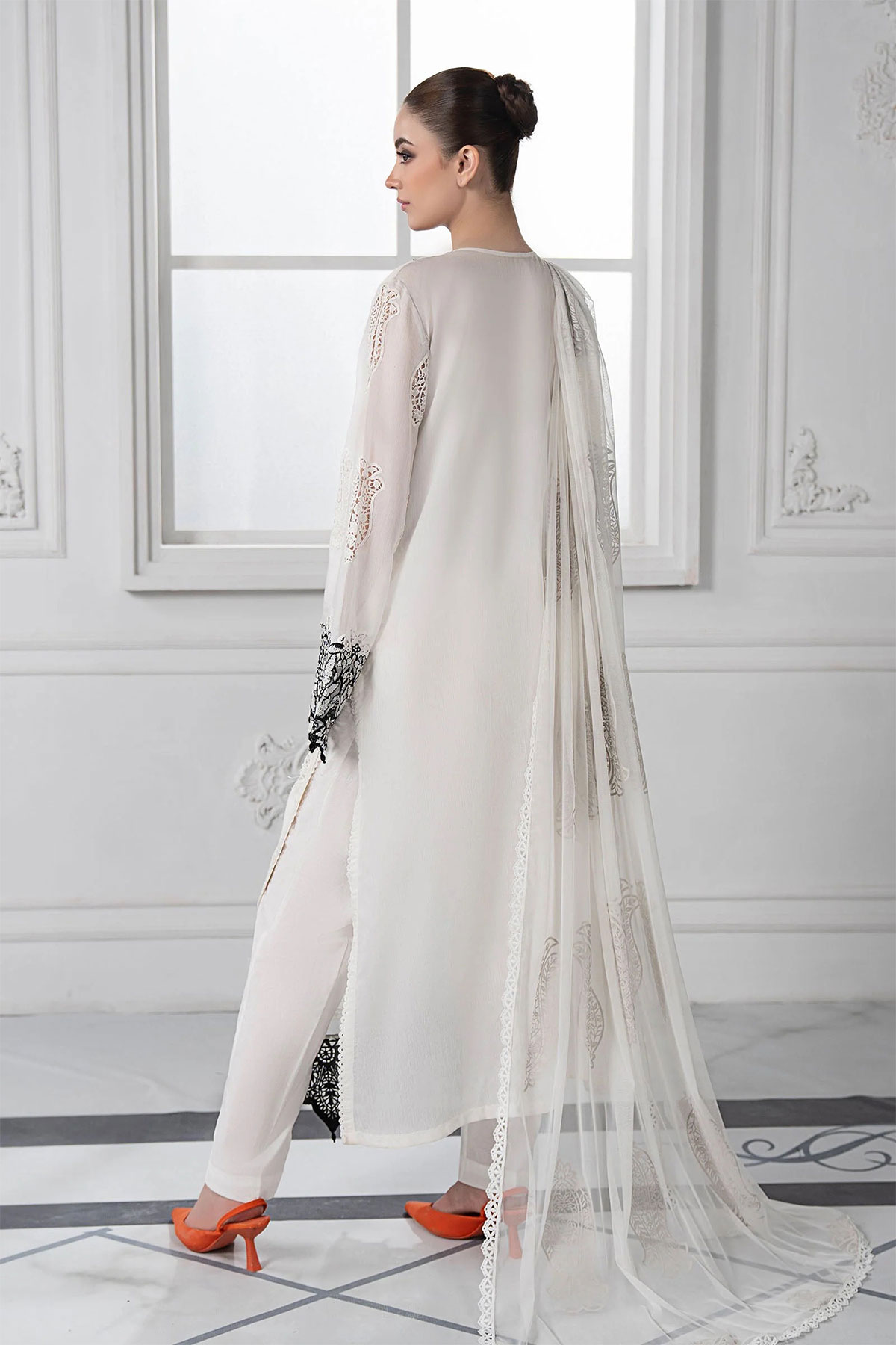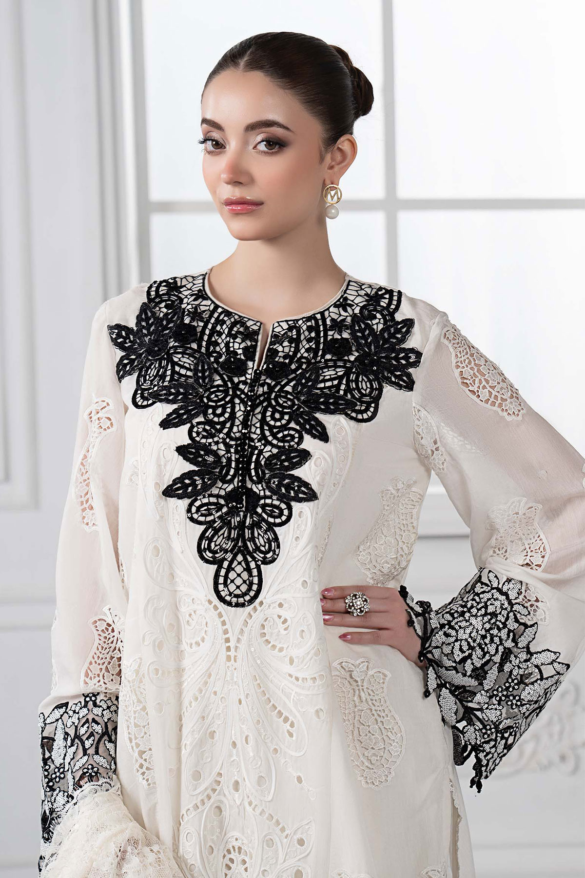 This beautiful 3 piece Maria b inspired suit features a straight shirt with luxury chikan kari embroidered front with black lace embroidered patch on the front neckline and border with bead embellishments, finished with full length sleeves with embellished cuffs. Paired with straight leg lawn plain trousers and the look is finished with a net embroidered dupatta. Note: Above catalogue picture is for design reference only, embroidered patterns and embellishment will vary.