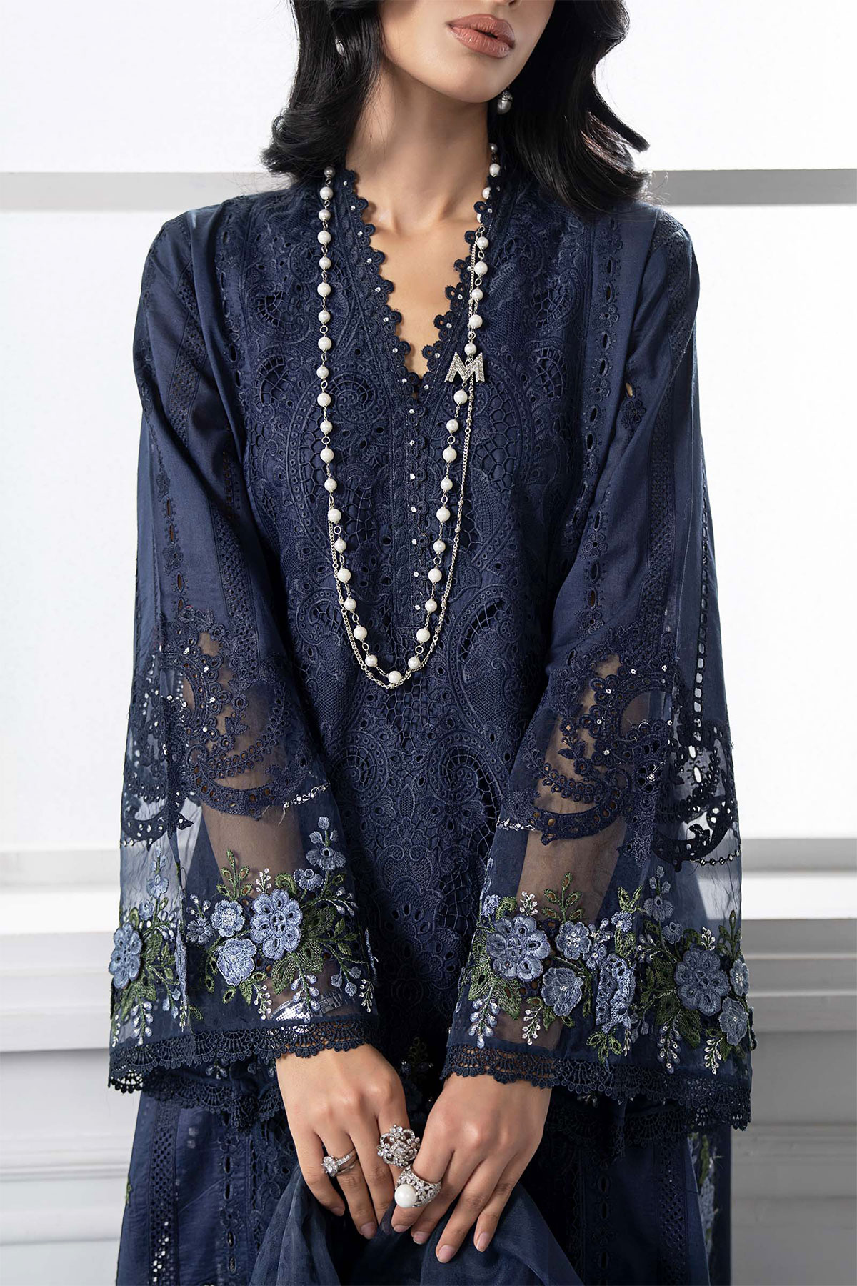 This beautiful 3 piece Maria b inspired suit features a straight shirt with luxury thread work embroidery with a bead embroidered pattern strip along the middle with a detailing on the neckline, finished with lace embellished border along with full length embroidered sleeves. Paired with straight leg lawn plain trousers and the look is finished with a net embroidered dupatta. Note: Above catalogue picture is for design reference only, embroidered patterns and embellishment will vary as well as the neckline; its lined and not see through. Trousers are also plain not embellished as shown in picture.