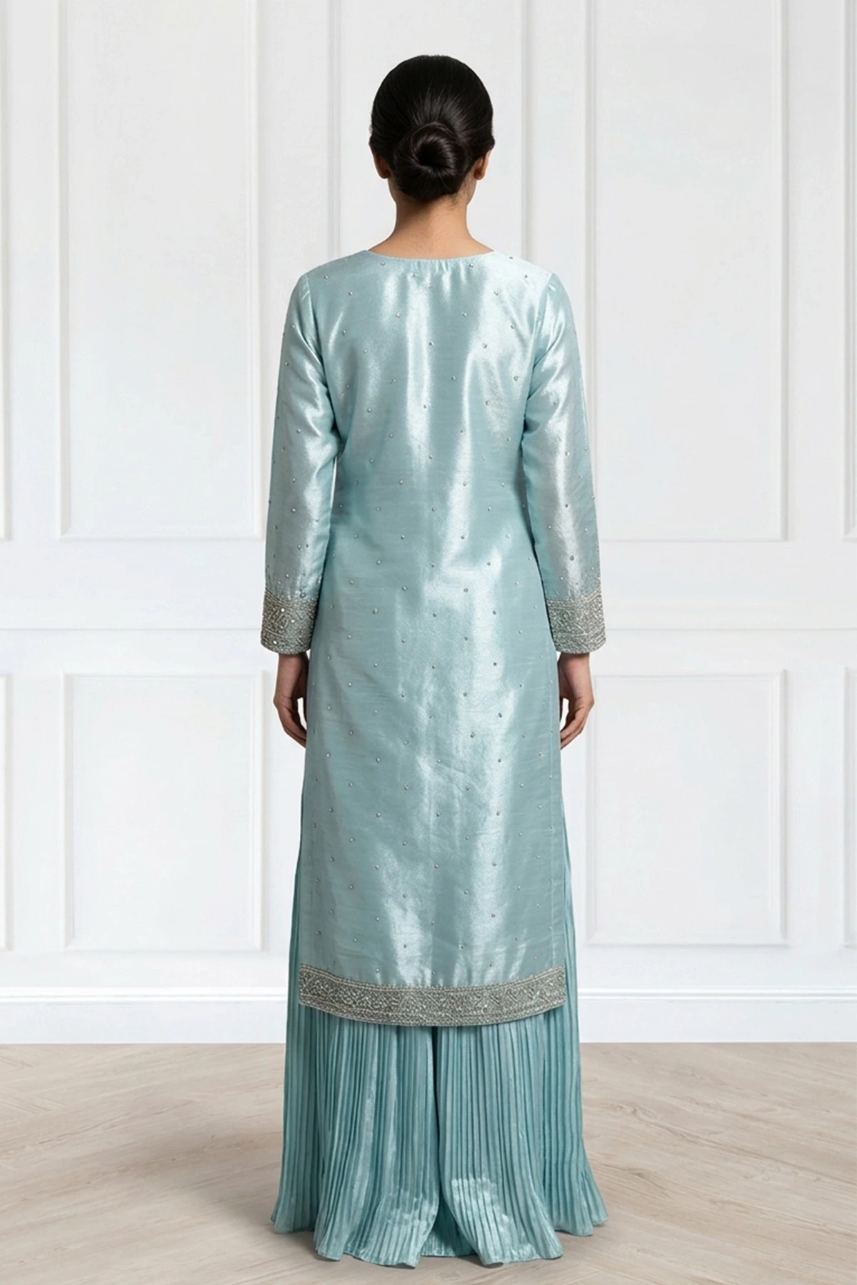 This beautiful 3 piece Arsh collection raw silk suit features a straight shirt with luxury dori work embroidered sides and neckline with scattered gold diamantés throughout, finished with full length embroidered sleeves. Paired with a crinkled lengha. The look is finished with a net embroidered dupatta.