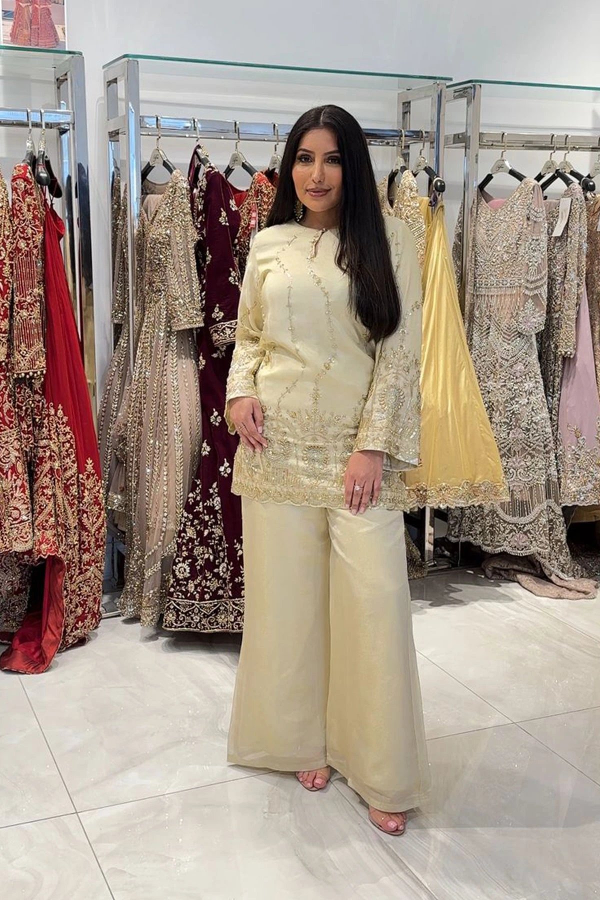 This beautiful 2 piece set features a straight short short with luxury delicate embroidery throughout with full length embroidered sleeves. Paired with plazo trousers.