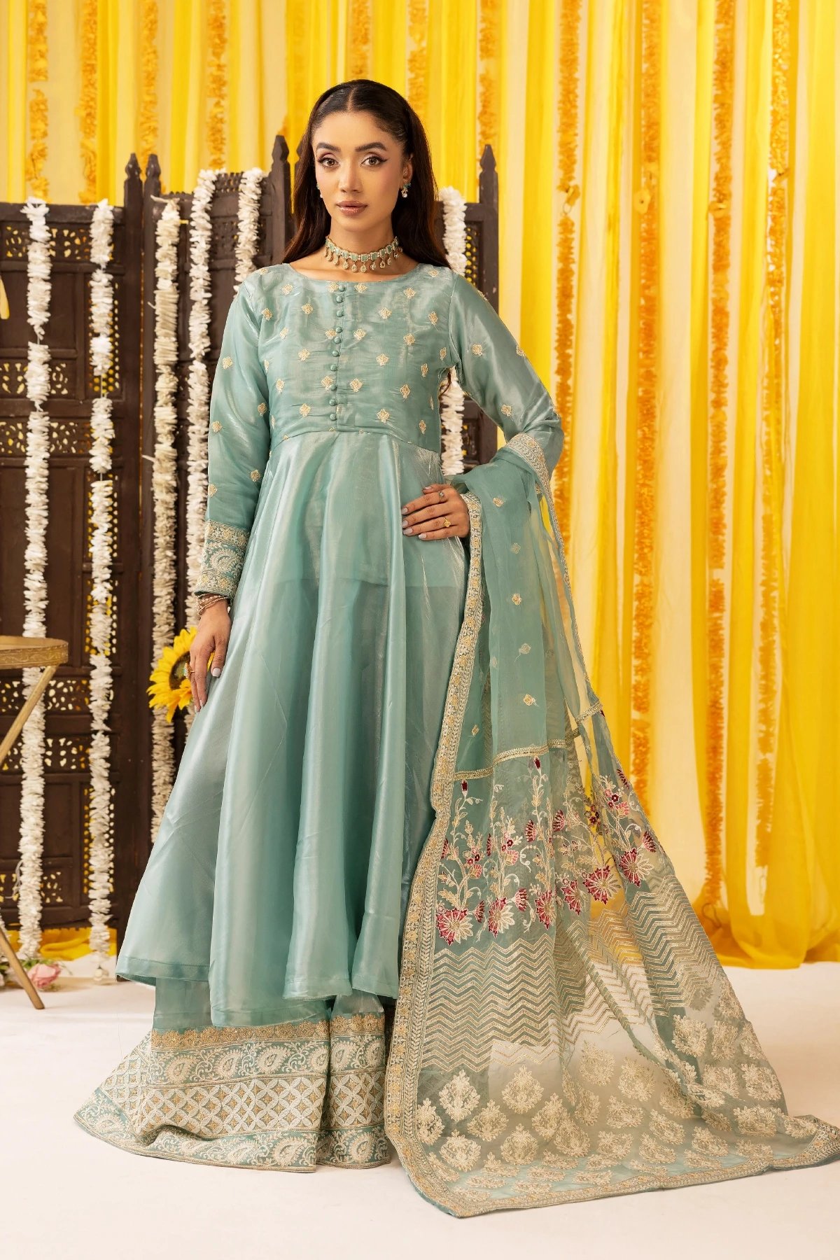 This beautiful 3 piece suit features a long peplum dress in silk tissue overlay with fabric button embellishments on the front with thread work embroidered patterns along with full length embroidered sleeves. Paired with silk tissue plazo trousers with an embroidered border. The look is finished with a luxury embroidered organza dupatta.