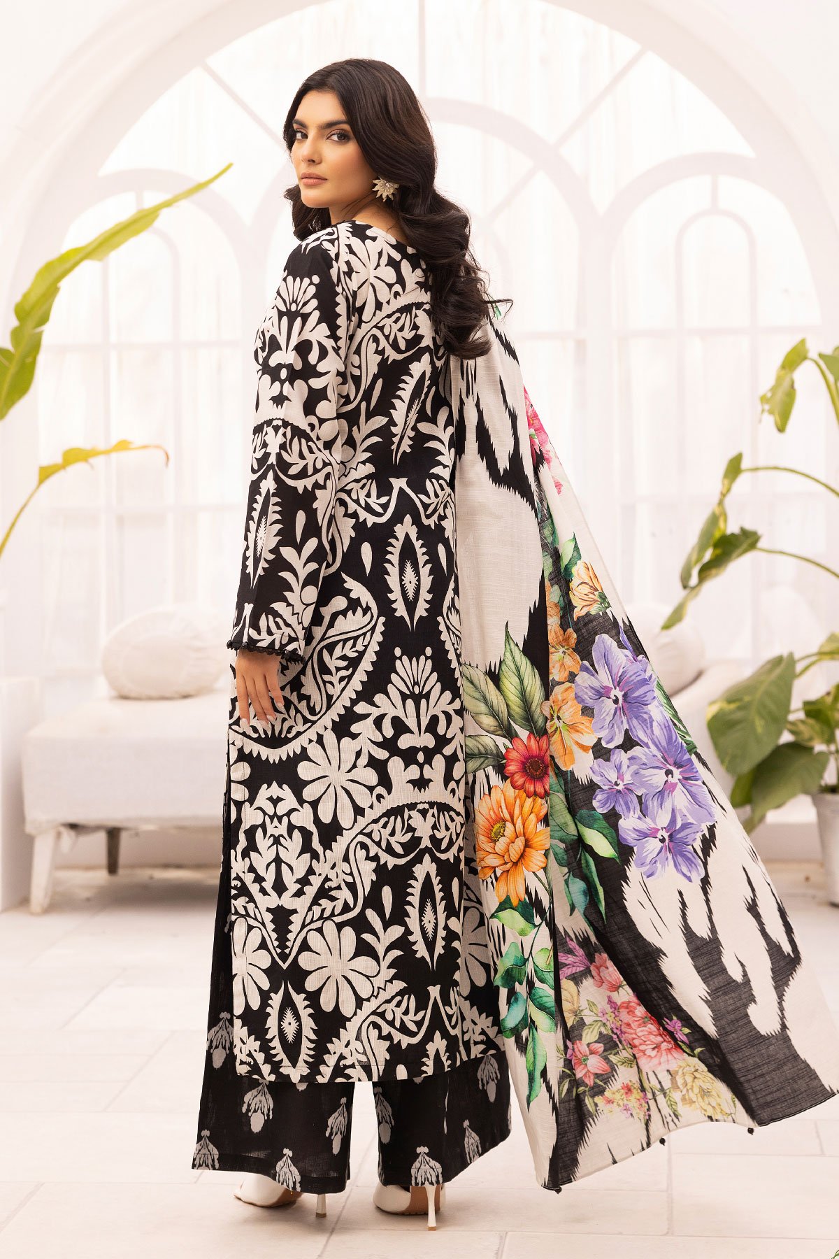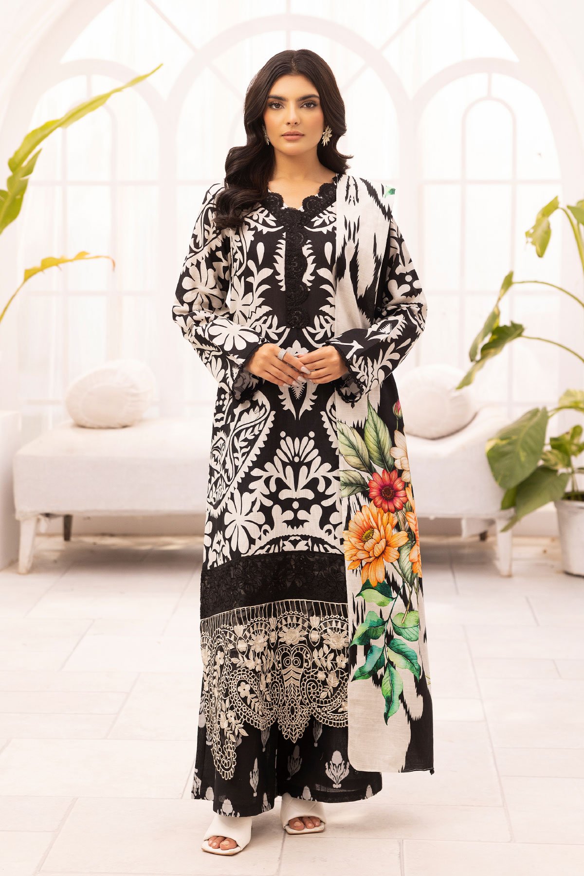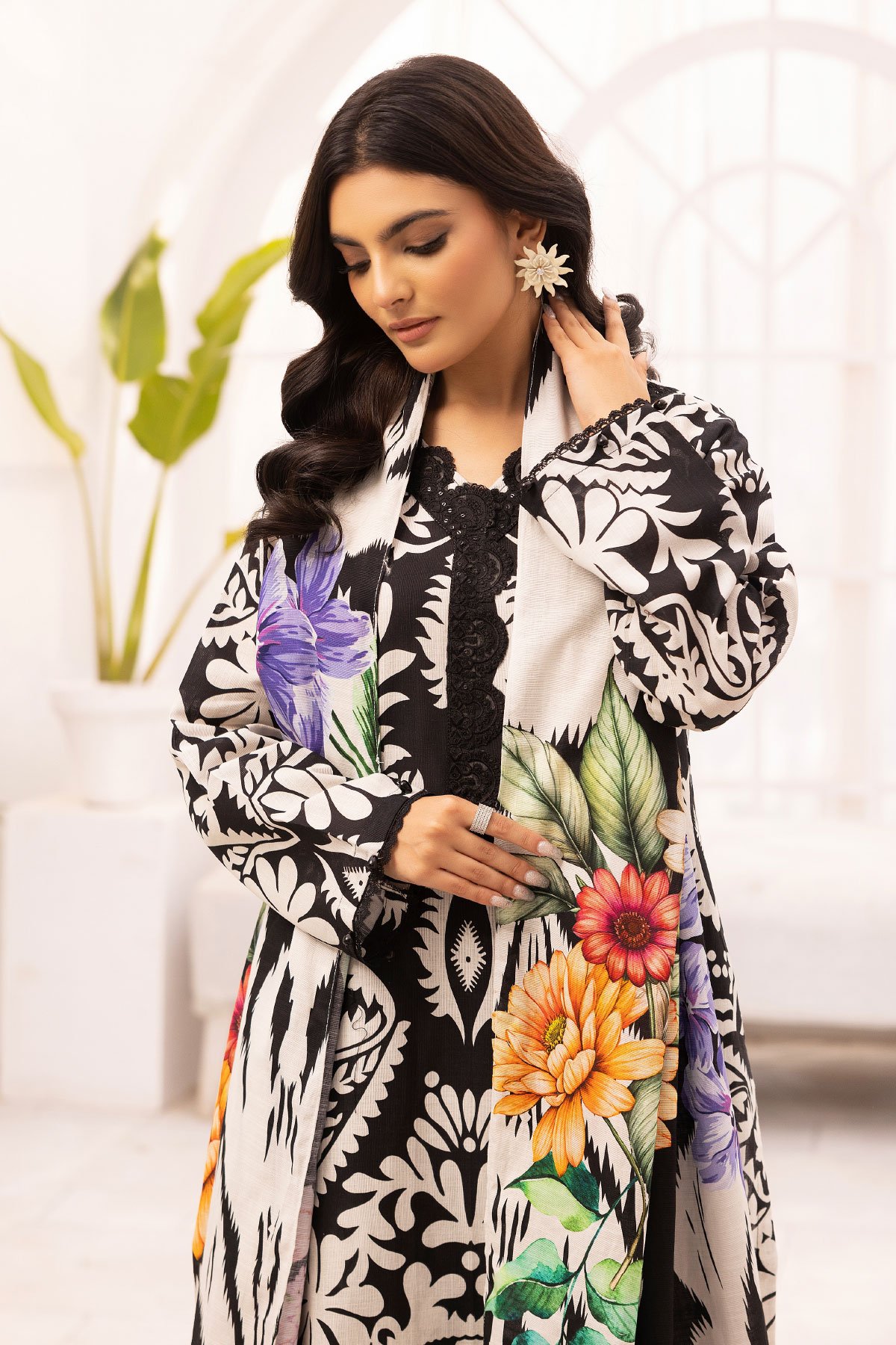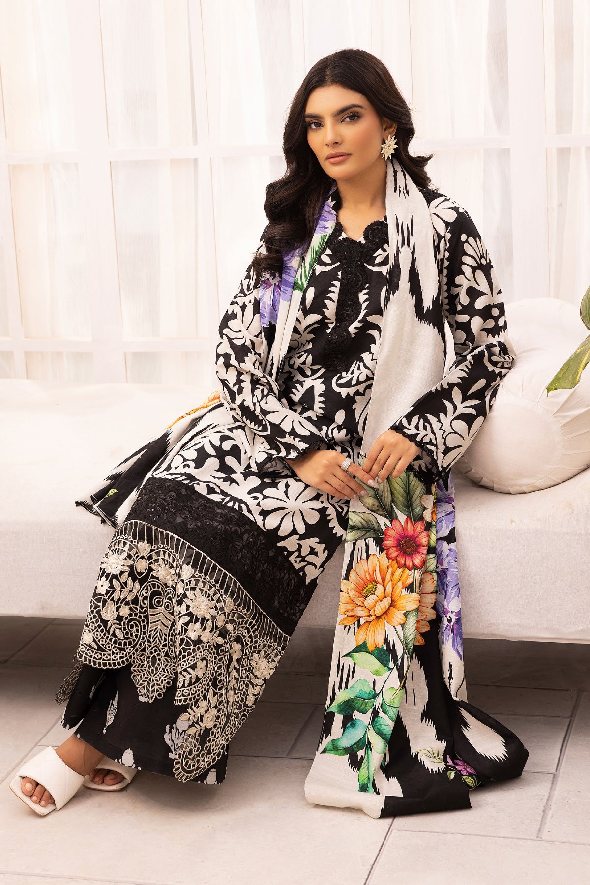 This beautiful 3 piece Aura luxe collection features a straight printed khaddar shirt with lace embellished neckline and embroidered border, finished with full length sleeves. Paired with a printed shalwar and the look is finished with a digital printed khaddar shawl.