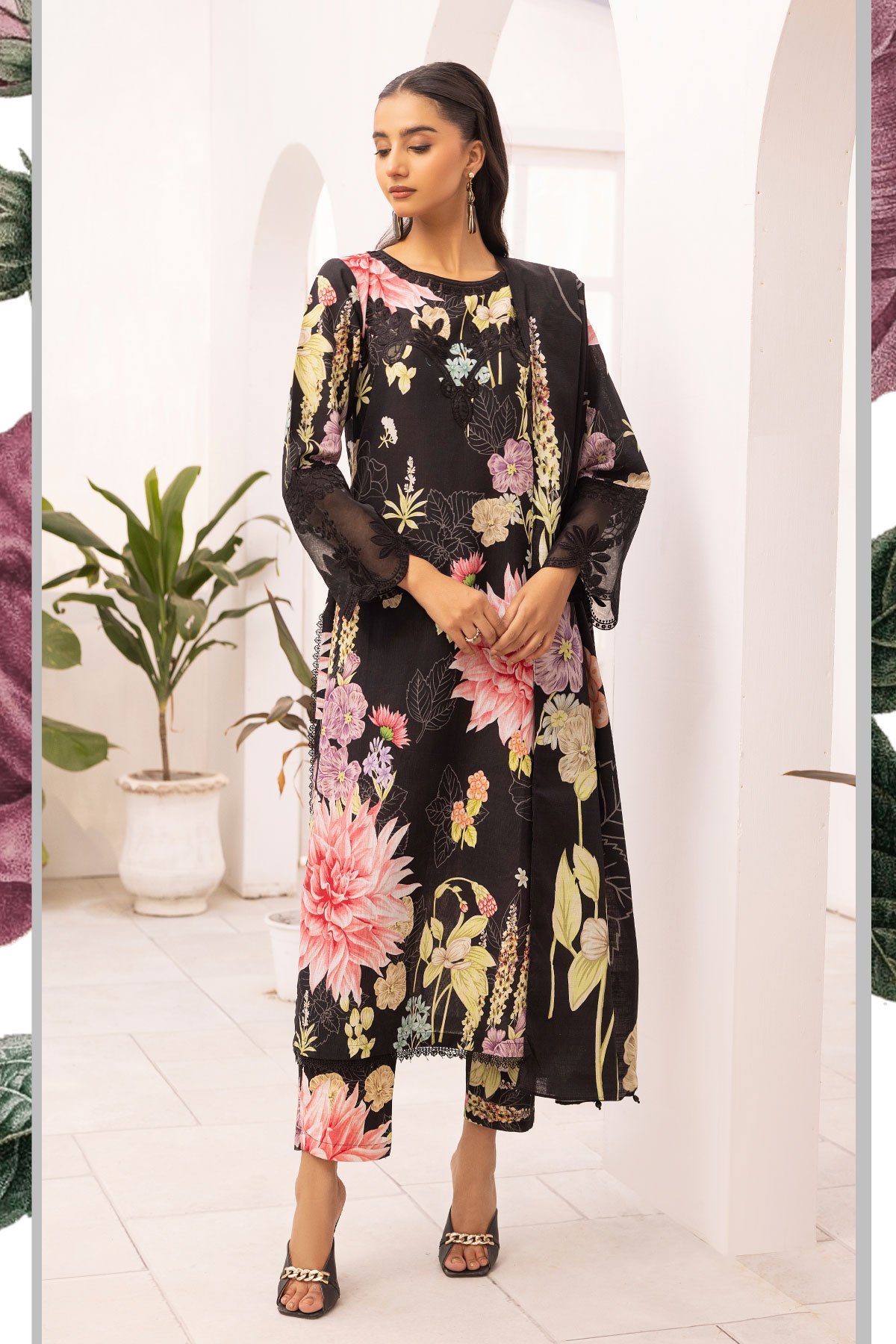 This beautiful 3 piece Aura luxe collection features a straight printed khaddar shirt with thread work embroidery along the front, finished with full length sleeves. Paired with straight leg printed trousers. The look is finished with a khaddar digital printed dupatta.