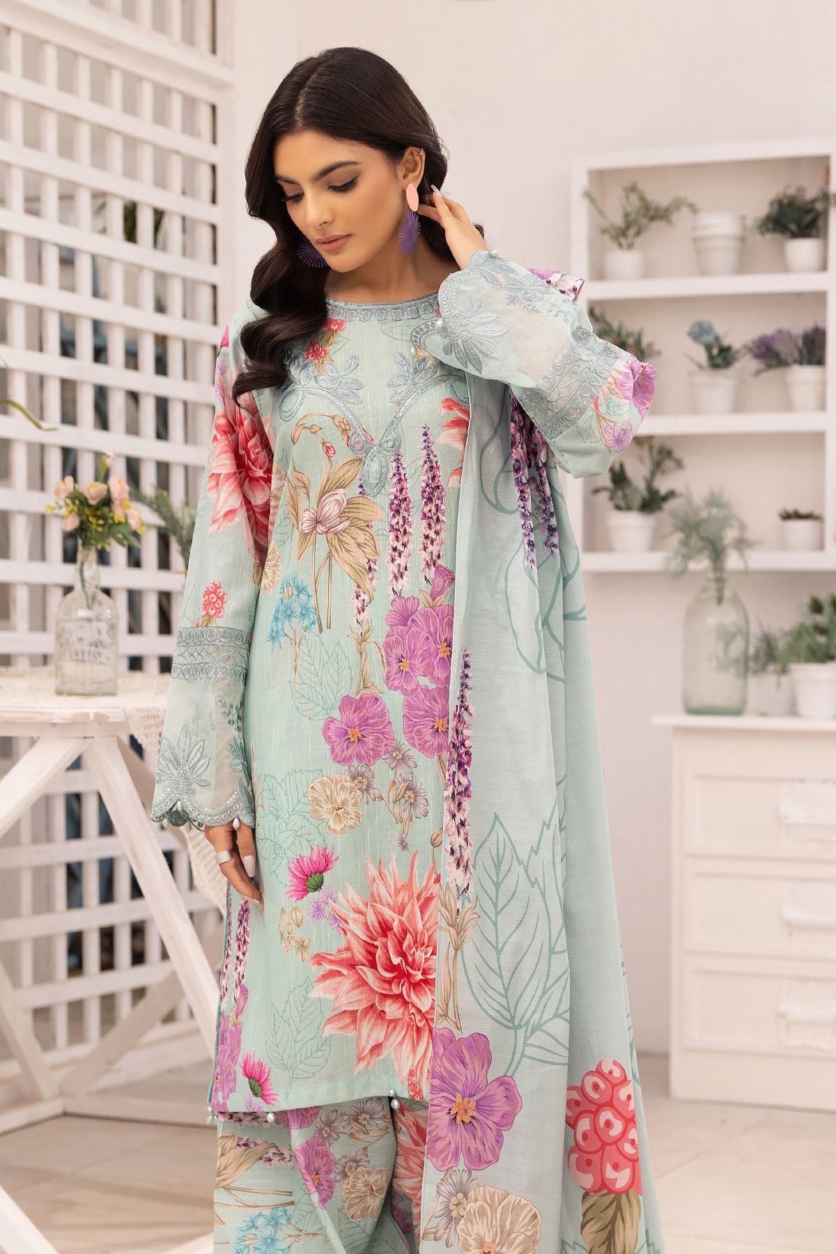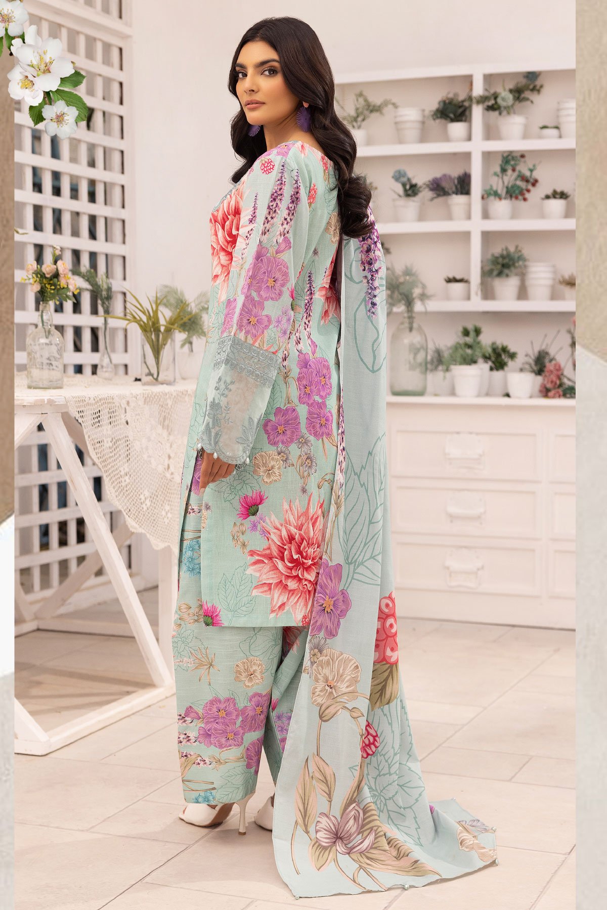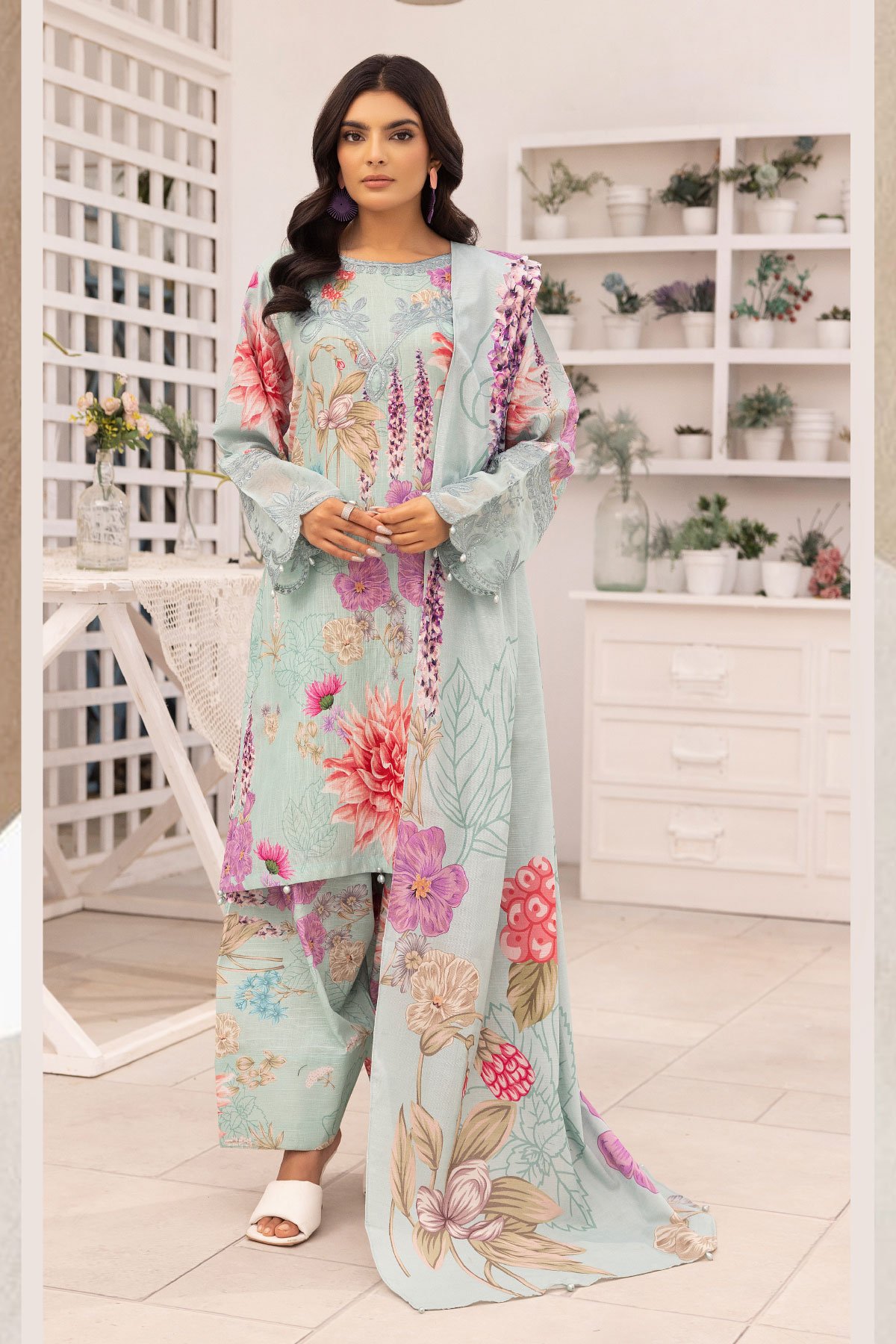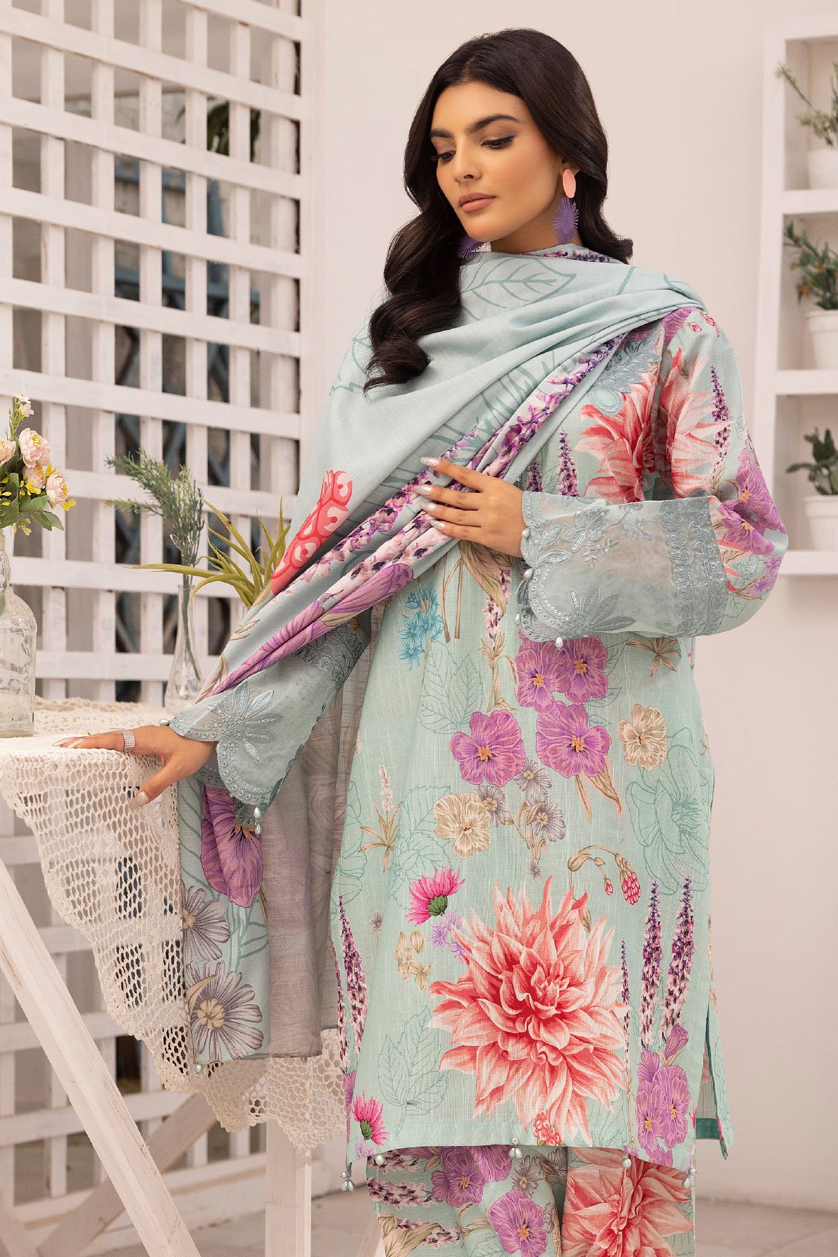 This beautiful 3 piece Aura luxe collection features a straight printed khaddar shirt with thread work embroidered patterns along with sequence embellishments. finished with full length sleeves. Paired with a printed shalwar and the look is finished with a digital printed khaddar shawl.