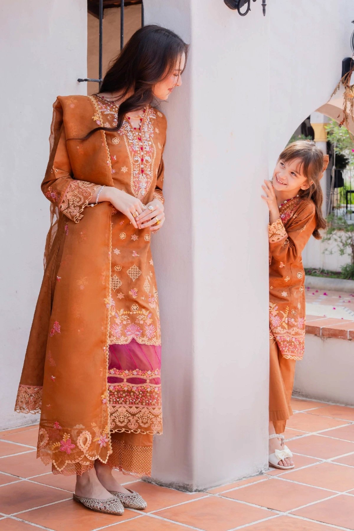 This beautiful 3 piece Aurea kids collection features a straight shirt with luxury thread work embroidery throughout with a contrasted organza applique border along with bead embellishments on the v-neckline. It comes with full length embroidered sleeves. Paired with straight leg trousers and the look is finished with an organza embroidered dupatta. Perfect mother and daughter collection for this Eid.