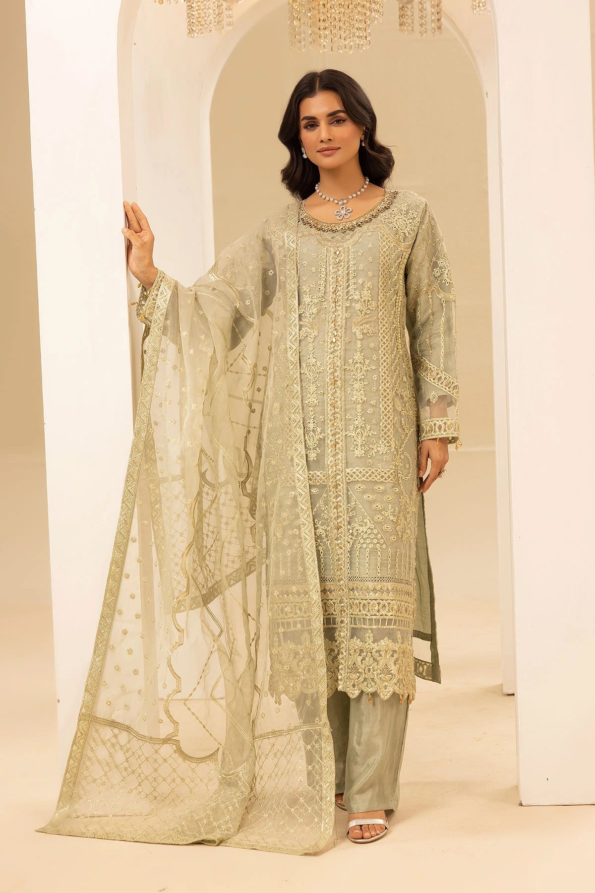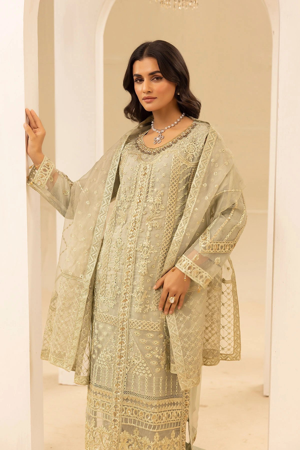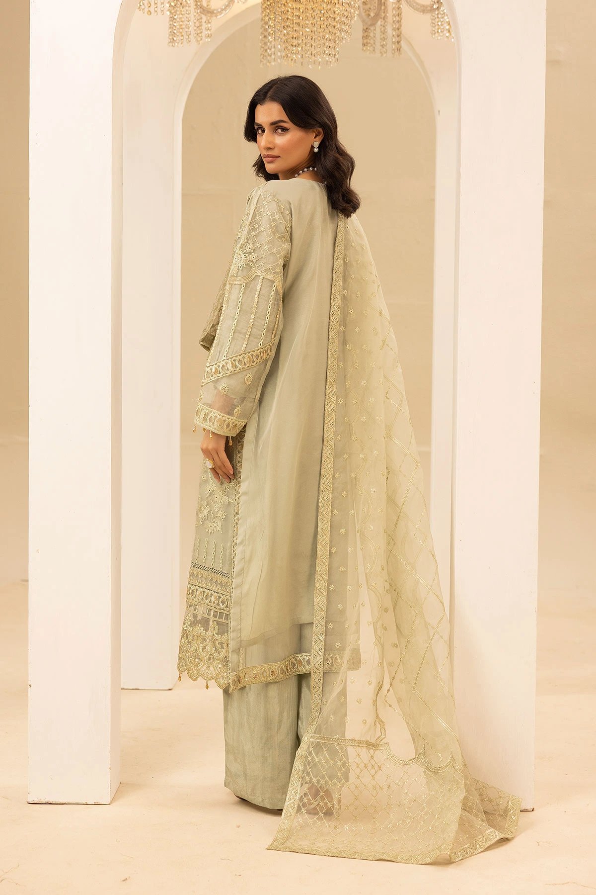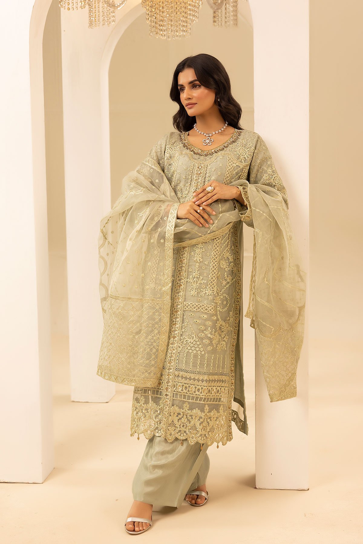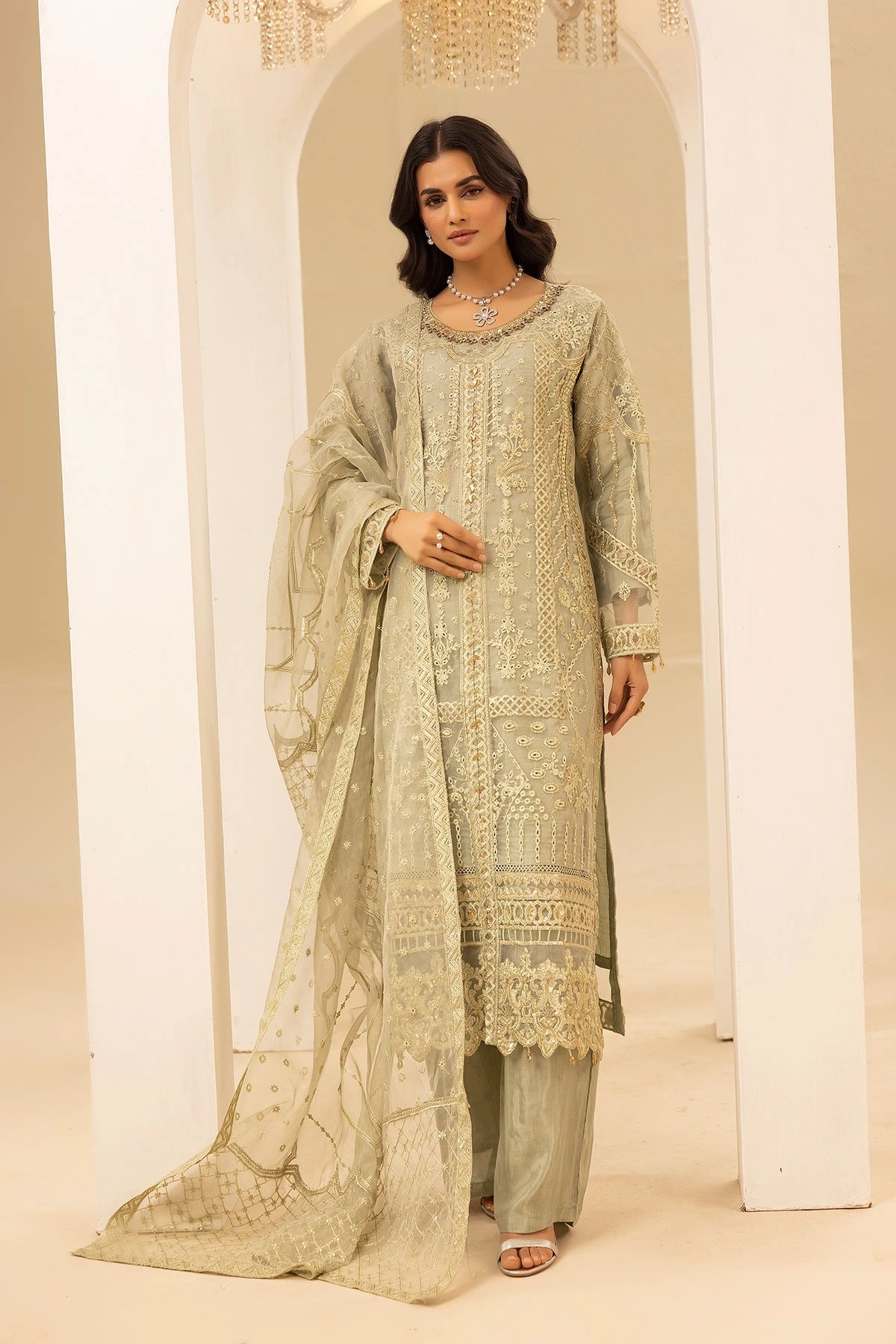 This beautiful 3 piece Aurora collection features a straight organza shirt with luxury thread work embroidery throughout with bead embellishment along the front with sequence work, finished with full length embroidered sleeves. Paired with straight leg trousers and the look is finished with an organza embroidered dupatta. Perfect collection for this Eid.