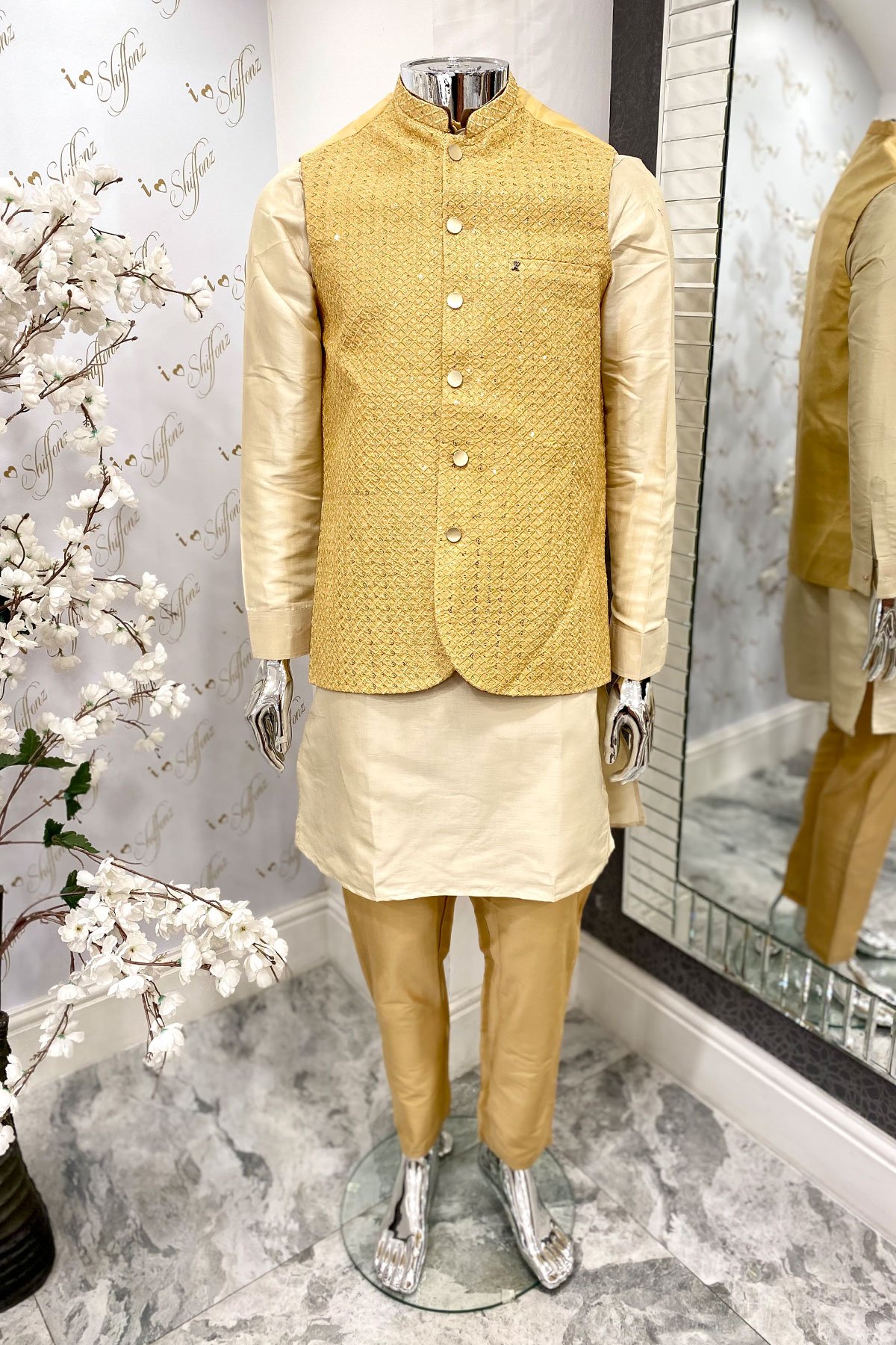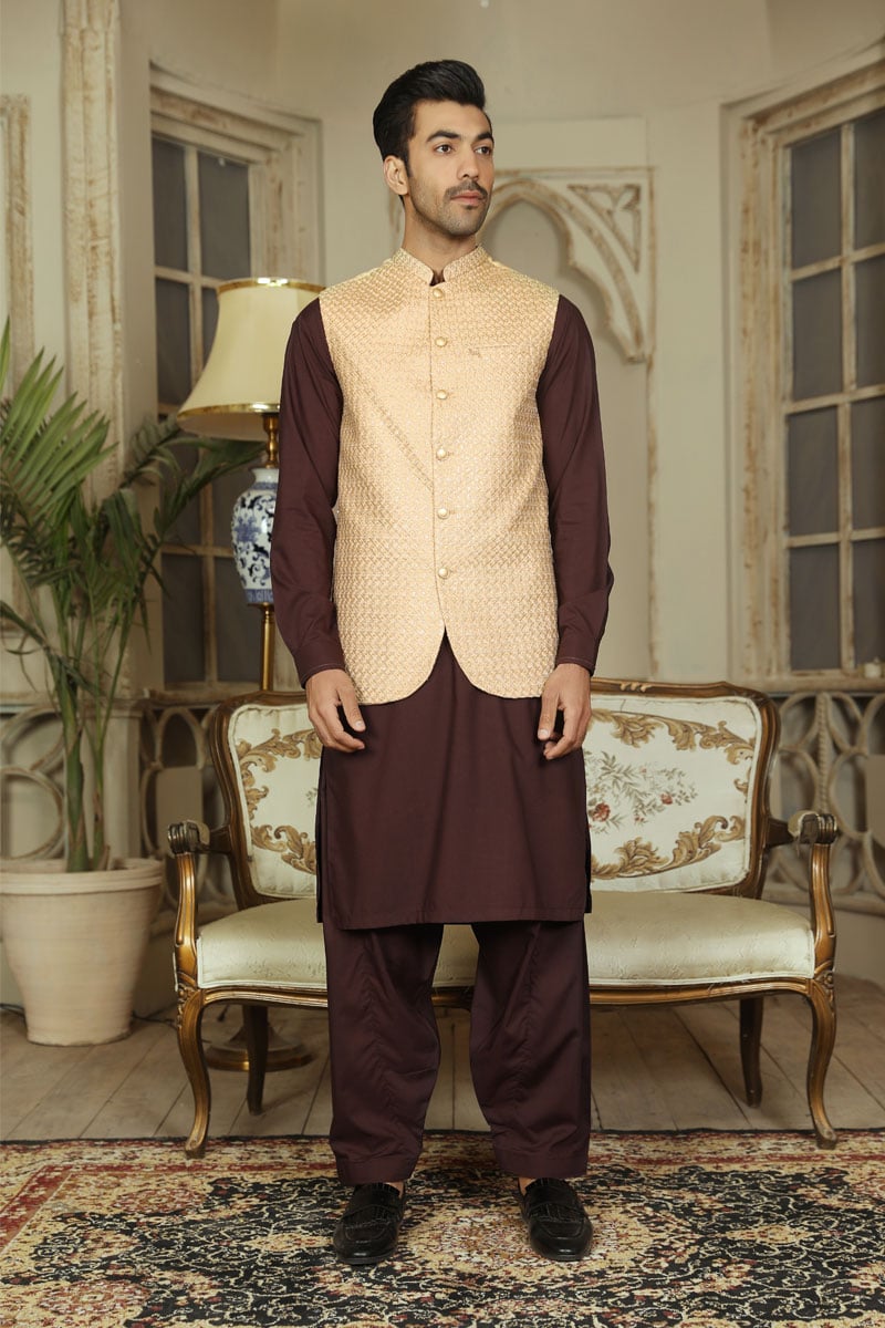 This beautiful waistcoat is crafted from a blend of brocade fabric with thread-work embroidered neck that is enhanced by moulded buttons and mandarin collar along with black sequence embellishments . It is a straight cut that fits easy around the chest and then tapers at the waist creating a broad shoulder-slim waist look. It is perfect for formal occasions as well as layering over basic clothing.