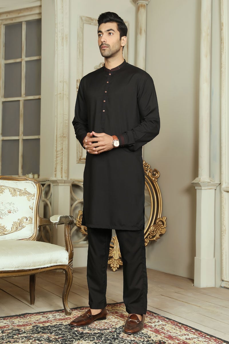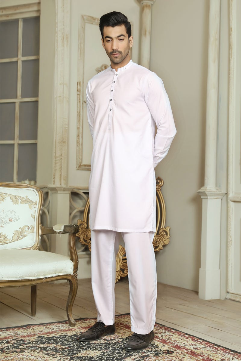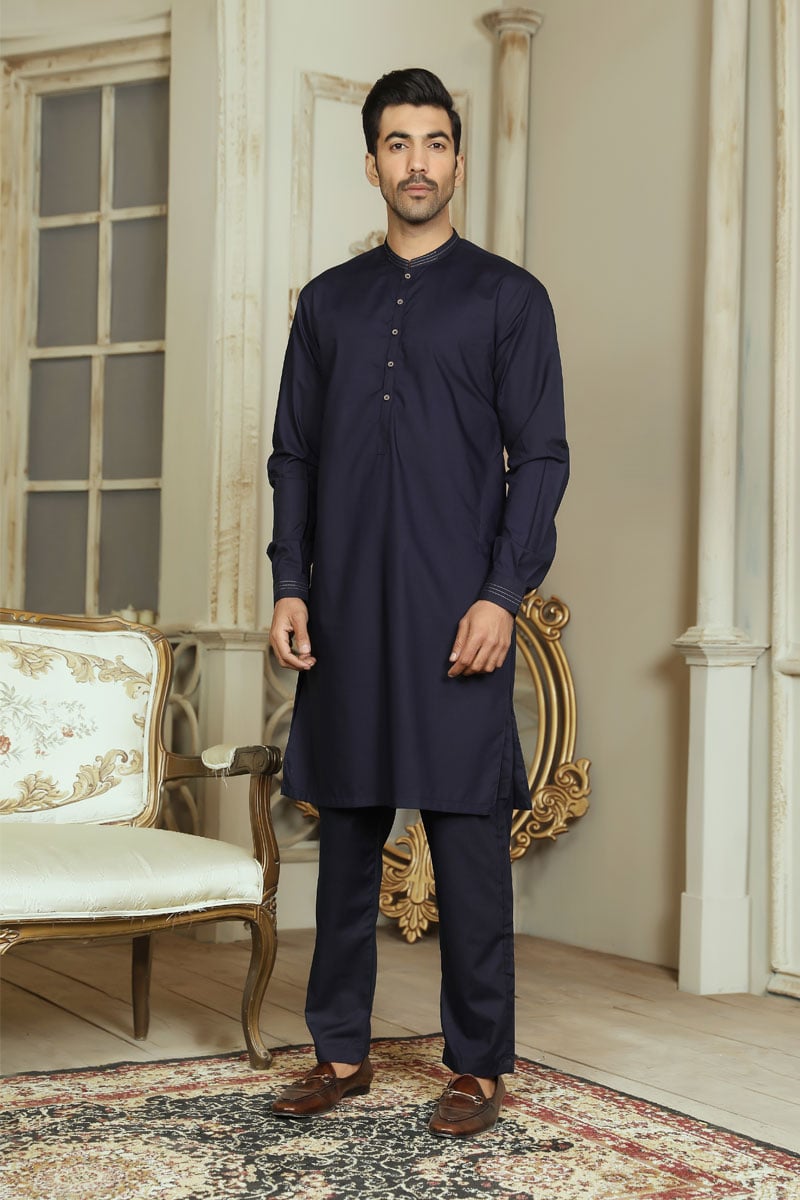 AVI Premium mens collection wash and wear lawn kurta trouser features a straight shirt with detailed  line of thread-work on the ban collar, along with five contemporary buttons which enhances the look. It comes with a full length embellished style cuff, along with additional two buttons to adjust the cuff to your wrist and the look is finished with a plain trouser including pockets. The Kurta approves its softness and comfortable material, which makes it perfect for EID, casual or smart wear. Style up with our AVI mens collection.