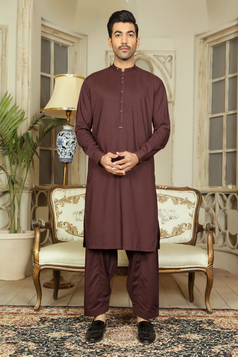 This beautiful mens wash and wear lawn shalwar kameez features a straight shirt with detailed red line of thread-work on the ban collar, along with line of thread-work in red near the five contemporary buttons which enhances the look. It comes with full length sleeves with embellished style cuff, along with additional two buttons to adjust the cuff to your wrist the look is finished with a plain shalwar. The Kurta approves its softness and comfortable material, which makes it perfect for EID, casual or smart wear.