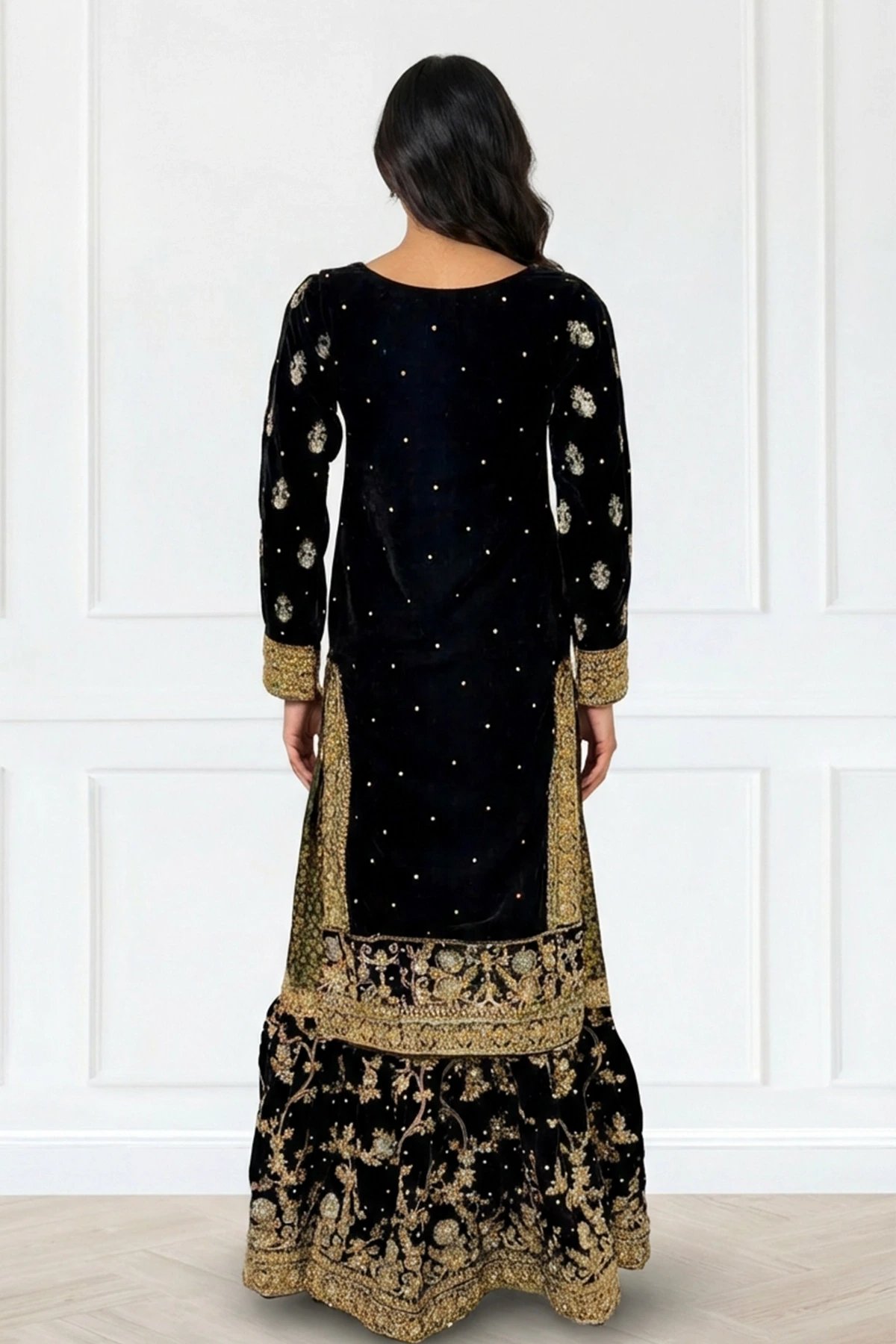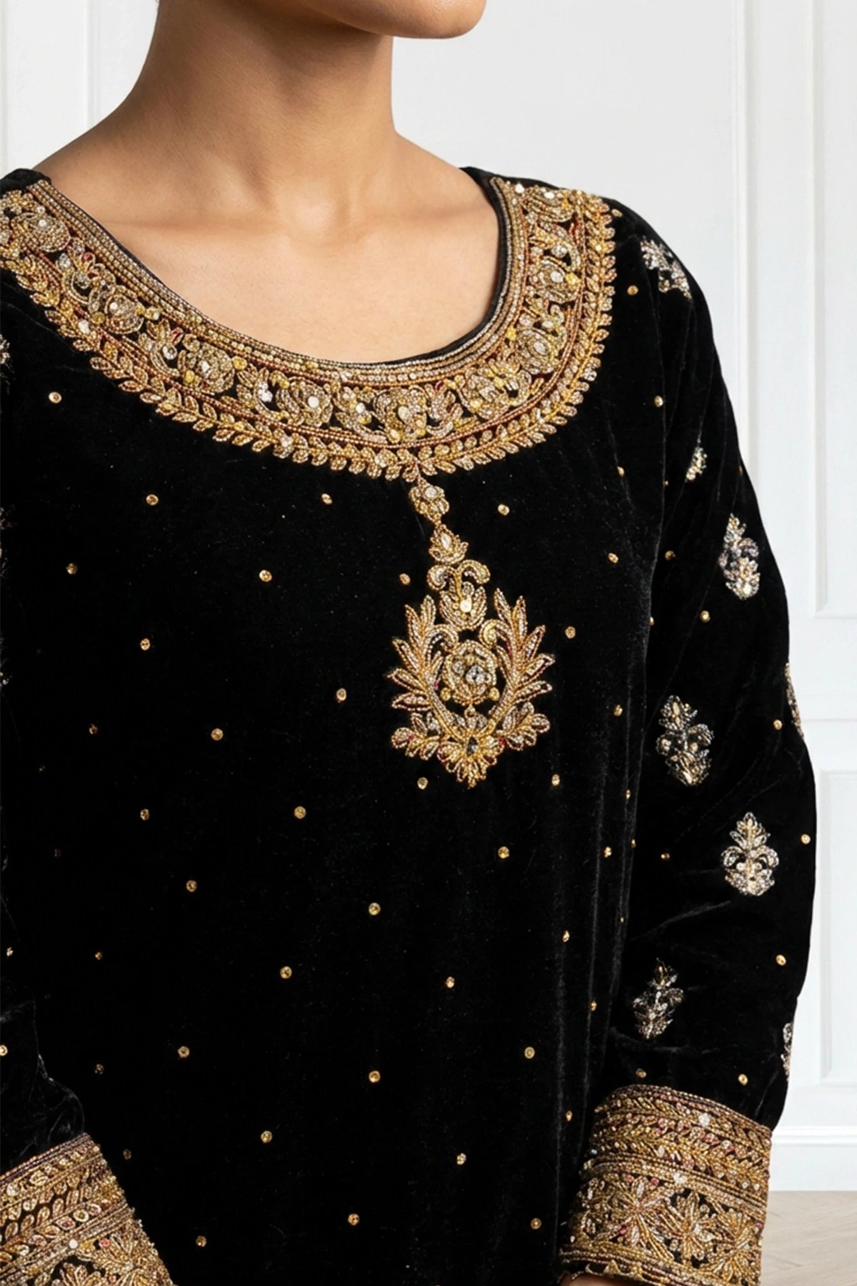 This beautiful 3 piece velvet collection features a straight shirt with luxury thread work embroidery throughout with diamantes embellishments, finished with full length embroidered sleeves. Paired with a jamavar green printed lengha with a velvet embroidered border. The look is finished with a net embroidered dupatta.
