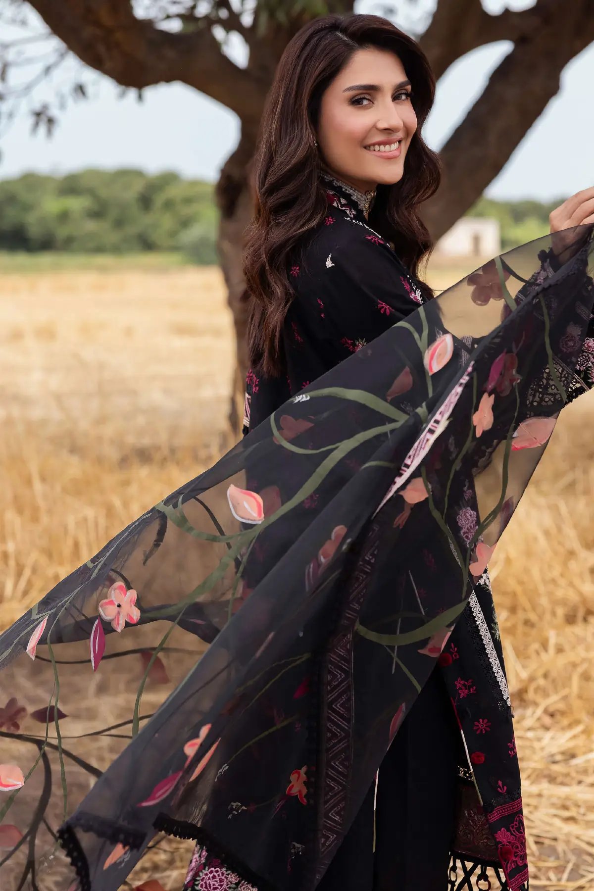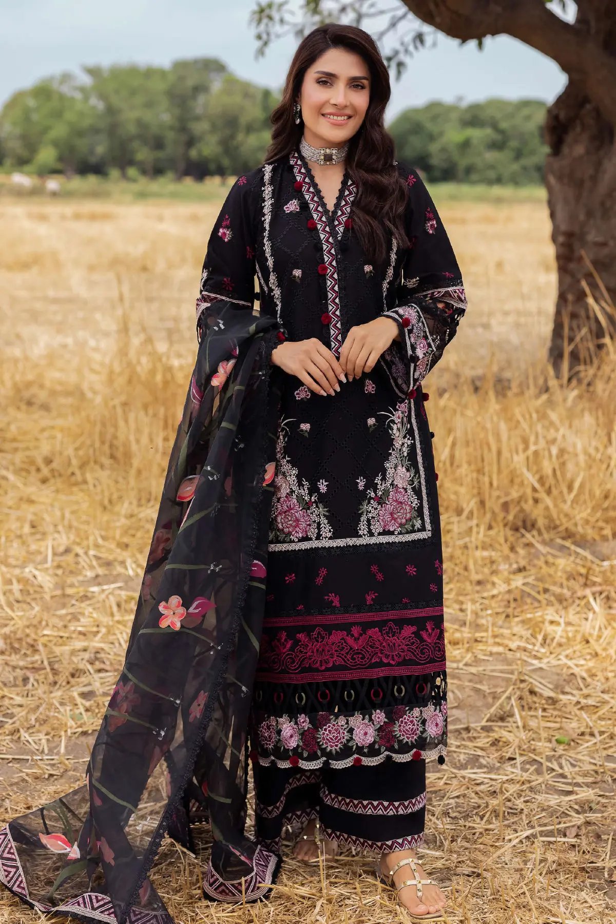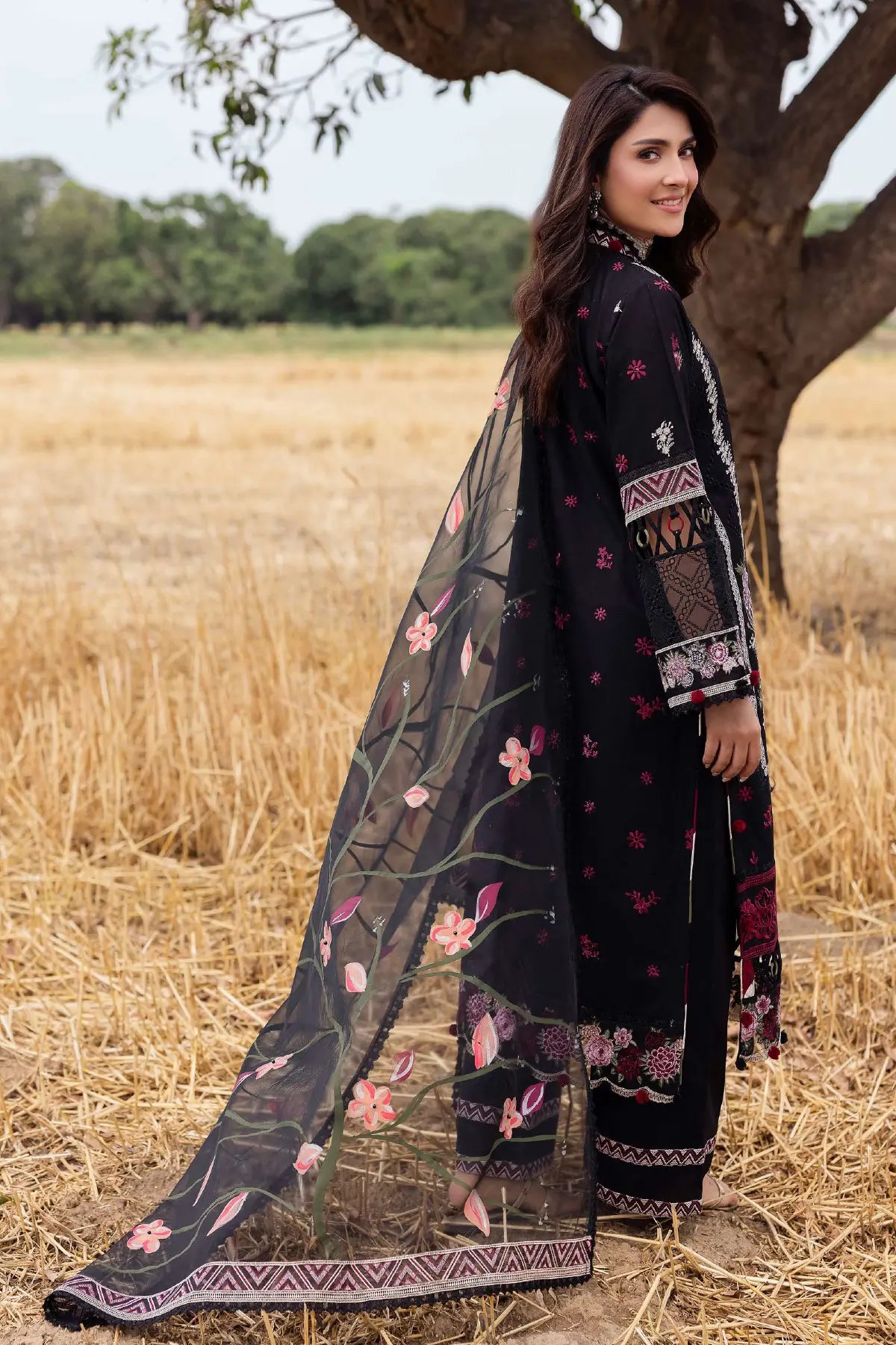 This beautiful 3 piece Heer collection features a straight shirt with luxury thread work embroidery throughout with cut design piping embellishment on the border and full length embroidered sleeves. Paired with wide leg embroidered trousers. The look is finished with an embroidered organza dupatta. Perfect casual festive wear for this Eid.