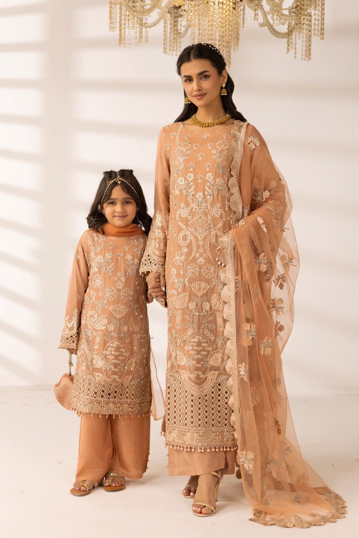 This beautiful 3 piece Ayra kids collection features a straight shirt with luxury thread work embroidery throughout with bead embellishments on the front, finished with full length embroidered sleeves. Paired with straight leg crepe trousers. The look is finished with an embroidered net dupatta. Perfect mother and daughter collection for this Eid.