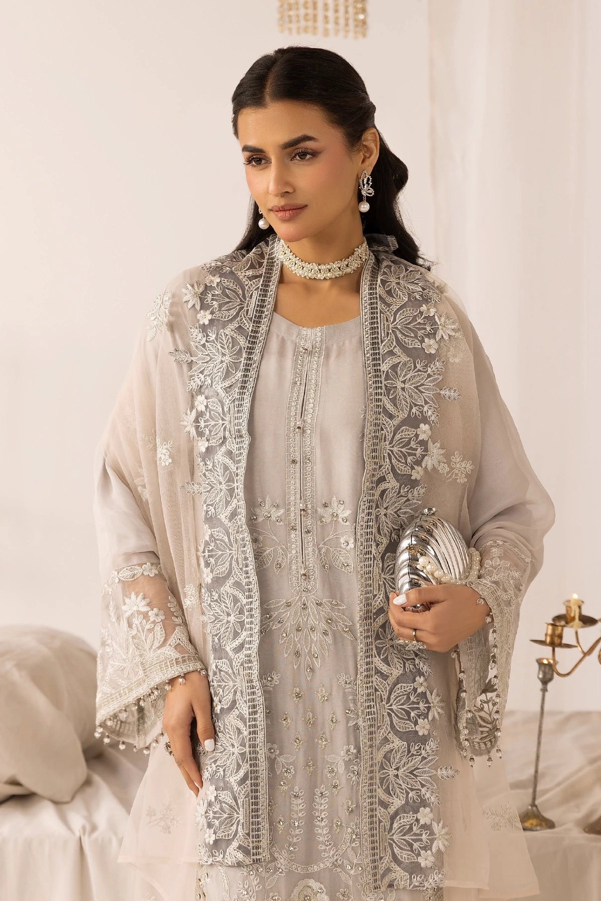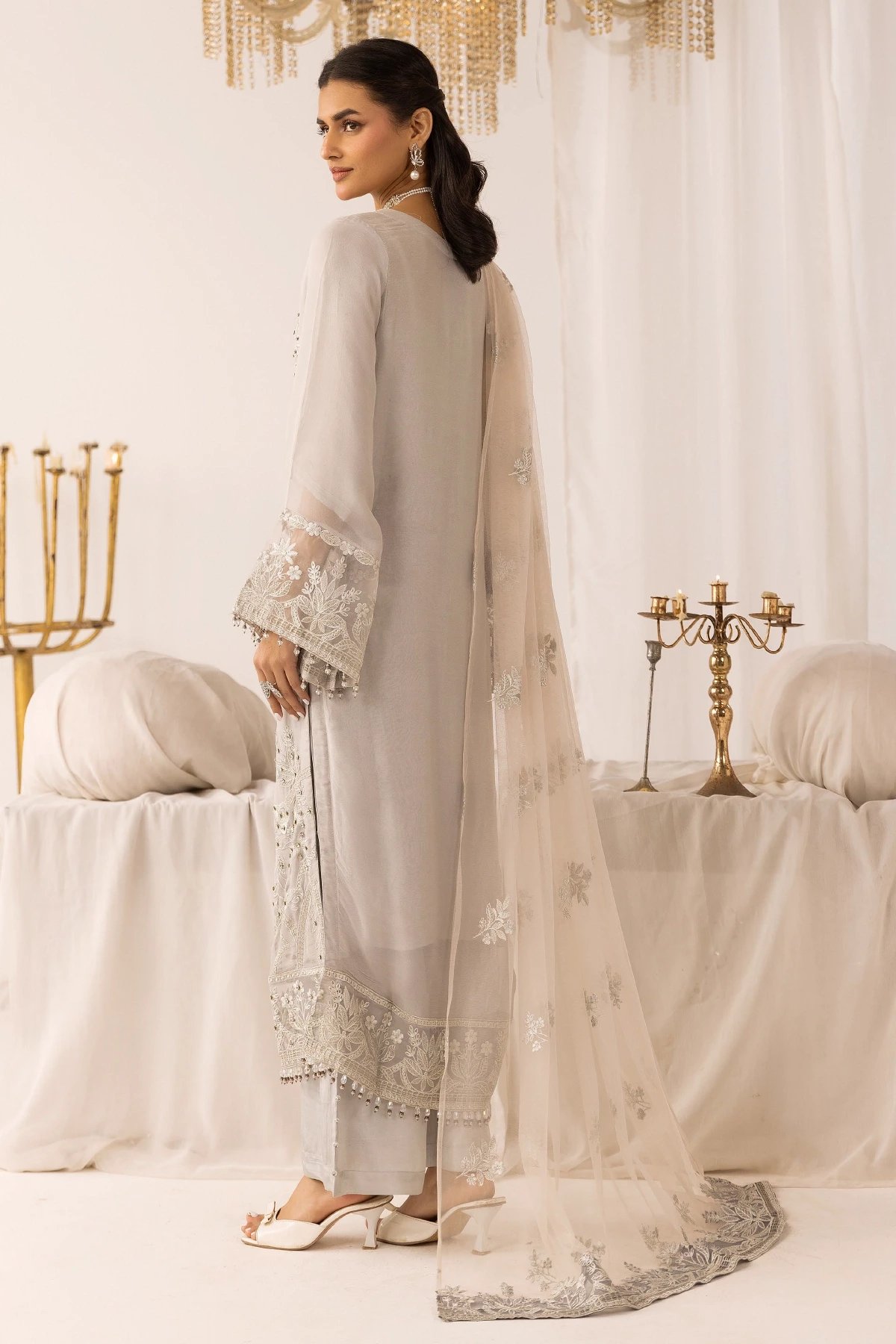 This beautiful 3 piece Ayra collection features a straight shirt with luxury thread work embroidery throughout with bead embellishments on the front, finished with full length embroidered sleeves. Paired with straight leg crepe trousers. The look is finished with a contrasted embroidered organza dupatta. Perfect mother and daughter collection for this Eid.