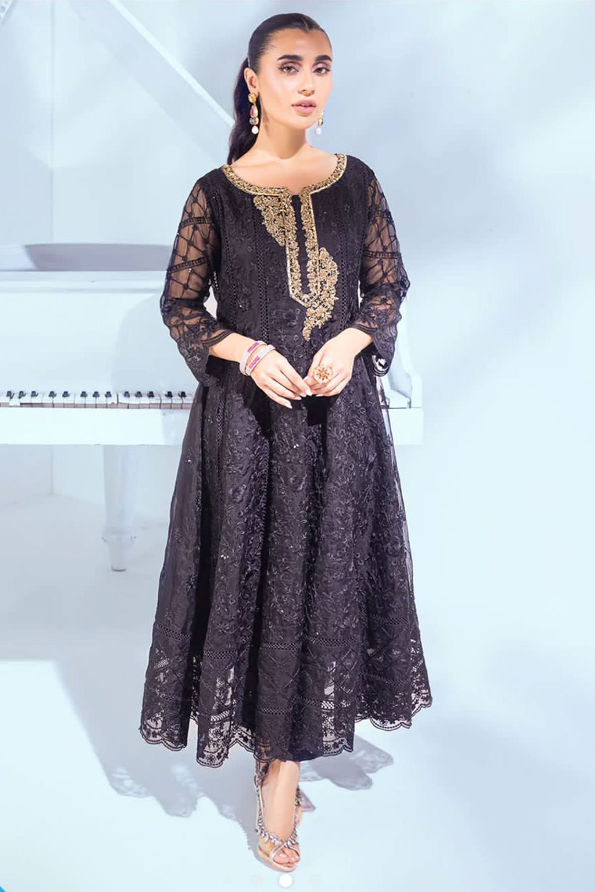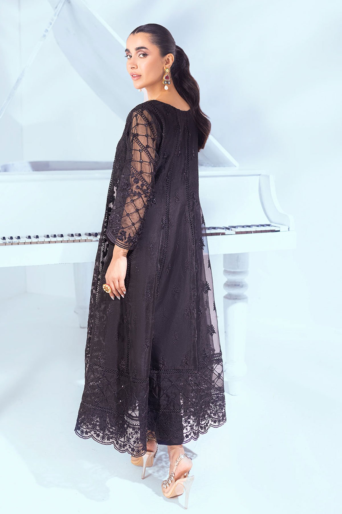 “Dream Fairy” is a long kalidaar frock portrayed on a stunning black embroidered organza canvas. The neckline is enriched with gorgeous hand embellishments of the kora, dabka, and sequins ethereally uplifting the look. Paired with crepe straight pleated pants create an opulent silhouette to make you look, like a style diva this festive season.