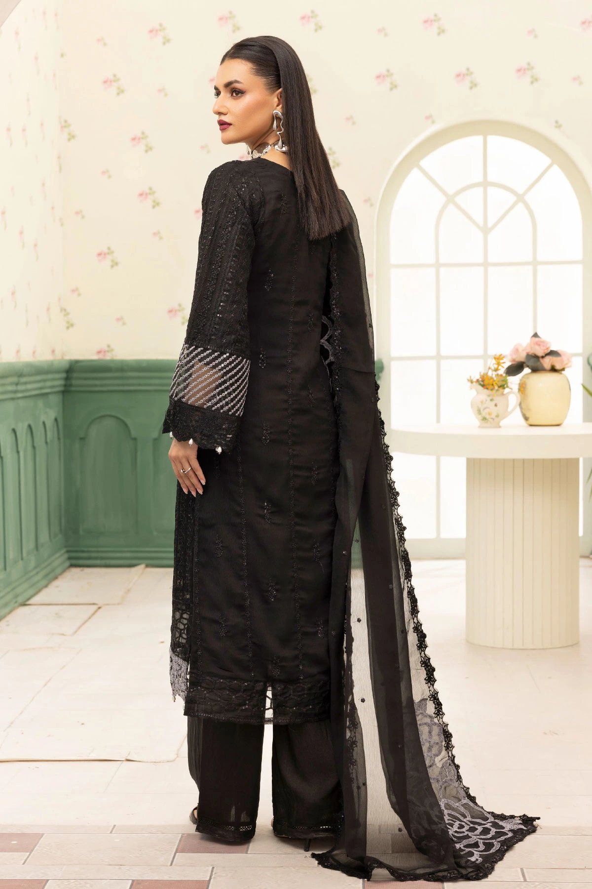 This beautiful 3 piece chiffon suit features a straight shirt with luxury thread work embroidery with sequence embellishment throughout with a contrasted lace embroidered border with dangling beads. It comes with full length embroidered sleeves and paired with straight leg trousers. The looks finished with a chiffon embroidered dupatta. Perfect festive collection for this wedding season.