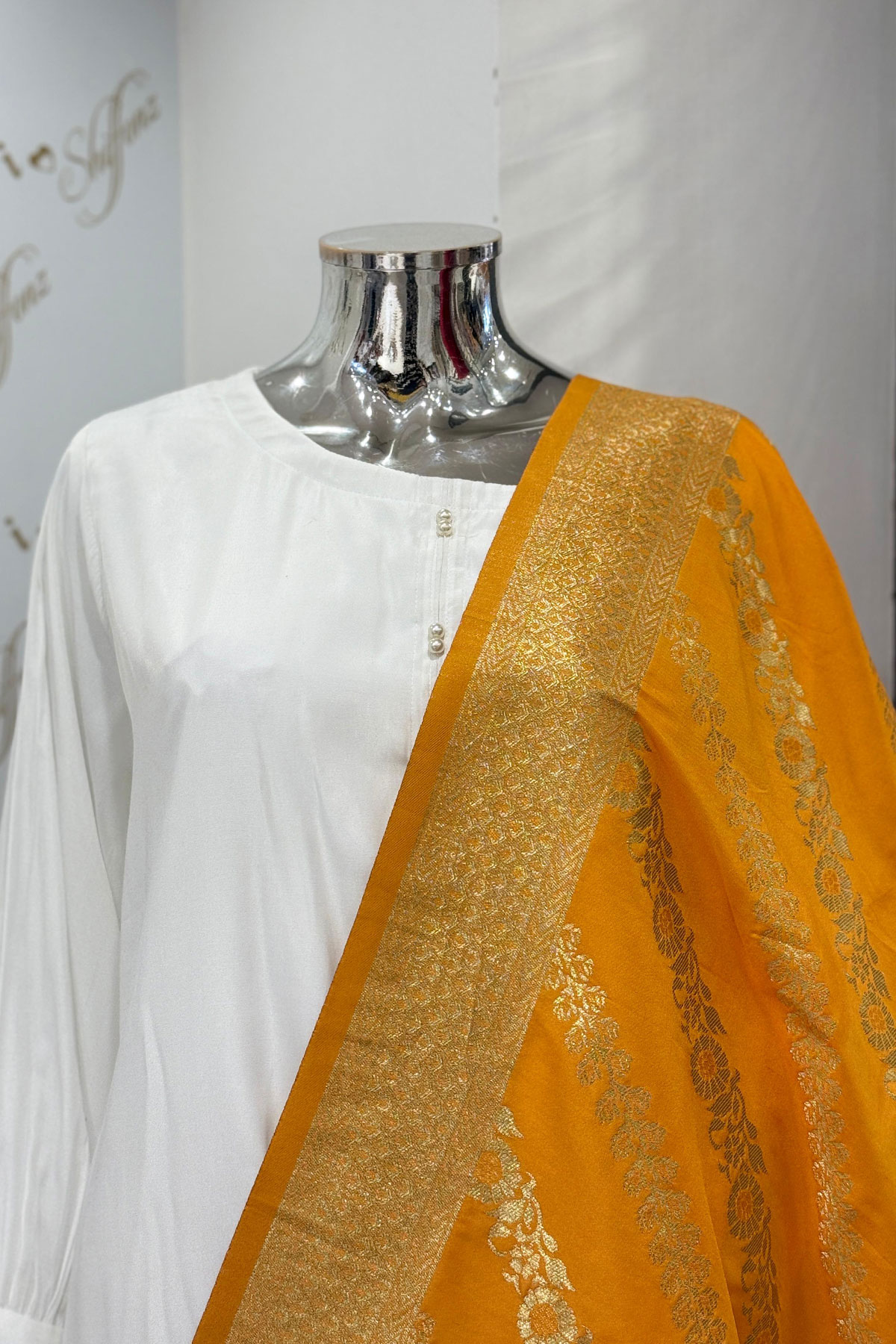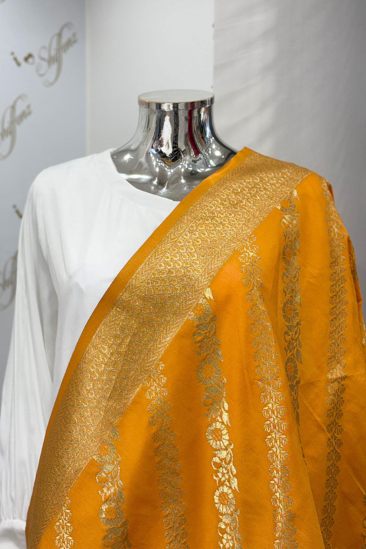 Add a touch of elegance to your wardrobe with this exquisite piece crafted from lightweight, sheer material that offers a delicate drape with banarsi printed patterns and feature a graceful width, perfect for layering. Adorned with intricate borders, they elevate any outfit for weddings or festive occasions.