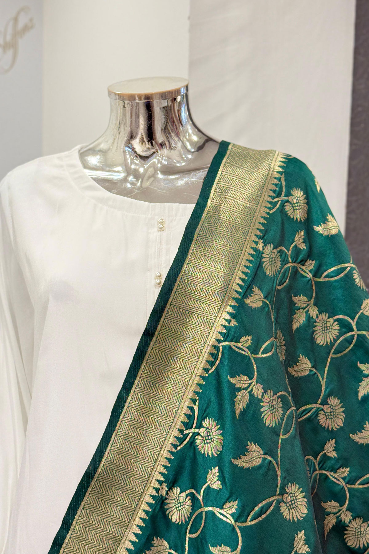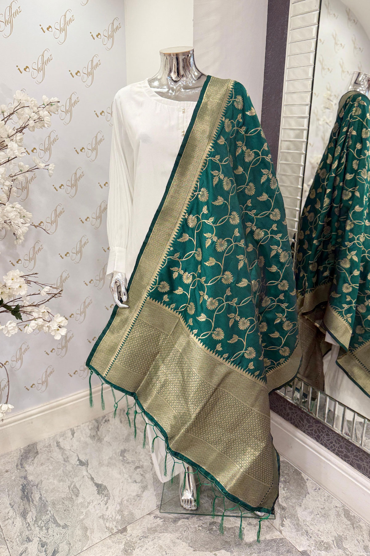 Add a touch of elegance to your wardrobe with this exquisite piece crafted from lightweight, sheer material that offers a delicate drape with banarsi printed patterns and feature a graceful width, perfect for layering. Adorned with intricate borders, they elevate any outfit for weddings or festive occasions.