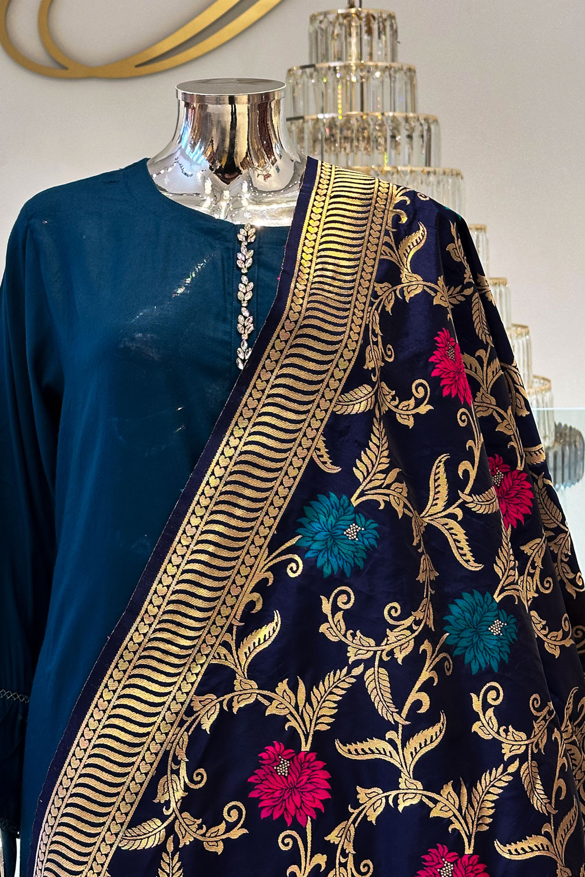 Add a touch of elegance to your wardrobe with this exquisite piece crafted from lightweight, sheer material that offers a delicate drape with banarsi printed patterns and feature a graceful width, perfect for layering. Adorned with intricate borders, they elevate any outfit for weddings or festive occasions.