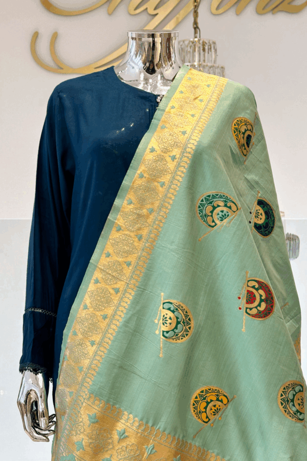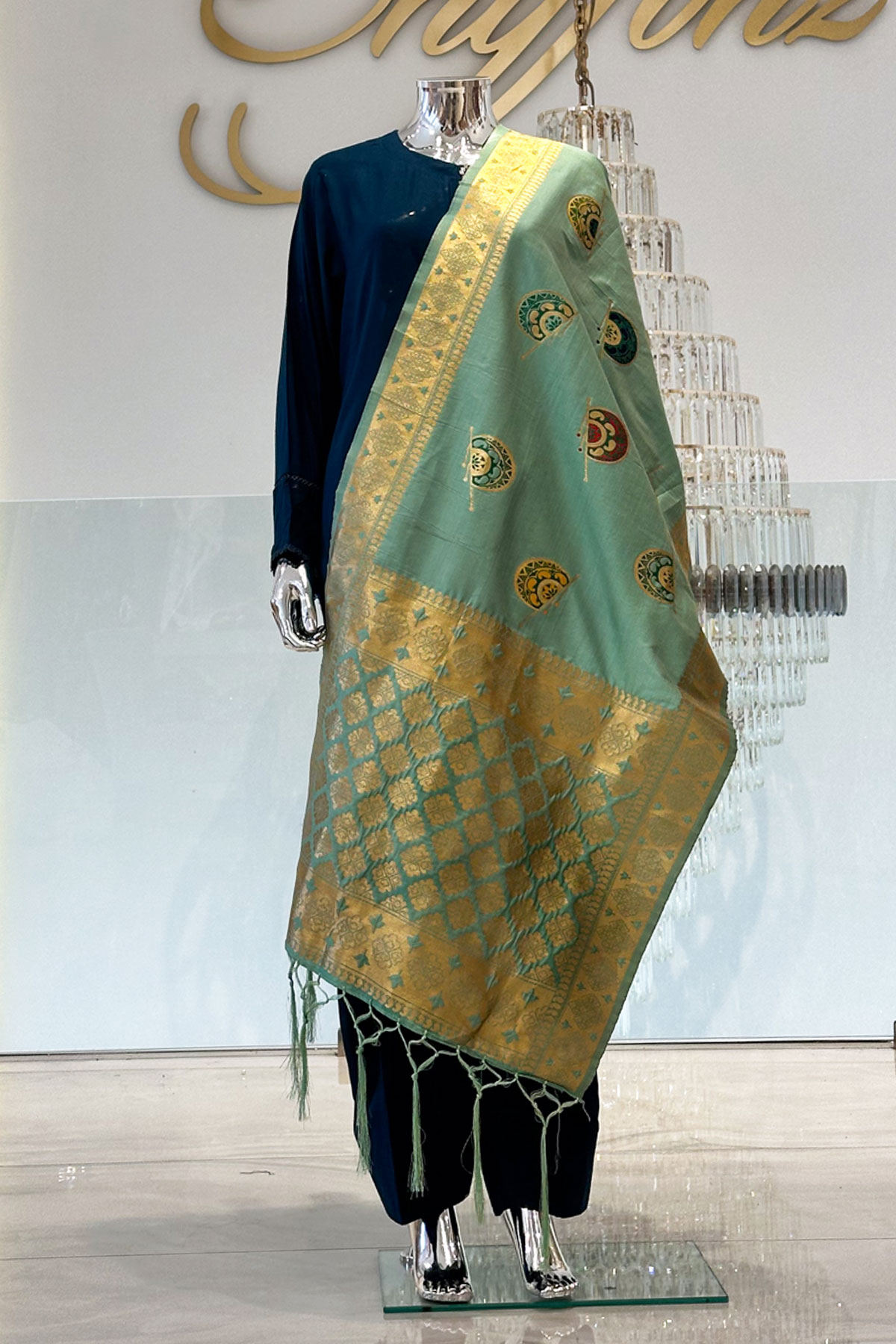 Add a touch of elegance to your wardrobe with this exquisite piece crafted from lightweight, sheer material that offers a delicate drape with banarsi printed patterns and feature a graceful width, perfect for layering. Adorned with intricate borders, they elevate any outfit for weddings or festive occasions.