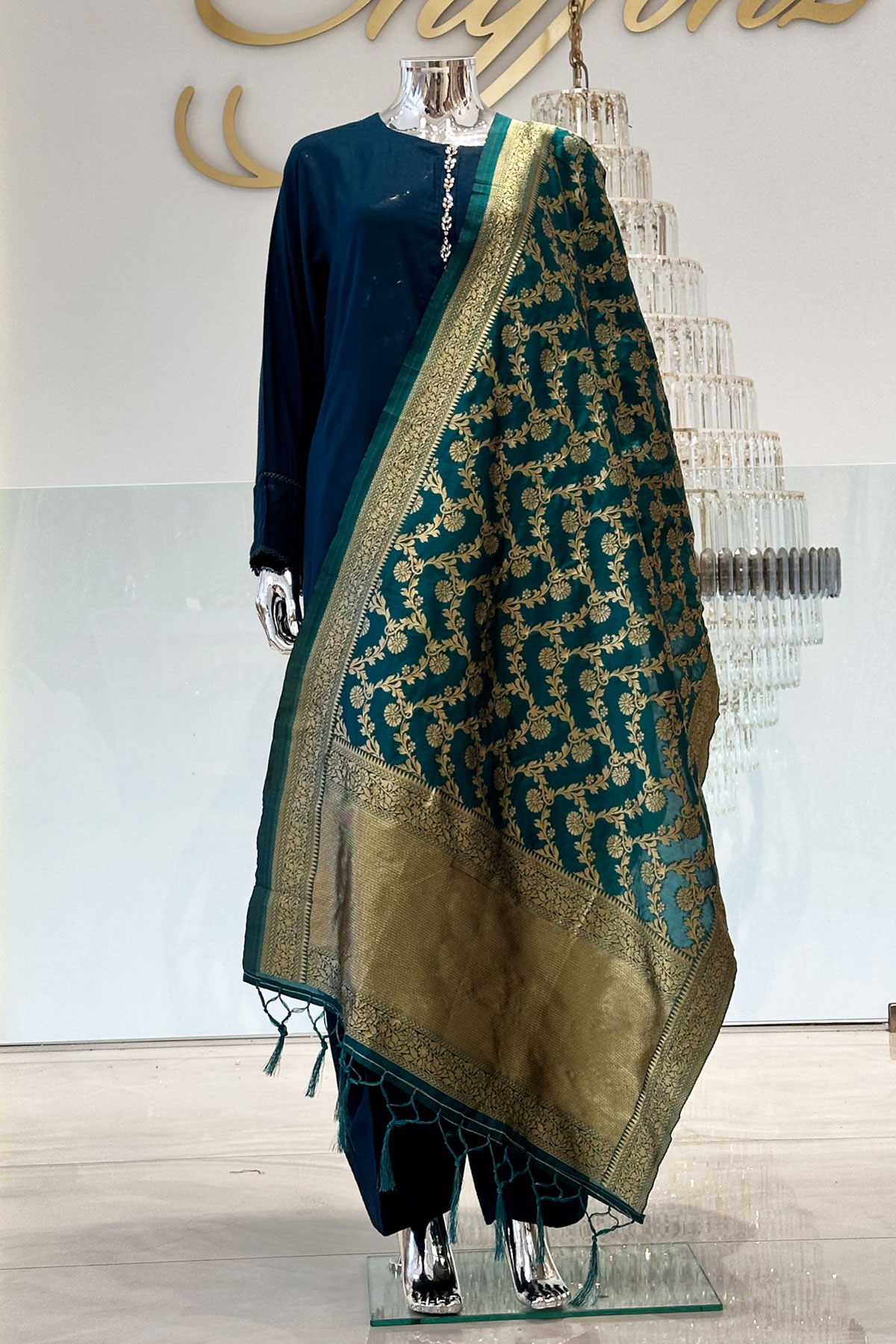 Add a touch of elegance to your wardrobe with this exquisite piece crafted from lightweight, sheer material that offers a delicate drape with banarsi printed patterns and feature a graceful width, perfect for layering. Adorned with intricate borders, they elevate any outfit for weddings or festive occasions.