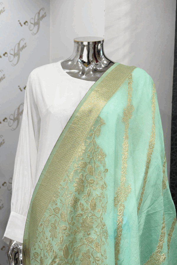 Add a touch of elegance to your wardrobe with this exquisite piece crafted from lightweight, sheer material that offers a delicate drape with banarsi printed patterns and feature a graceful width, perfect for layering. Adorned with intricate borders, they elevate any outfit for weddings or festive occasions.