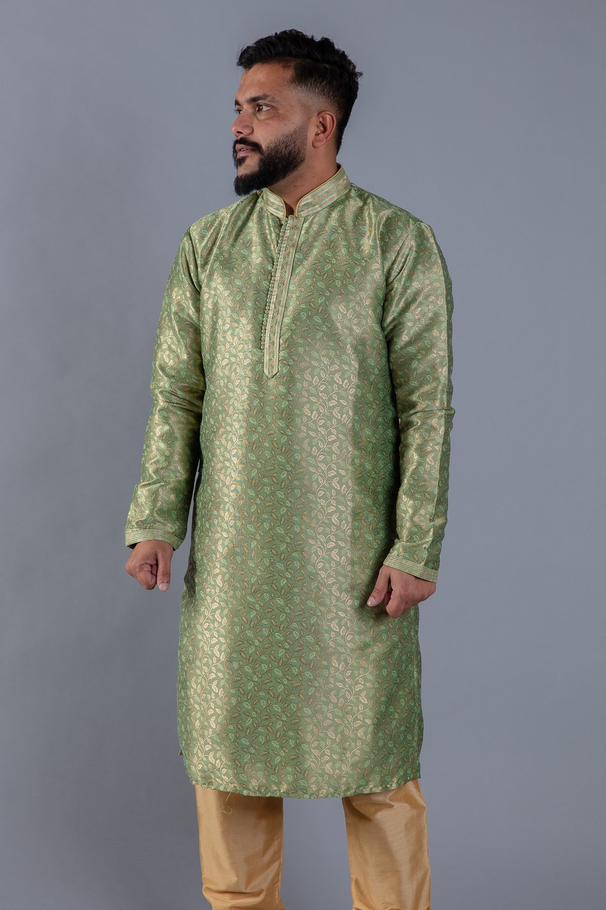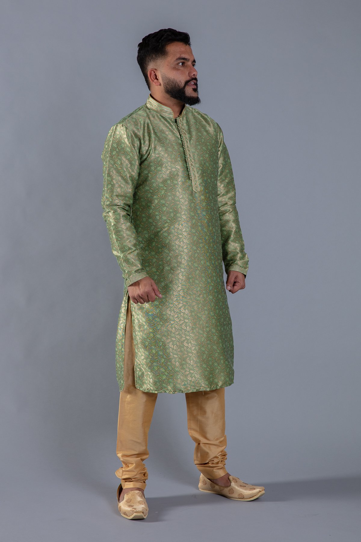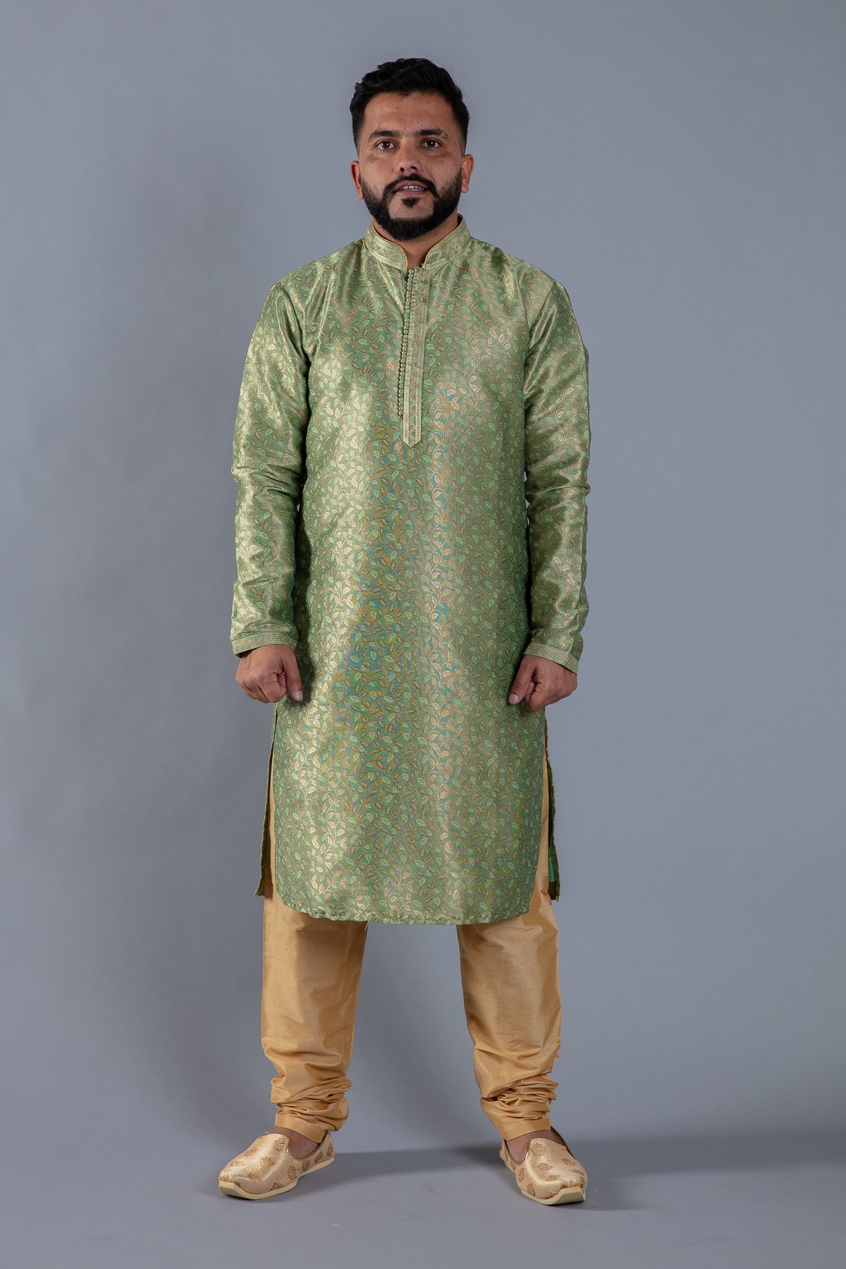 This beautiful 2 piece men’s suit features a banarsi printed kurta with button embellishments on the front along with an embroidered collar. The look is finished with a dupion silk churidaar.