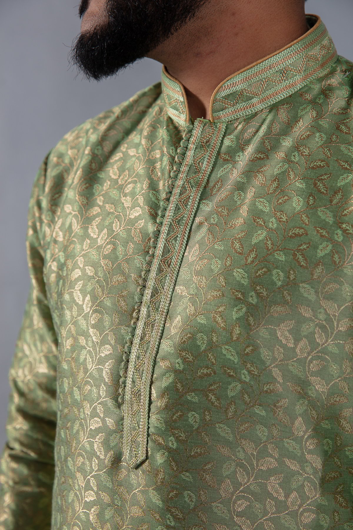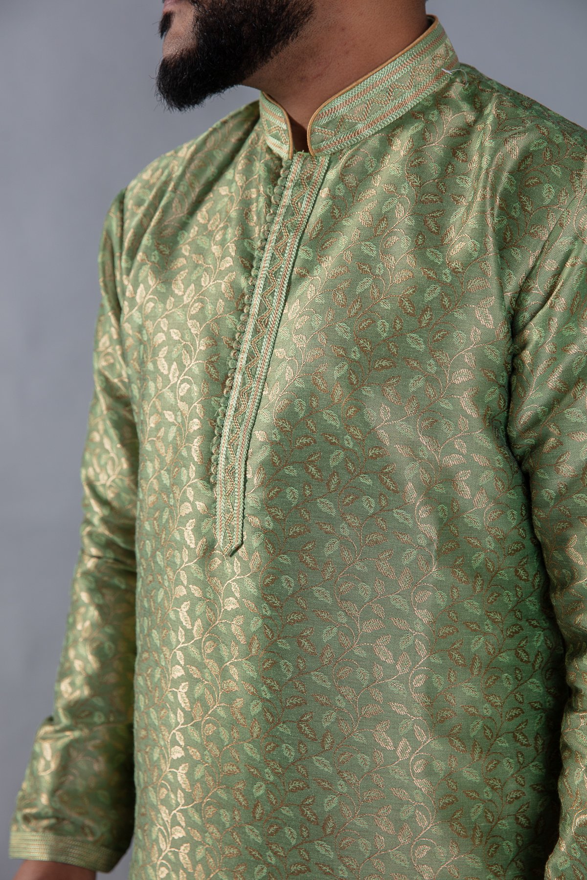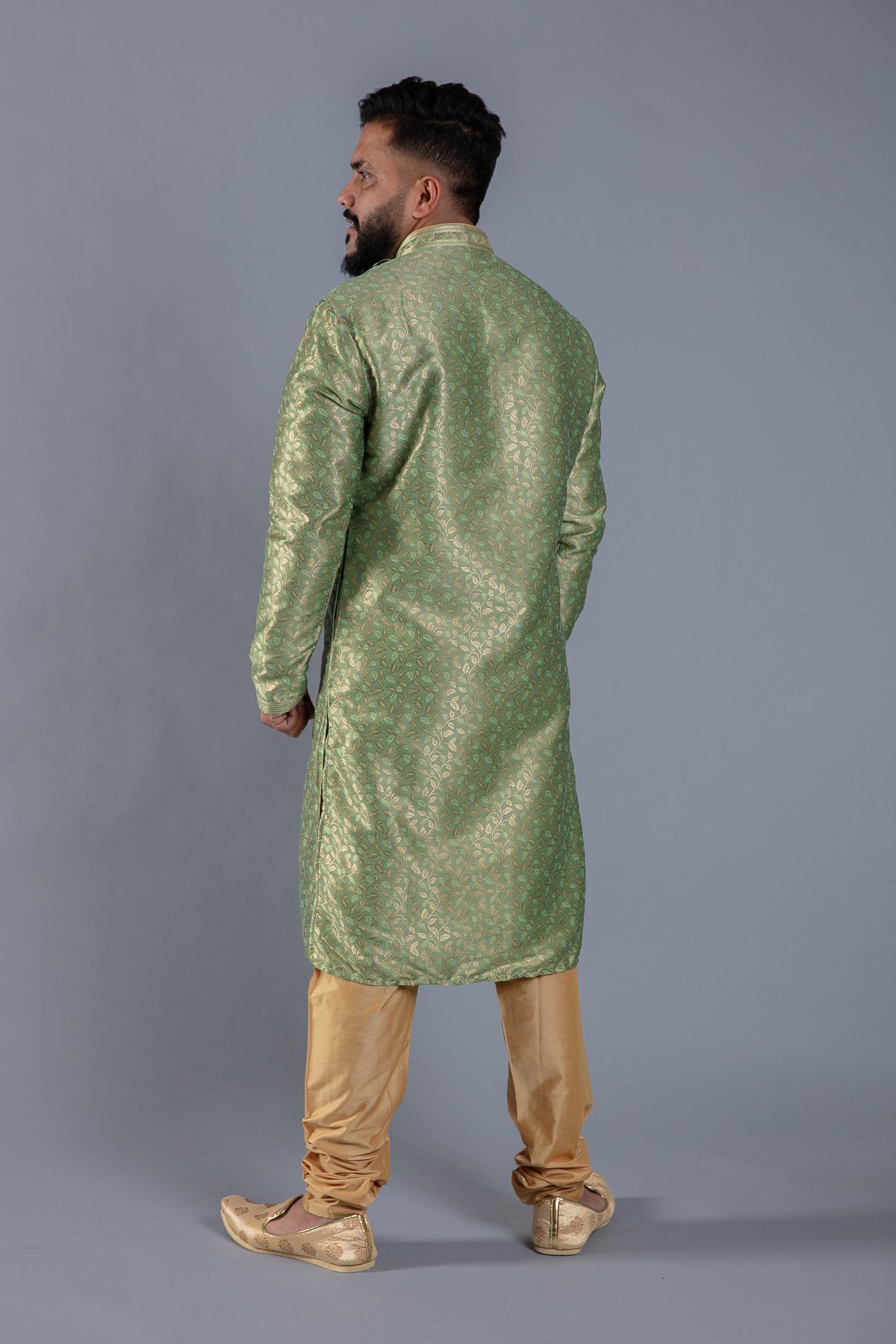 This beautiful 2 piece men’s suit features a banarsi printed kurta with button embellishments on the front along with an embroidered collar. The look is finished with a dupion silk churidaar.
