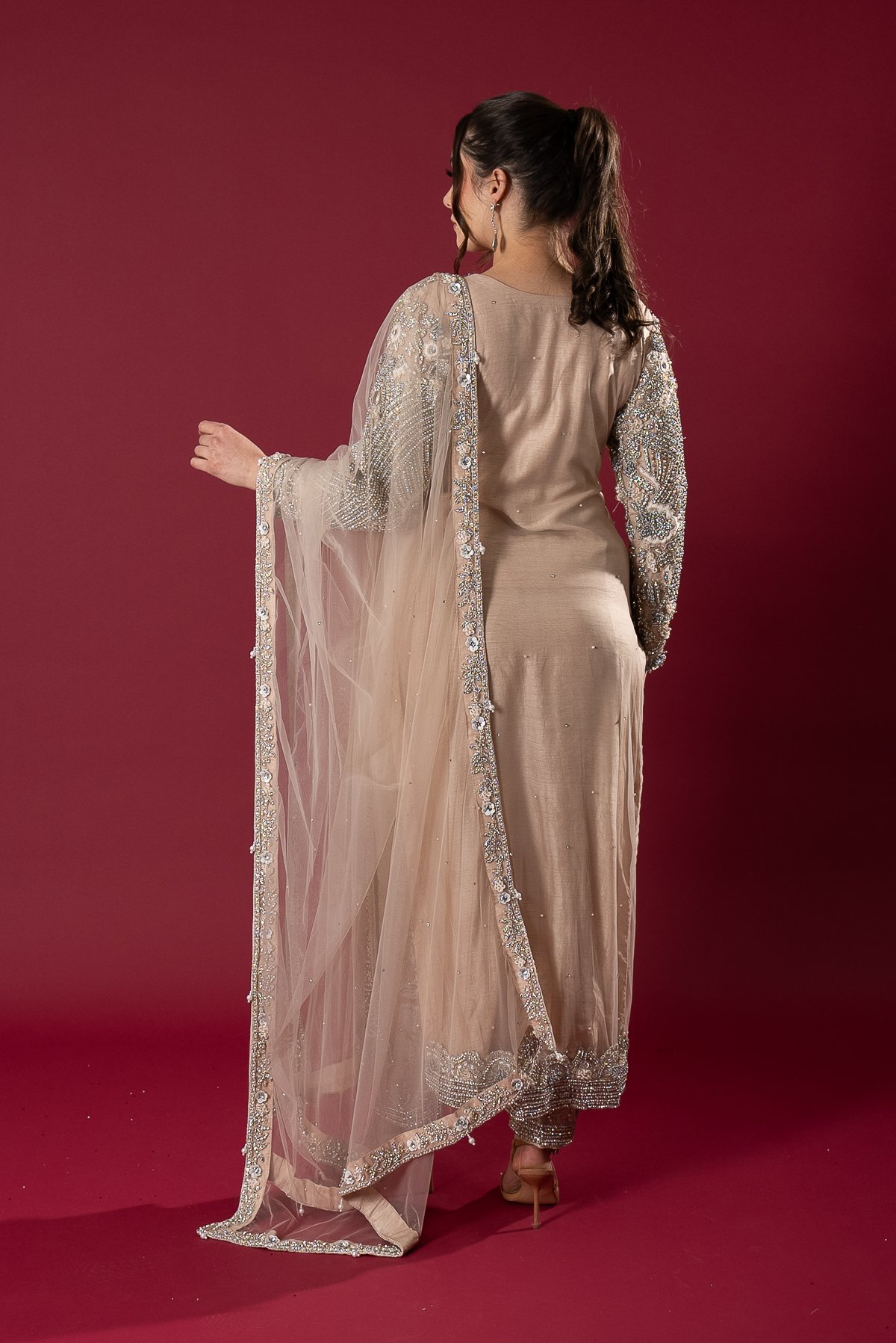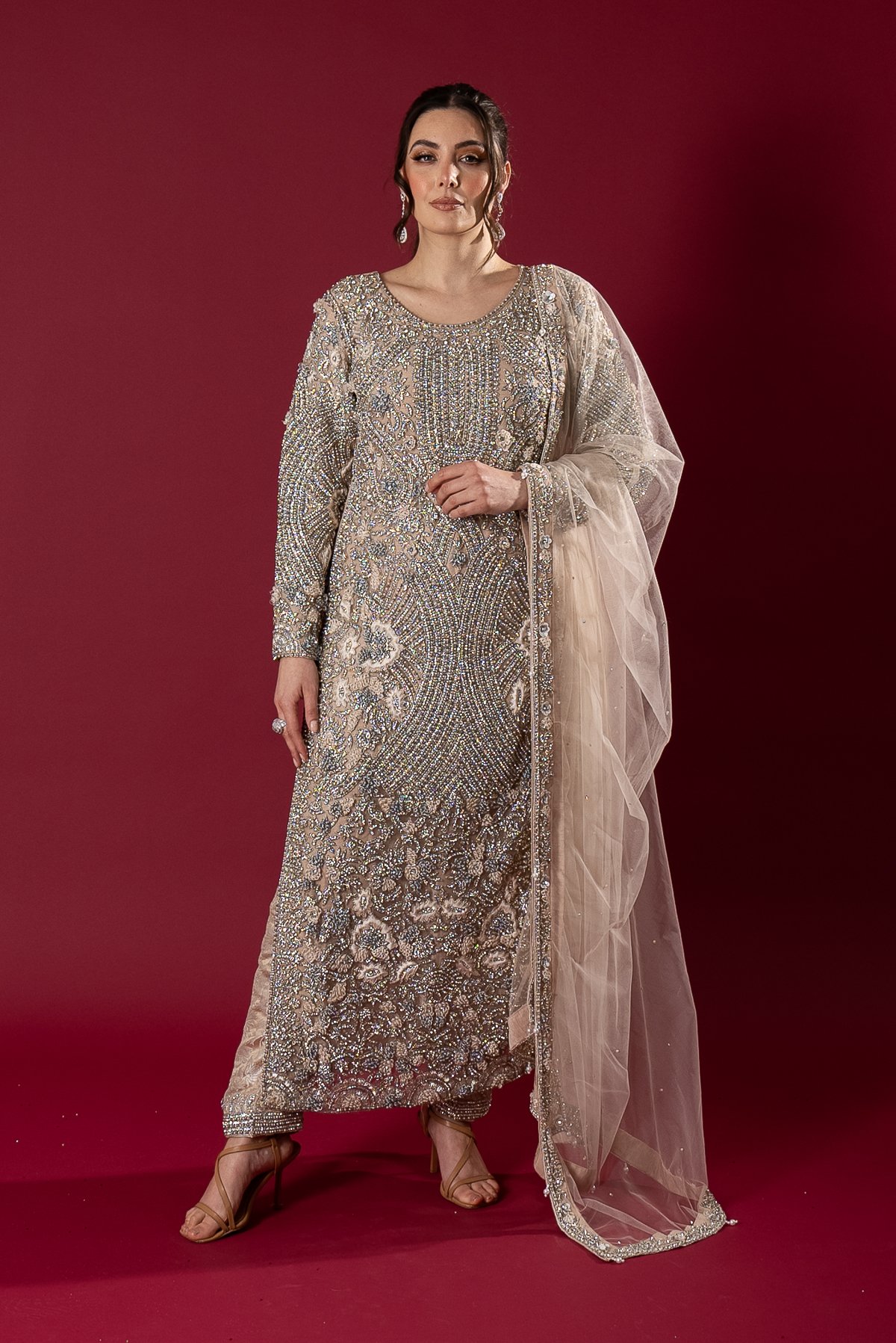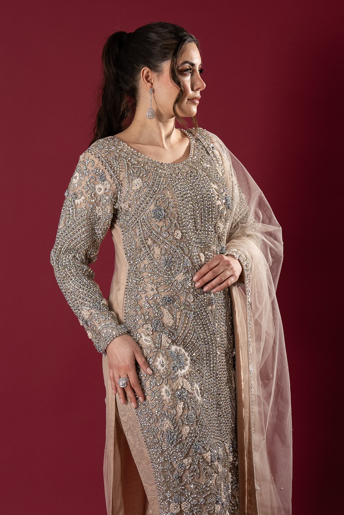This beautiful 3 piece chiffon suit features a long length shirt with luxury beaded embroidery throughout with full length embroidered sleeves. It comes with banarsi straight leg trousers with an embroidered border and the look is finished with an organza embroidered dupatta. Note: We can customize this suit on made on measure orders. Please visit our branch for further consultation.