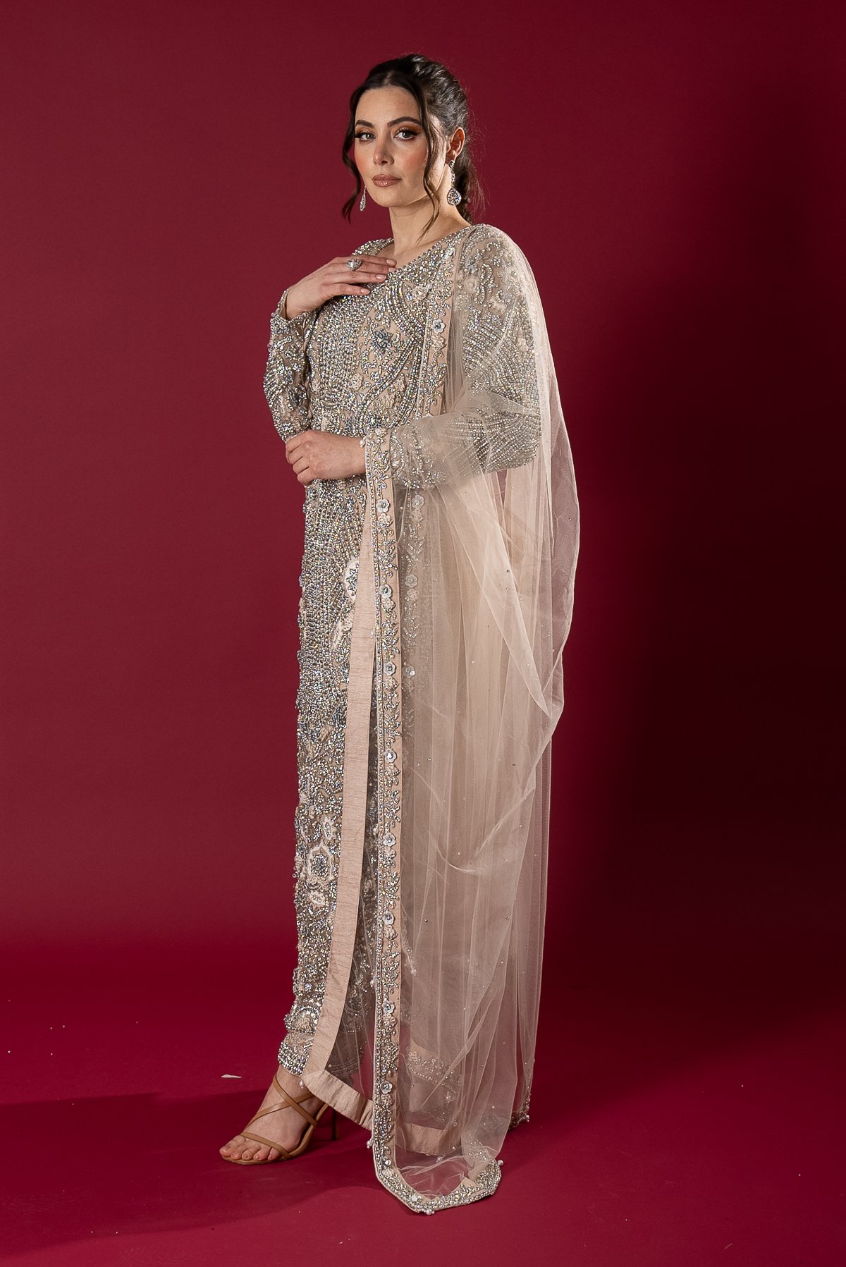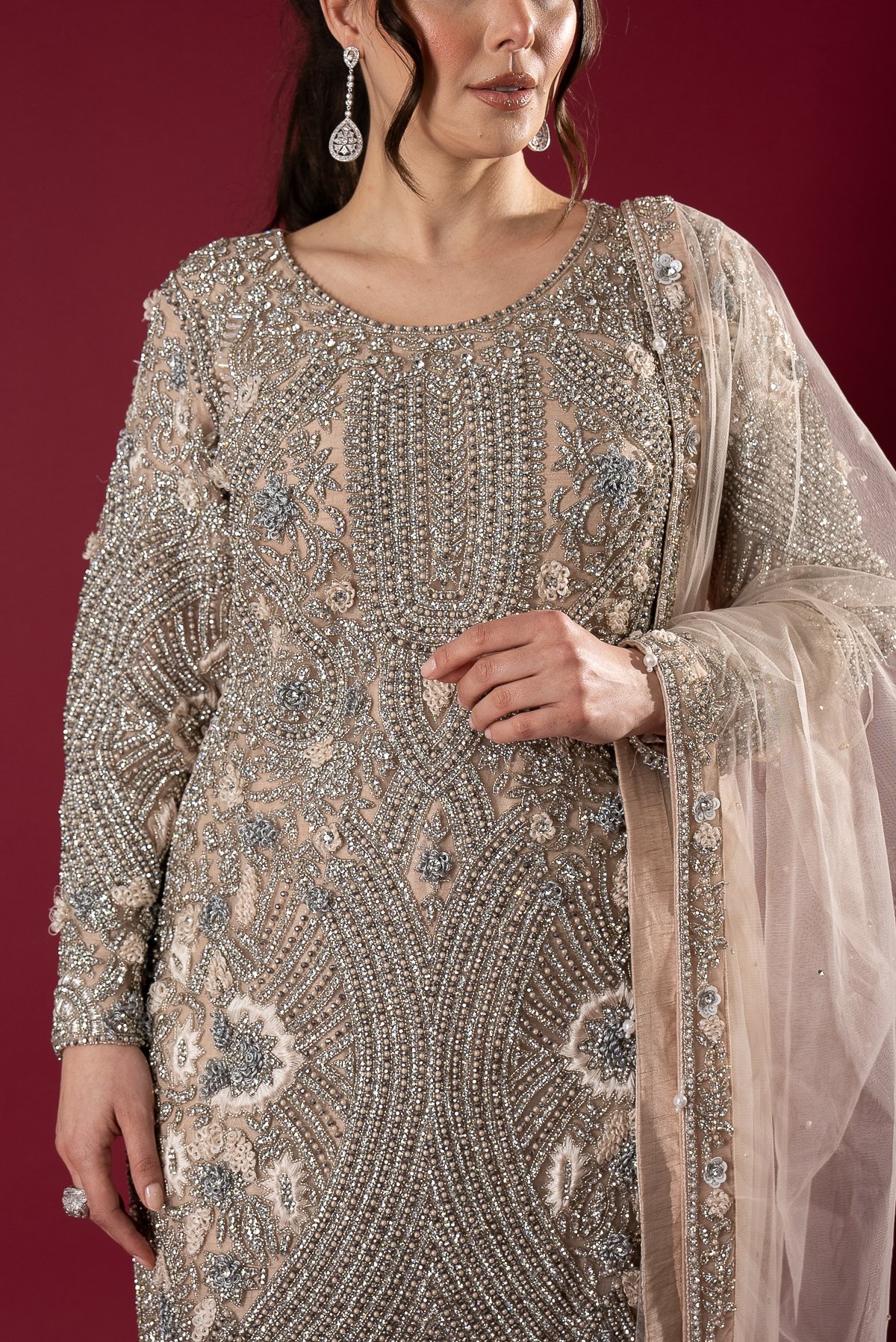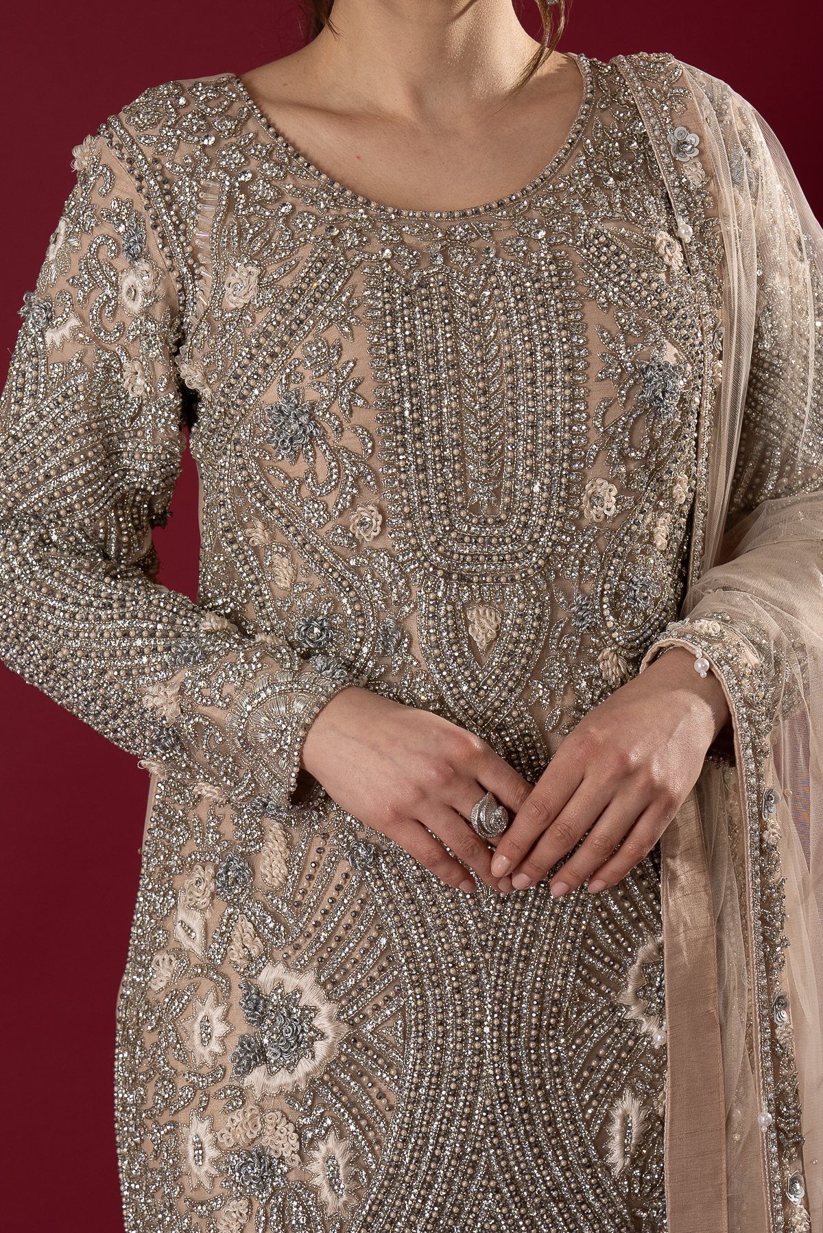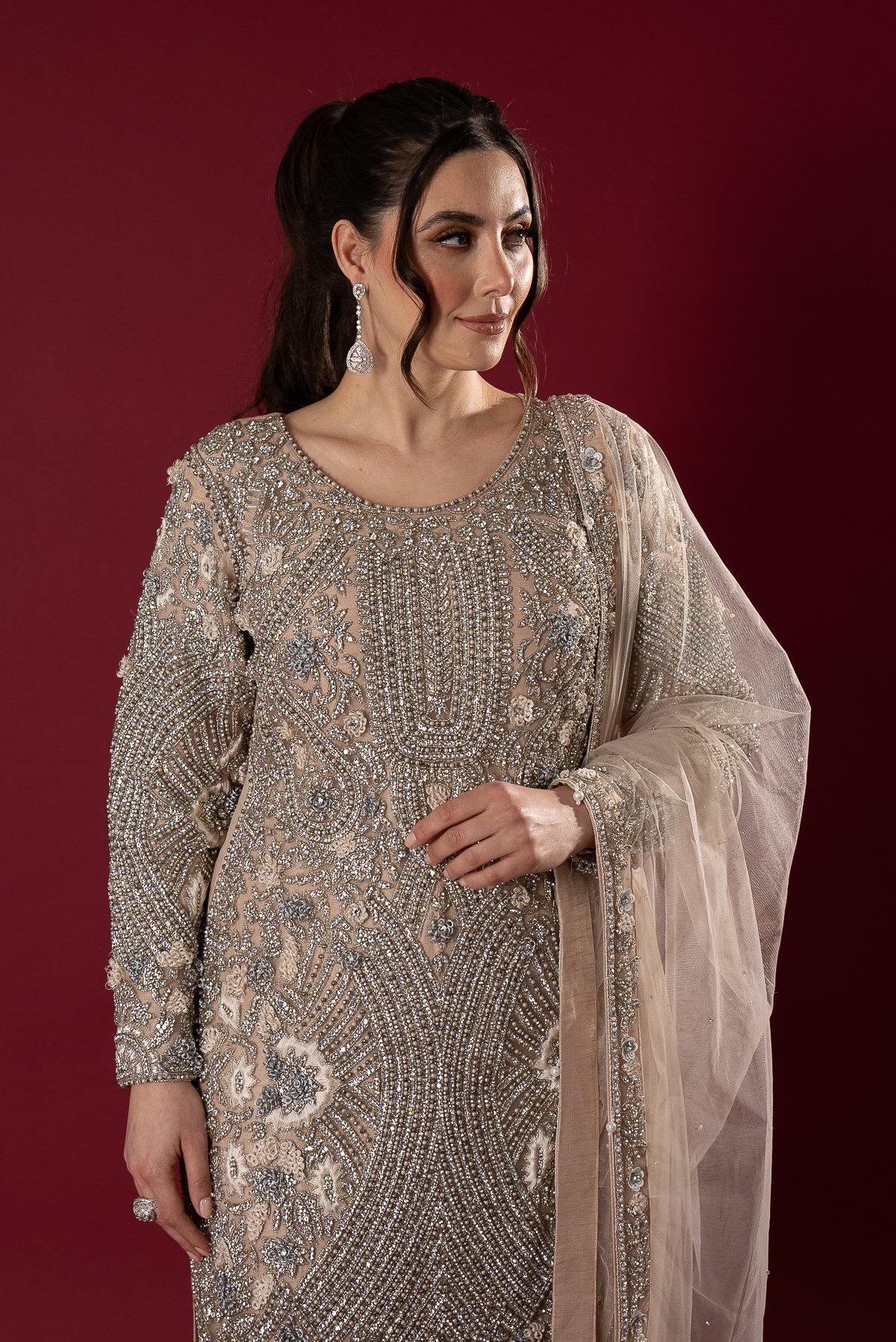 This beautiful 3 piece chiffon suit features a long length shirt with luxury beaded embroidery throughout with full length embroidered sleeves. It comes with banarsi straight leg trousers with an embroidered border and the look is finished with an organza embroidered dupatta. Note: We can customize this suit on made on measure orders. Please visit our branch for further consultation.
