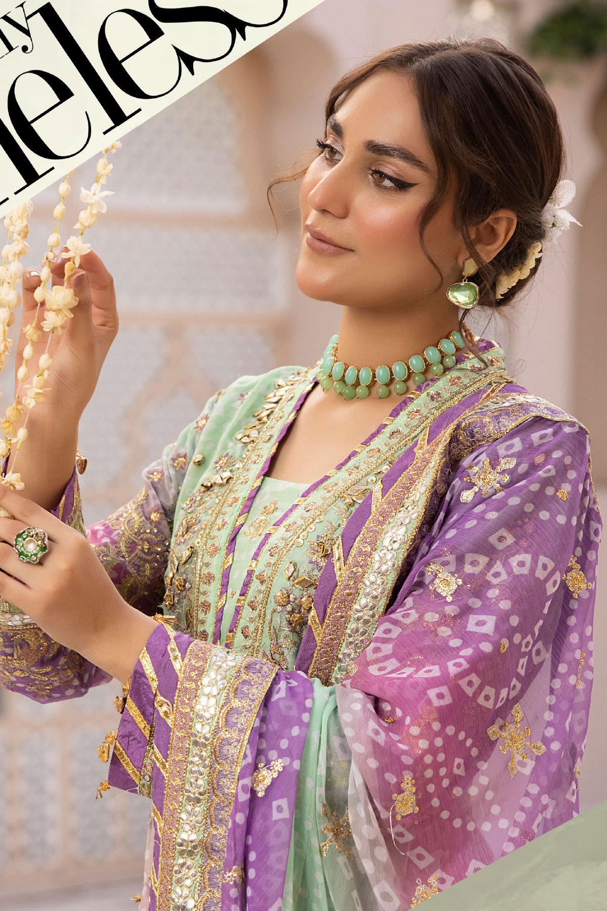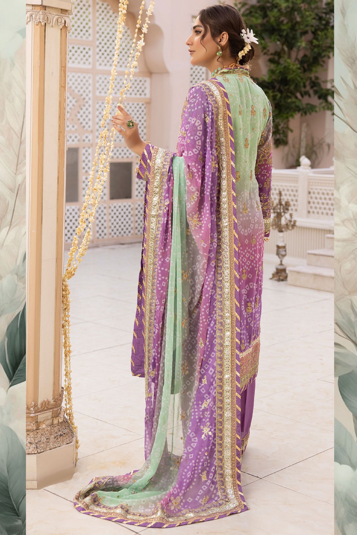 This beautiful baroque inspired 3 piece chiffon suit features a straight chunri printed shirt with luxury gotta. sequins and thread work embellishments. finished with dangling tassels on the border. It comes with full length embroidered sleeves and wide leg contrasted trousers. The look is finished with a luxury embroidered chiffon dupatta.