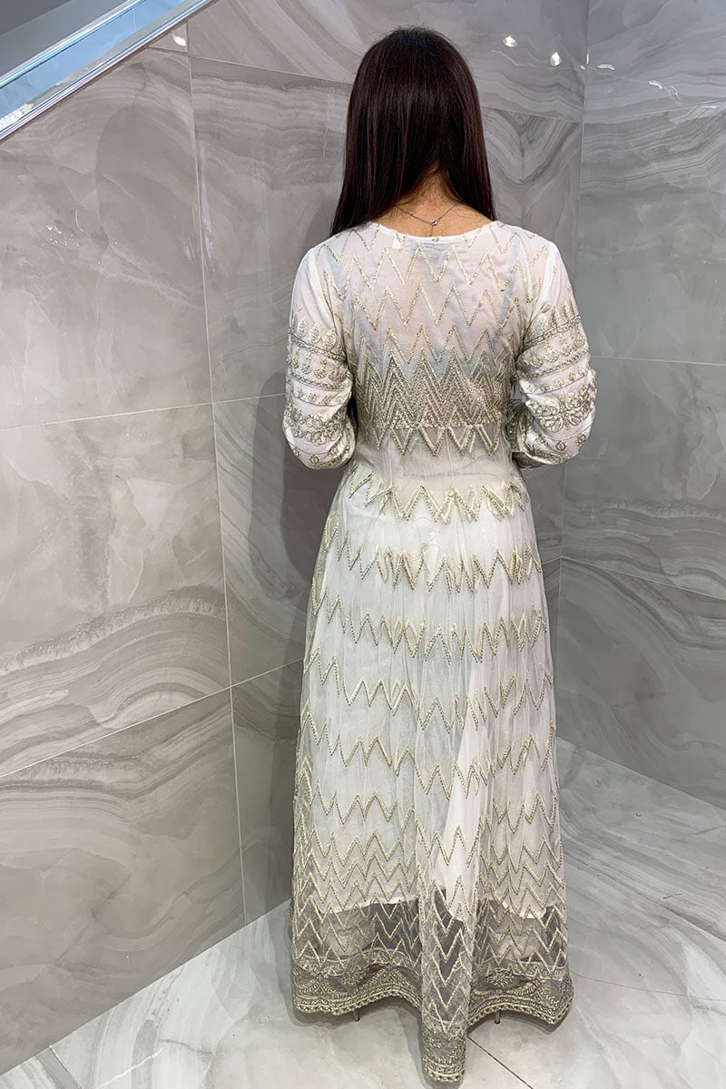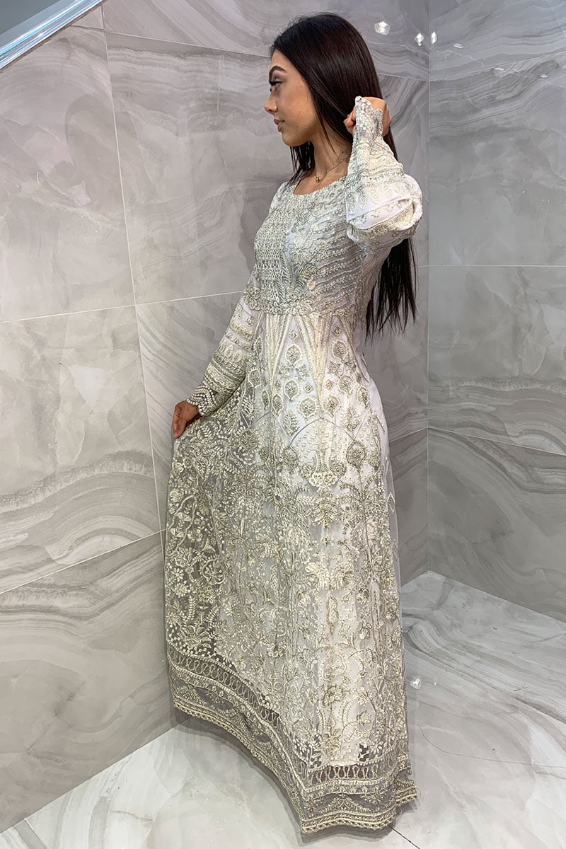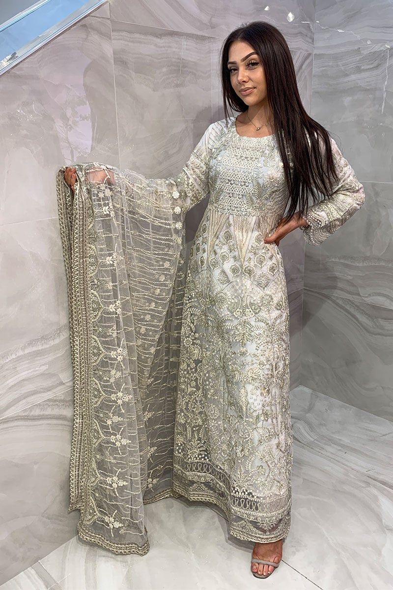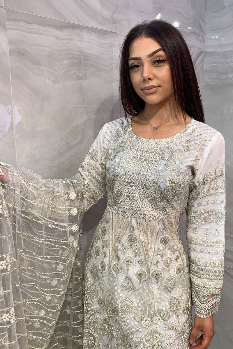 This beautiful 3 piece Baroque suit features a long peplum dress with luxury thread work embroidery throughout the front and back with scattered diamantes. It comes with full length embroidered sleeves and straight leg crepe trousers. The look is finished with an embroidered organza dupatta.